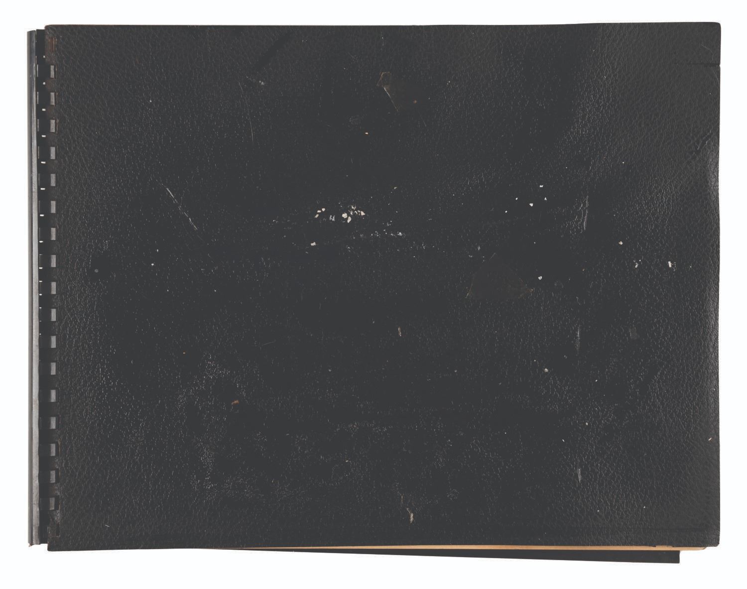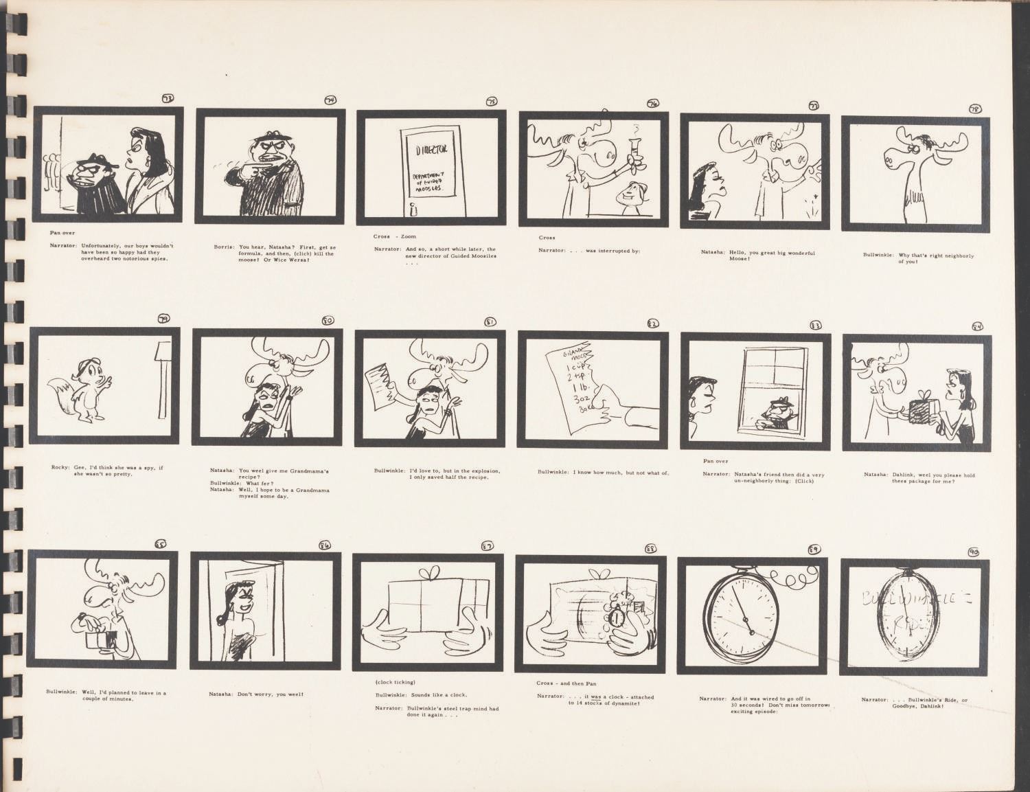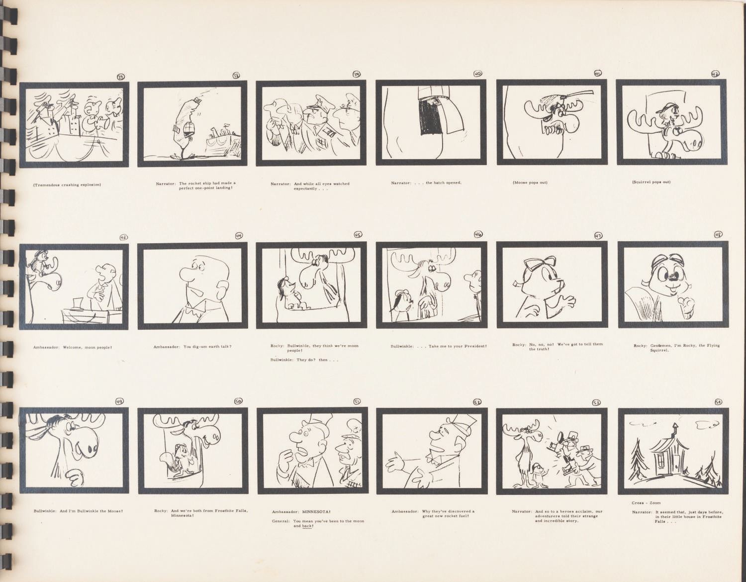 (Ward, 1959) A complete storyboard book for the very first “Rocky and Bullwinkle” cartoon. Jay Ward often used books like these to present and shop projects to sponsors and networks. Printed in black ink on five pressboard pages and spiralbound with a leather cover, the book measures 11” x 14” and is in good condition with light edge wear and soiling, a 0.25” section missing from the bottom plastic binding ring, and light discoloration from age.