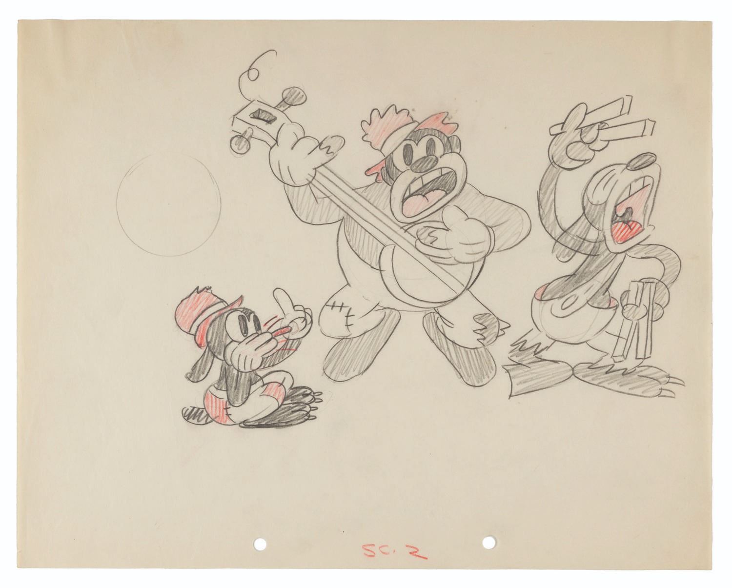 (Harman-Ising, 1931) An original storyboard drawing by Bob Clampett from the Merrie Melodies short “Hittin’ the Trail for Hallelujah Land,” the first cartoon in the infamous "Censored Eleven." Accomplished in graphite and colored pencil, the drawing features a trio of hobos as they perform the titular song. Measuring 9.5” x 12” with an image size of 6.5” x 9”, the drawing is in fine production-used condition with light discoloration from age