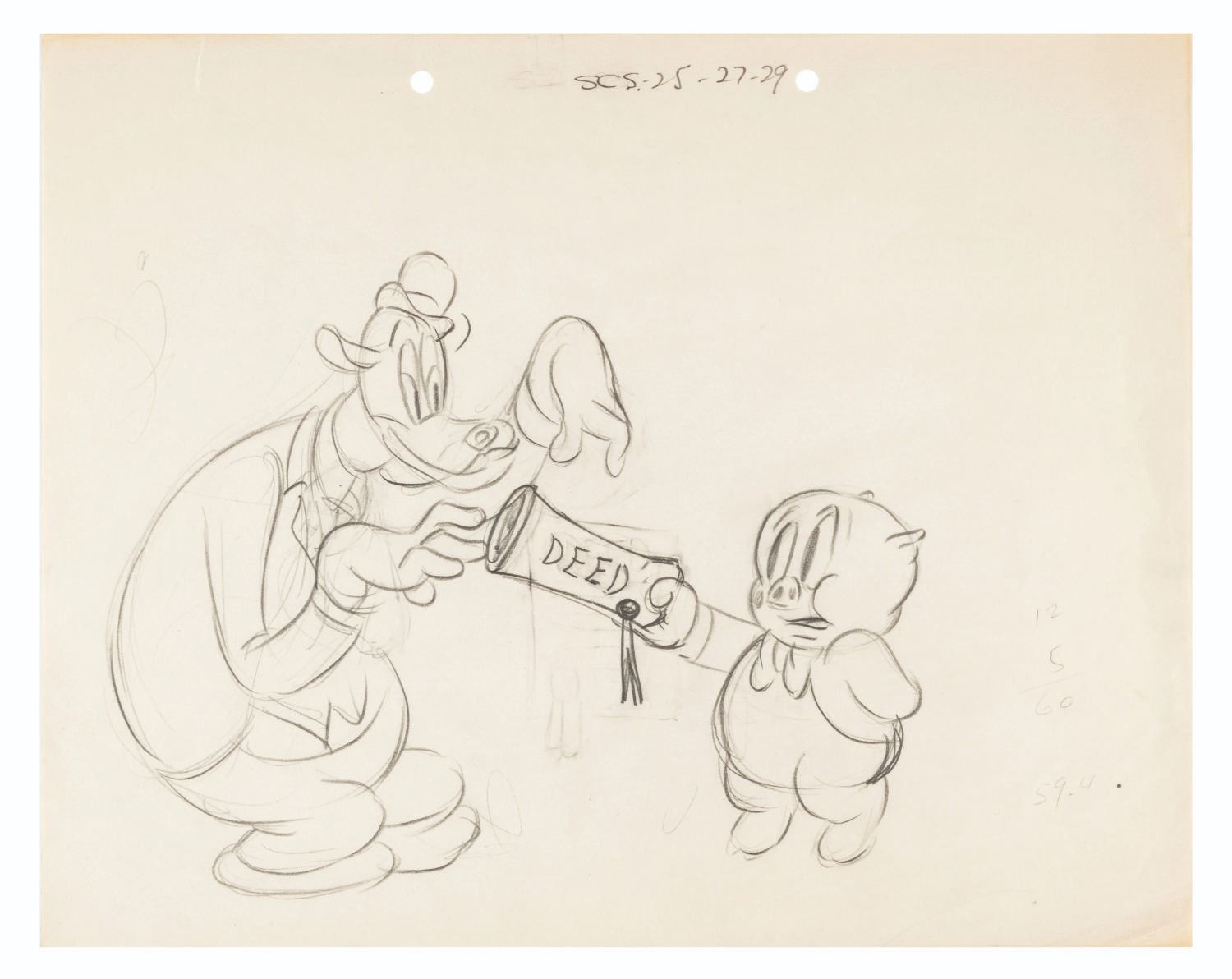 (Schlesinger, 1937) An original storyboard panel of Porky and Honest John from the Looney Tunes short “Get Rich Quick Porky,” directed by Bob Clampett. Accomplished in graphite and measuring 9.5” x 12” with an image size of 6.5” x 8.5”, the drawing is in very good production-used condition with light creasing, edge wear, a small 0.5” rip to the top left edge, and light discoloration from age.