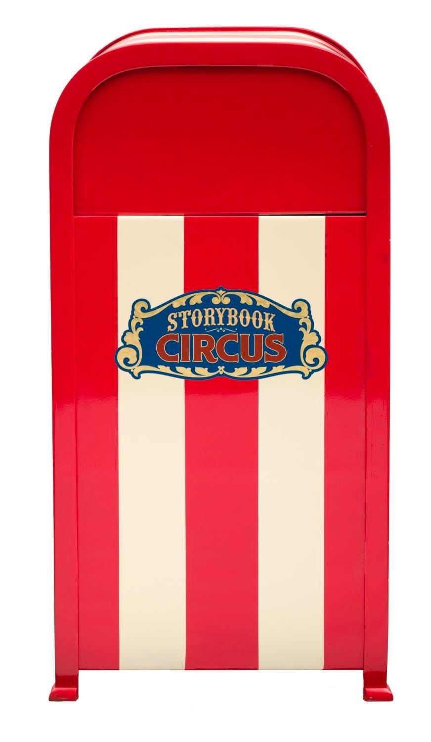 (Walt Disney World, 2010s) An original metal trash can from Storybook Circus at Walt Disney World. The Storybook Circus section of Fantasyland opened in 2012, replacing Mickey’s Toontown Fair, and features Dumbo the Flying Elephant, The Barnstormer, and Casey Jr. Splash ‘n’ Soak Station. This red- and white-striped trash can has its original push panels still intact and they work properly. Measuring 21.5” x 42.5” x 20.25” deep, the trash can displays in fine condition with light scratches including a 3.5” scratch on top and wear from Park use. This item may require special shipping arrangements. Please inquire before bidding.
