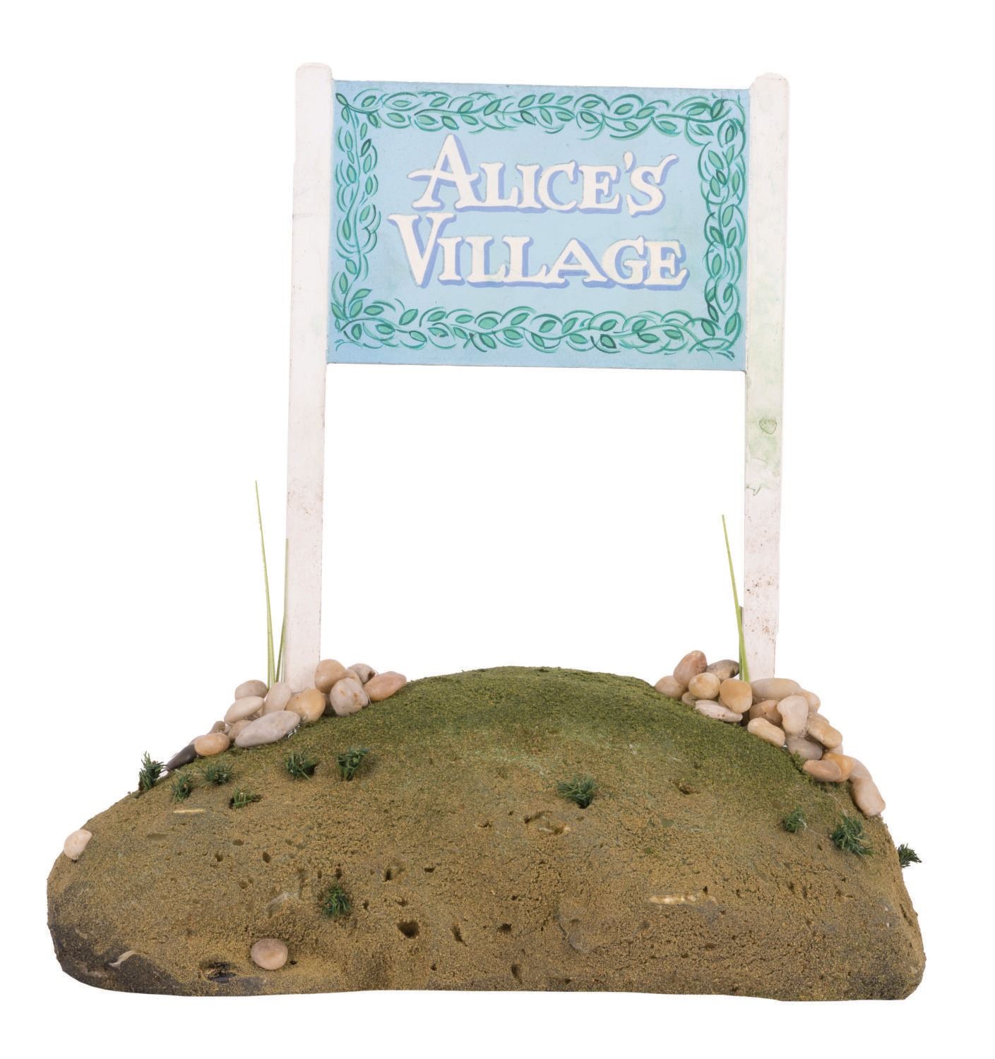 (Disneyland, 1990s-2000s) An Alice's Village sign from the Storybook Land canal Boats attraction in Fantasyland at Disneyland. This hand painted wooden sign prop once marked the location of the "Lilliputian" Alice's Village and White Rabbit Hole to Wonderland. The piece was removed during a previous rehabilitation of the attraction and comes with a custom faux turf base to complete the display. Measuring 7"x11.25", the sign is in very good condition with stains, scuffs, scratches, spots of discoloration and wear from Park display, handling, and age.