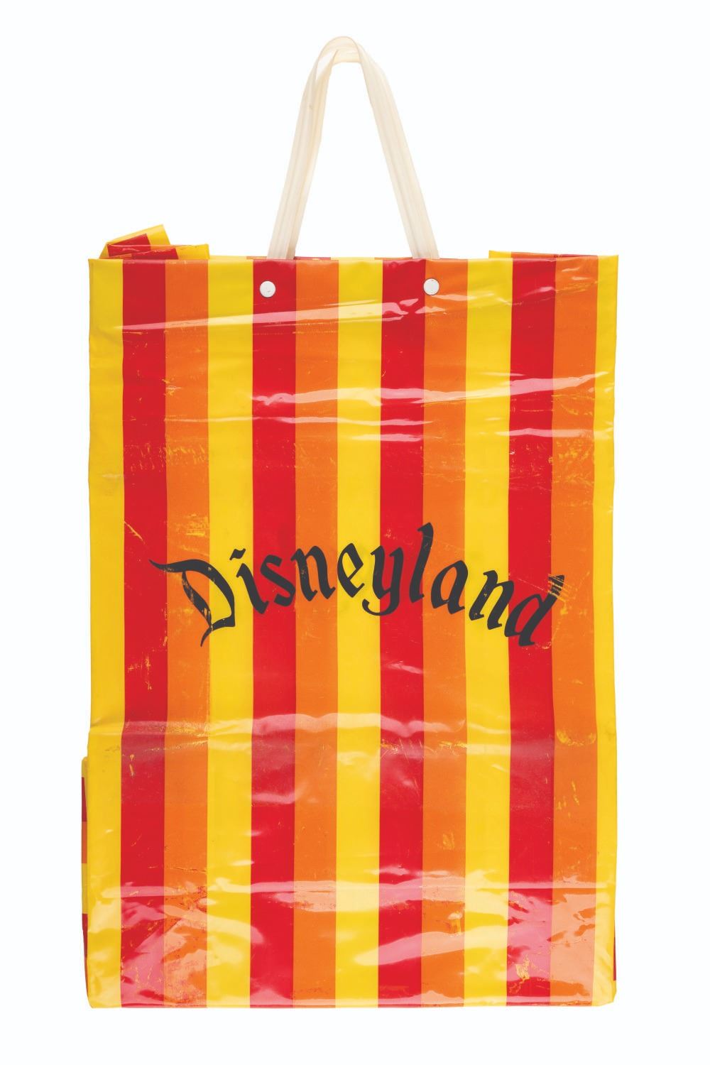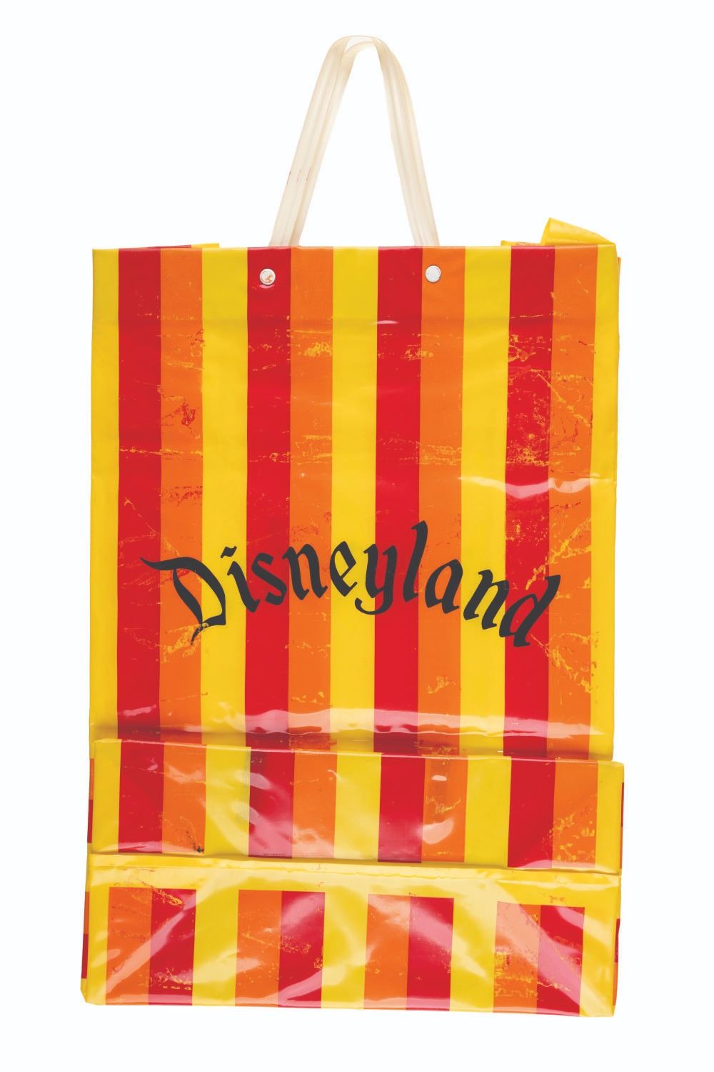 (Disneyland, 1960s-70s) A colorful striped plastic Disneyland shopping bag with handles. Measuring 12” x 20” including handles, the bag is in fair condition with scuffs, and some transfer of colors from water contact.