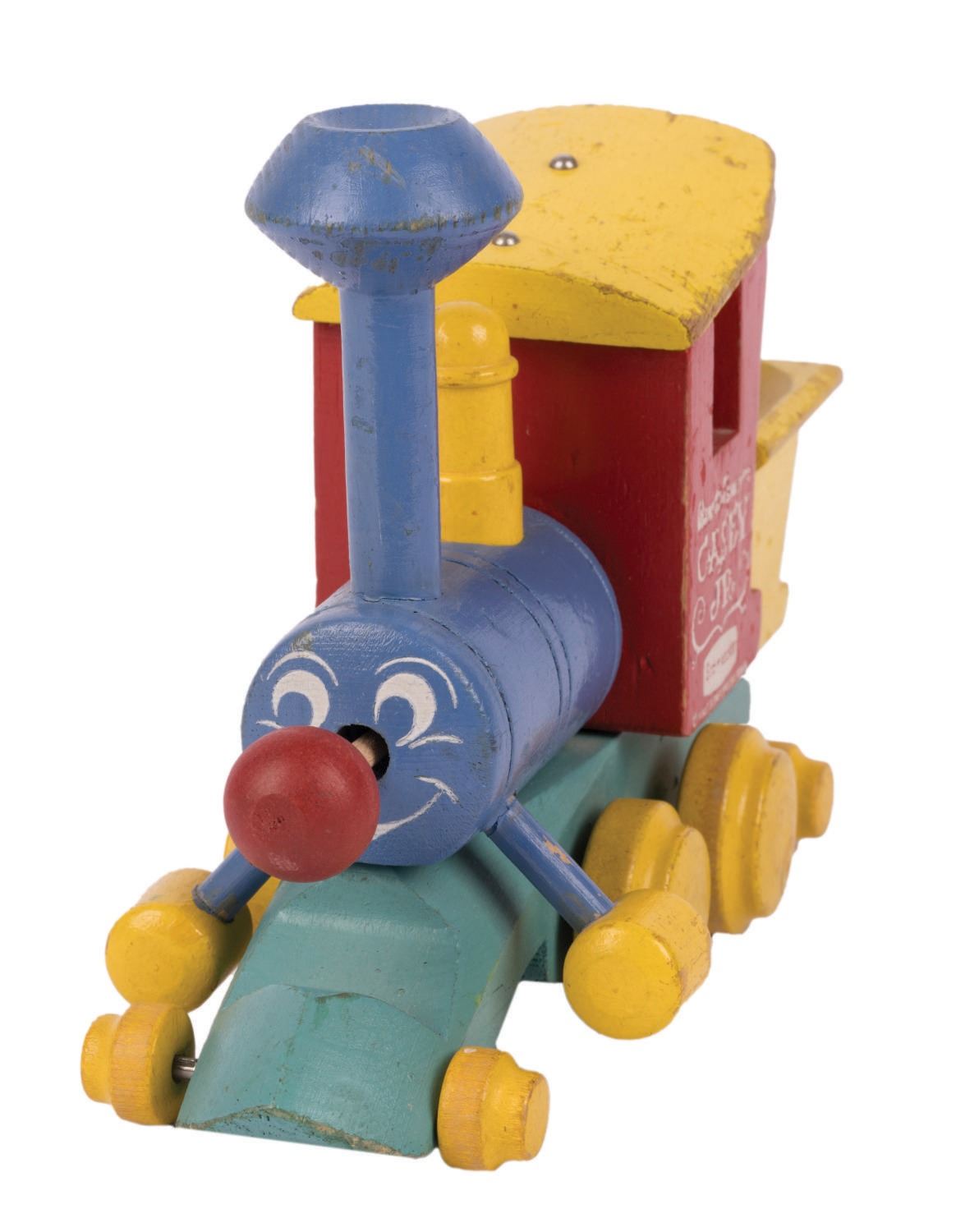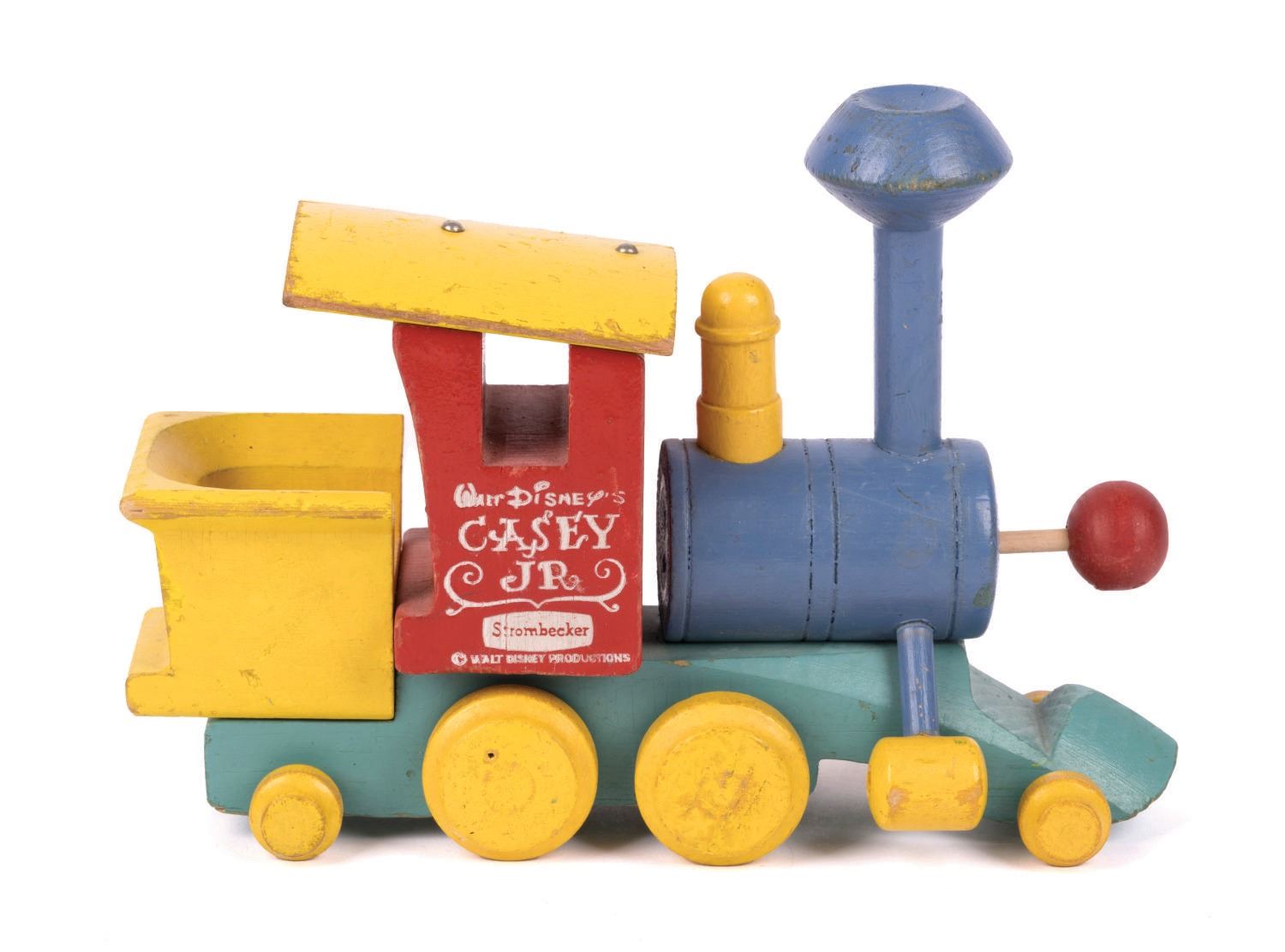 (Strombecker, 1950s) An extremely rare "Walt Disney's Casey Junior Locomotive" toy manufactured by Strombecker. During the 1950s, Strombecker began to produce toys based on Walt Disney's characters and forthcoming Disneyland Park. Two editions of this toy was released and this is the version without a bell. Measuring 5.5" tall, 7.5" long, and 3.5" wide, this rare wooden toy is in remarkably good condition with some scuffs, chips to paint, and expected wear from handling and age.