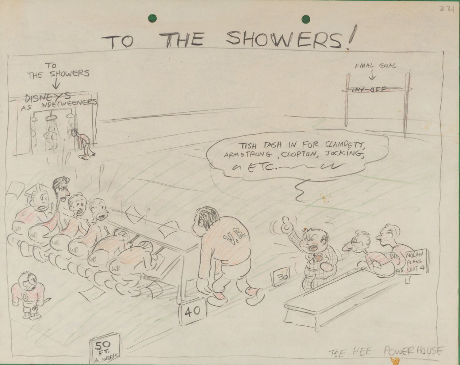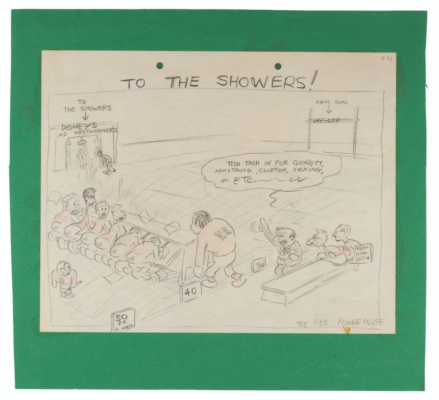 (Hee, 1935) A studio gag drawing by T. Hee, expressing his and fellow animators’ fears of losing their jobs after the arrival of Frank Tashlin at Leon Schlesinger Productions. This drawing was featured in the 1975 documentary film “Bugs Bunny: Superstar.” Accomplished in graphite and colored pencil, the 9.5” x 12” drawing is in good condition with an adhesive stain on the bottom right edge and light discoloration from age. It has been mounted to a piece of 12.75” x 13.75 construction paper in good condition with edge wear, creasing, adhesive stains, and a 0.25” tear along the top edge.