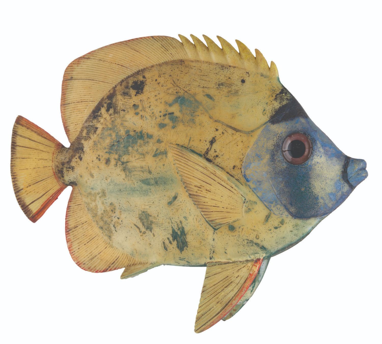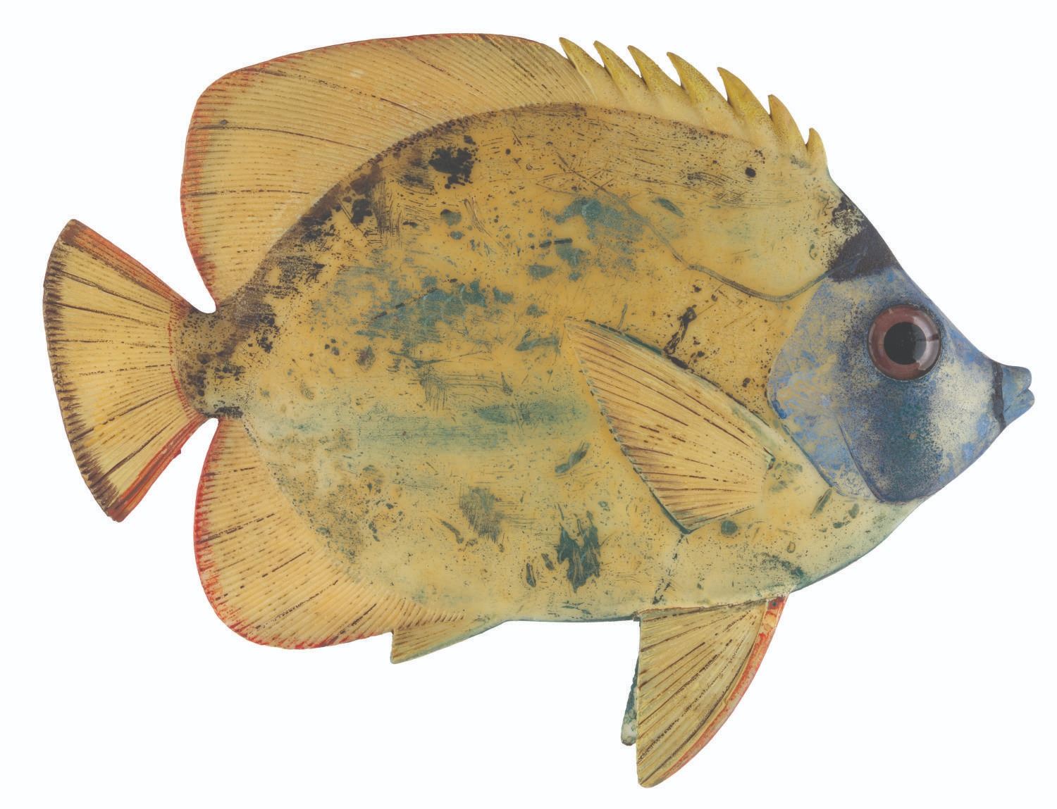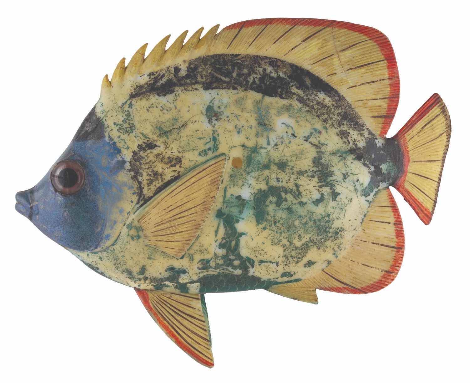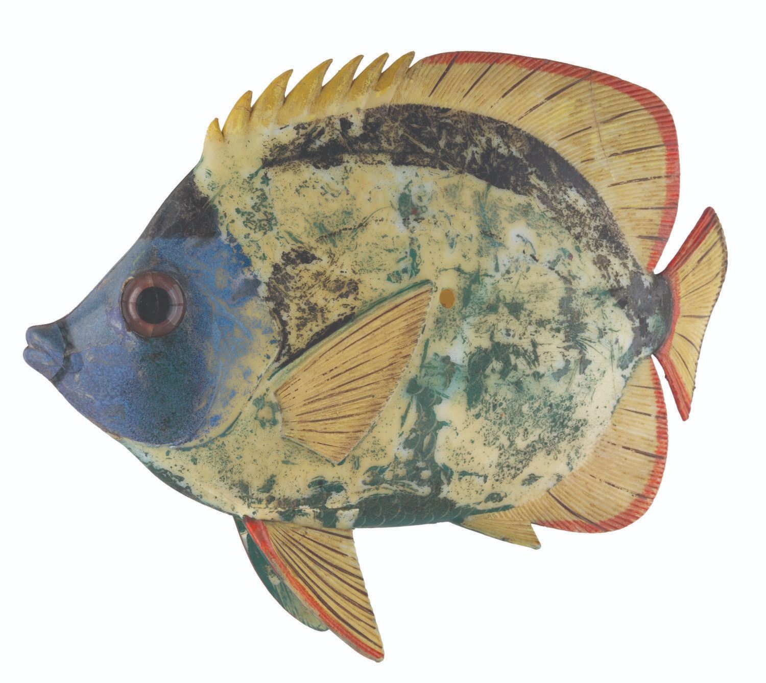 (Disneyland, 1960s-90s) A prop fish from Disneyland's Submarine Voyage in Tomorrowland. Constructed of hollow cast resin, the fish is hand-painted and features a mounting hole on the reverse for securing in place. Measuring 11.5" x 14.5", the prop is in fair to good, Park-used condition with heavy wear to the paint, soiling, discoloration, cracks to the vinyl, and scuffs.