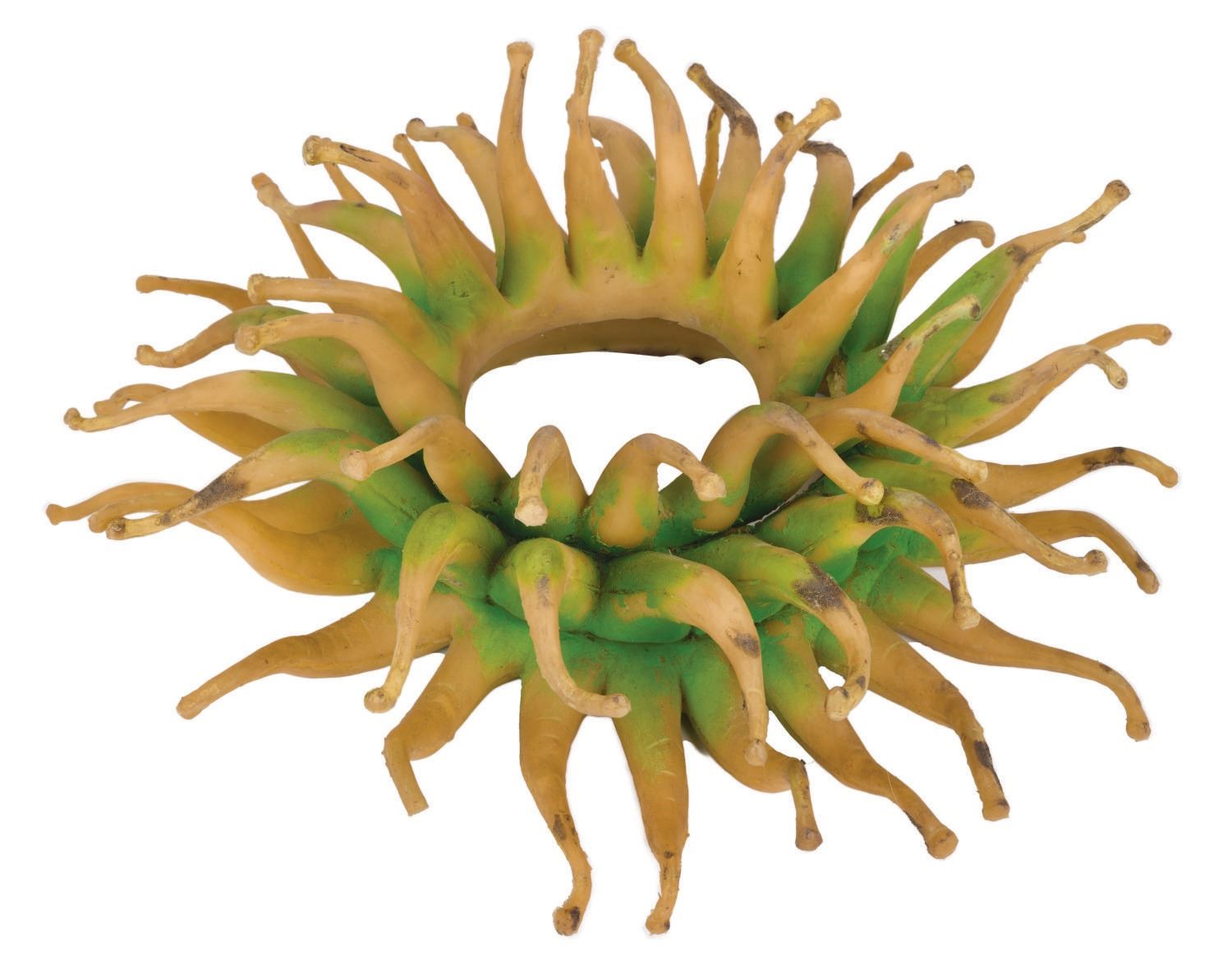 (Disneyland, 1960s-1998) An original static anemone prop used in the Submarine Voyage Through Liquid Space attraction in Tomorrowland at Disneyland. This prop was mounted within the depths of a Submarine Lagoon show scene and was removed during a repair, rehabilitation, or upon the adventure's closure in 1998. This hand painted, heavy rubber latex prop measures approximately 14" in diameter and 5.75" tall and is in fair-to-good condition with residue retention and wear to painted areas from Park-use, handling, and age.