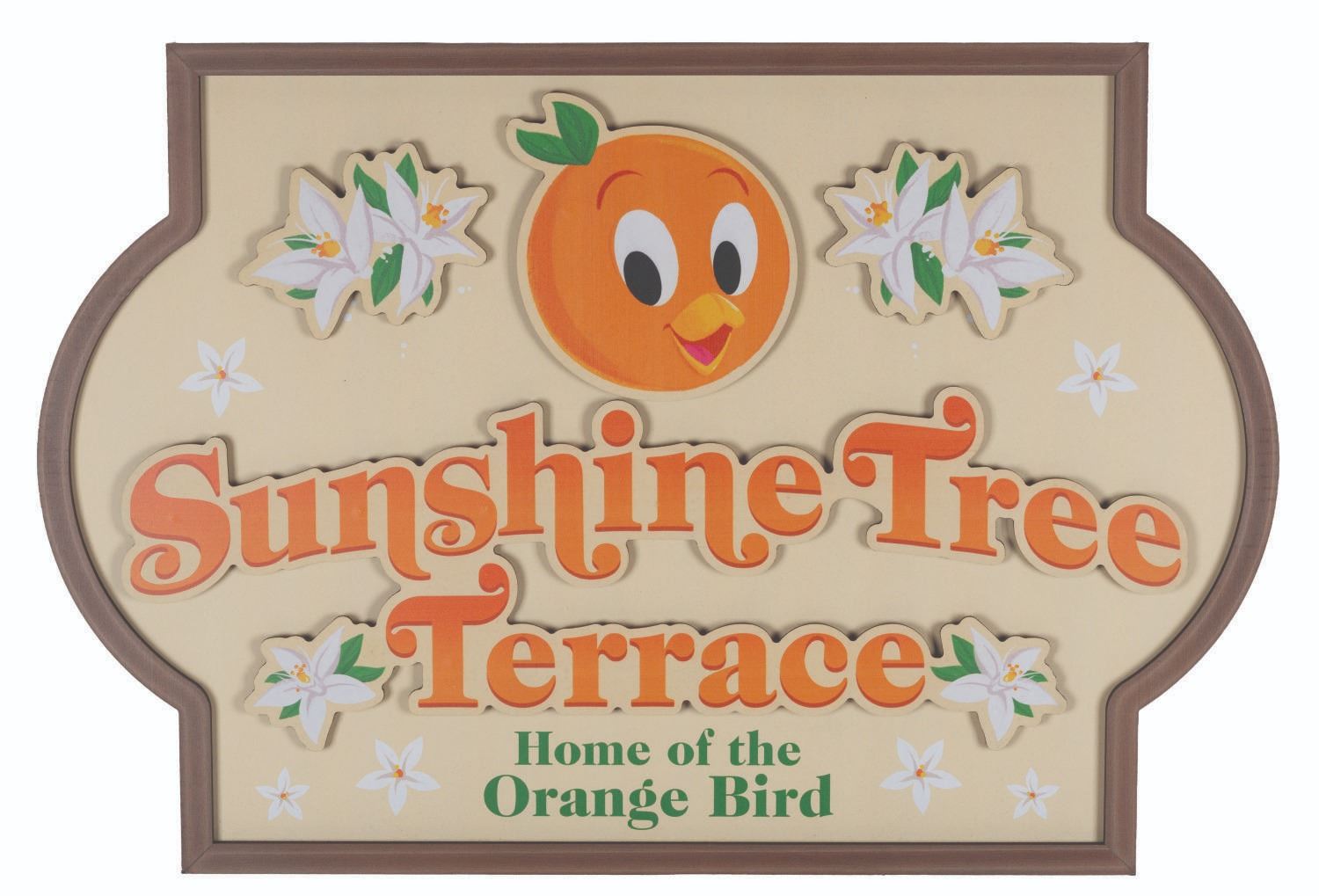 (Walt Disney World, 2020s) A souvenir replica of the Sunshine Tree Terrace sign, featuring the Orange Bird. The lovable mascot was created by the Florida Citrus Commission in 1971, which sponsored Walt Disney's Enchanted Tiki Room and Sunshine Tree Terrace. The character has experienced a resurgence in popularity, appearing on an increasing amount of Walt Disney World merchandise. Measuring 23.25" x 34.25", the sign is in very good condition with light wear.