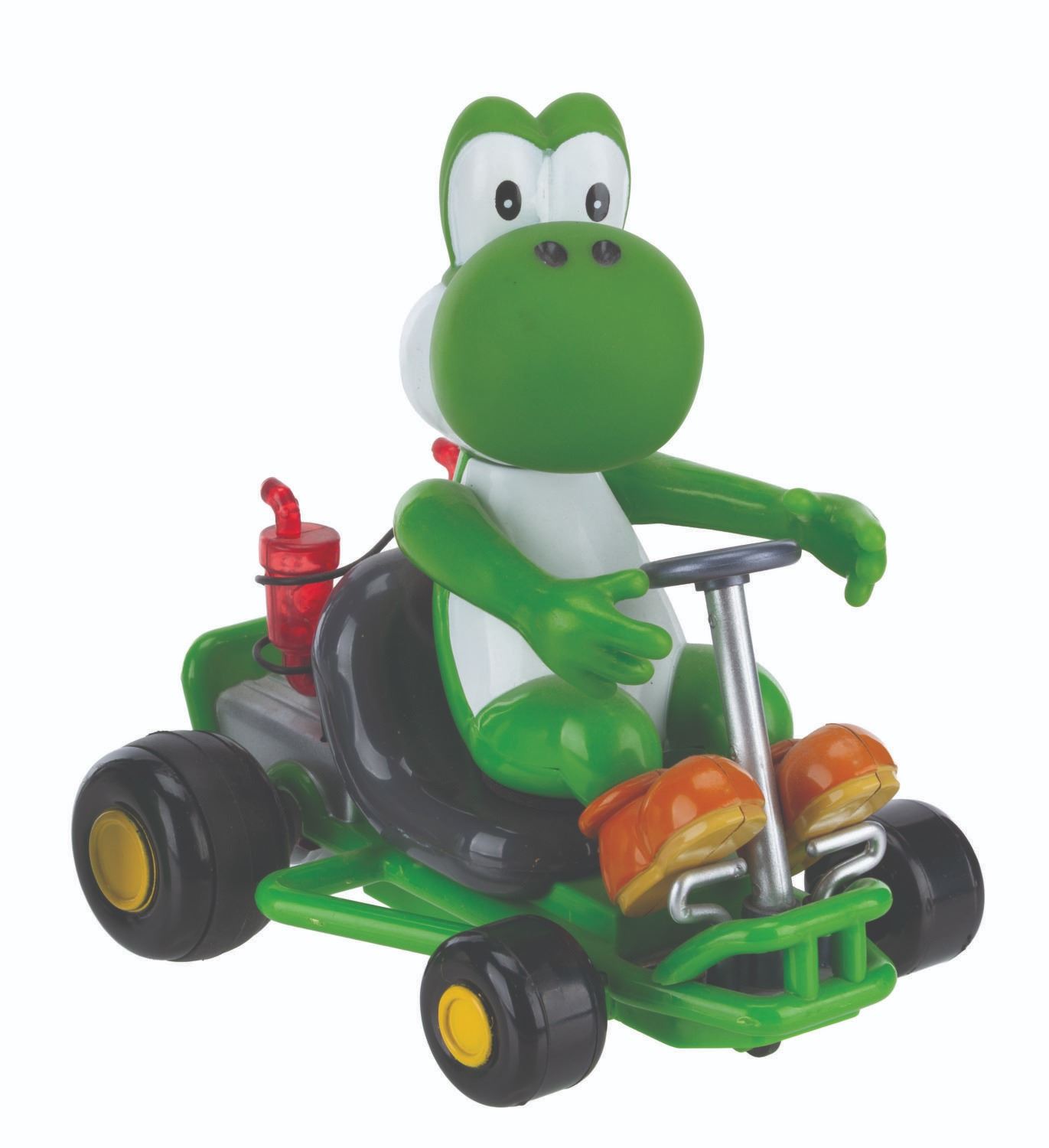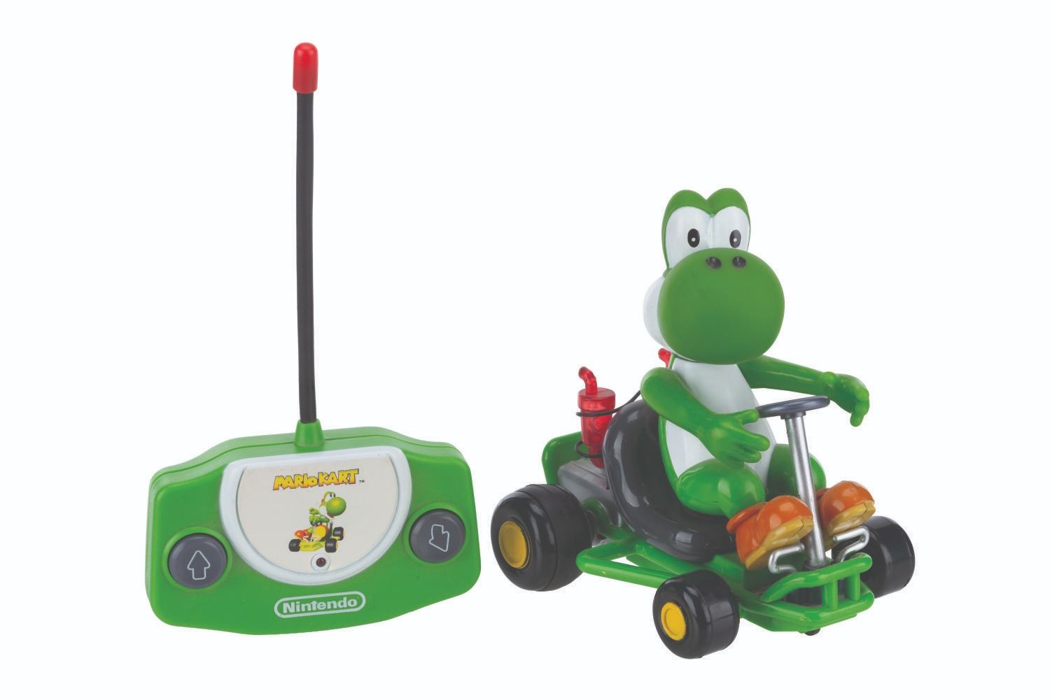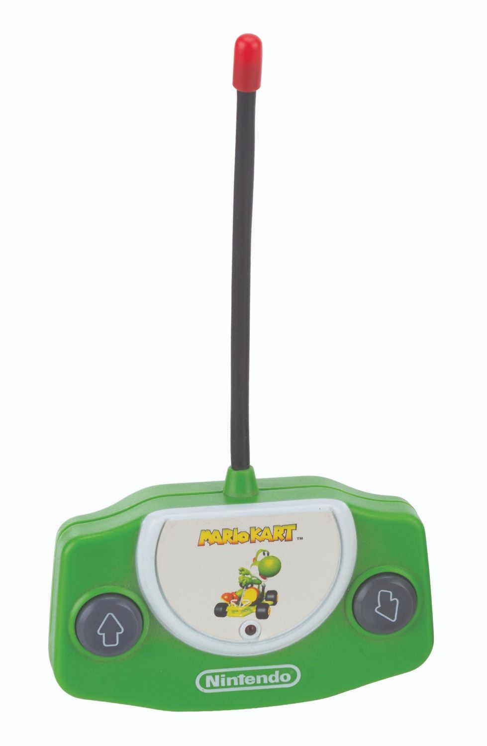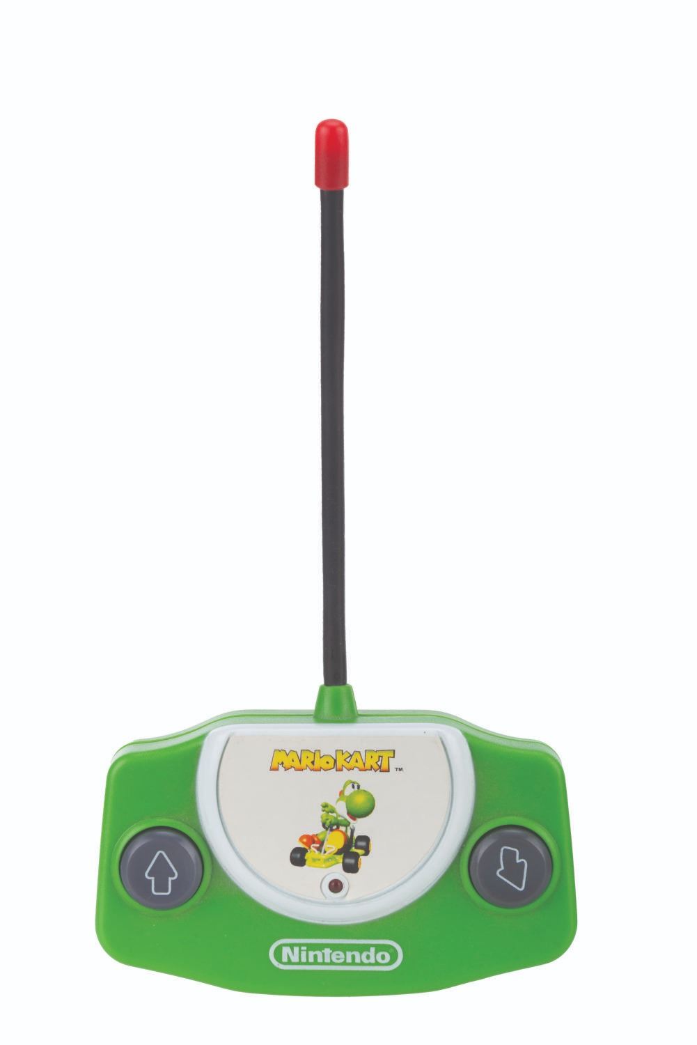 (NKOK, 2004) A Super Mario Kart Yoshi R/C car and remote by NKOK. Requiring 2 AA batteries and 1 9V battery (not included), the car worked when tested. Yoshi measures 5.25" x 4.25" x 5.25" tall and the remote 4.25" x 1" x 7.25" tall, displaying in very good condition with paint flaws on the eyes from production, spots of discoloration, and light wear, mainly on the tires.