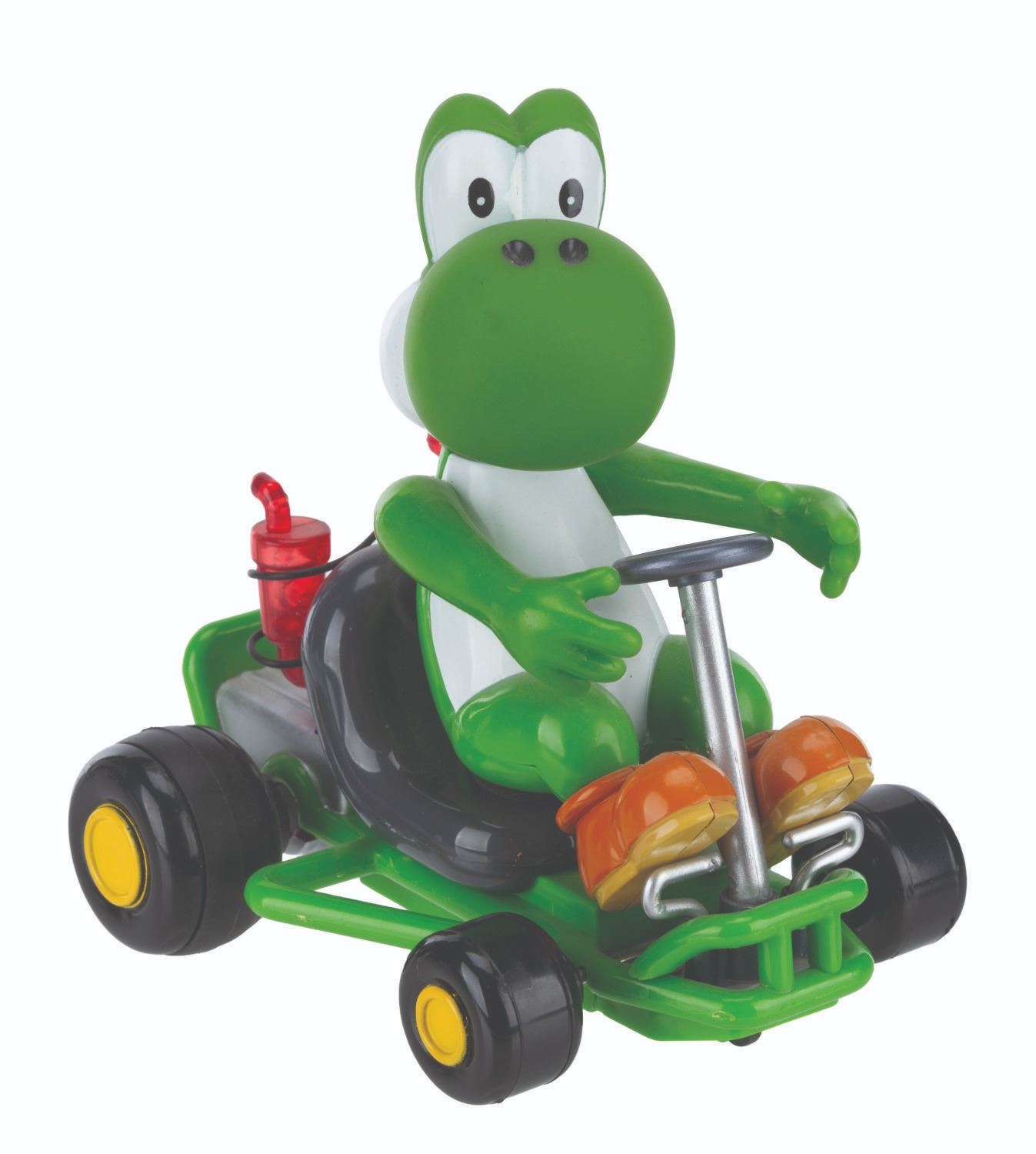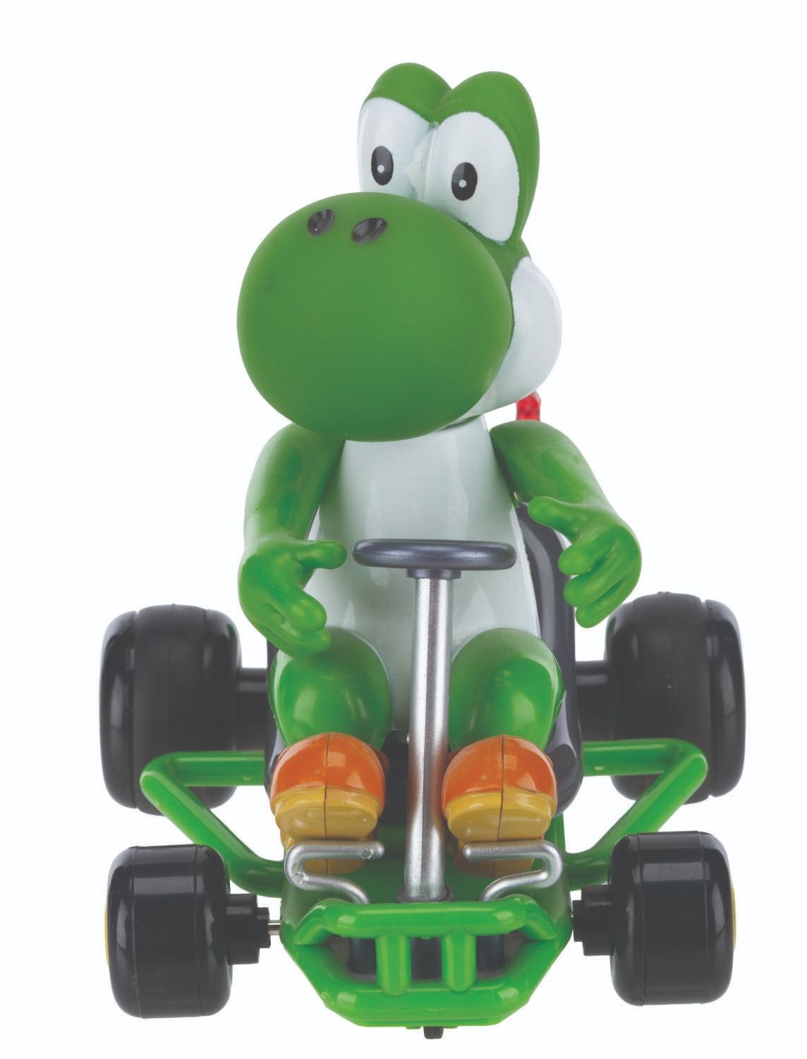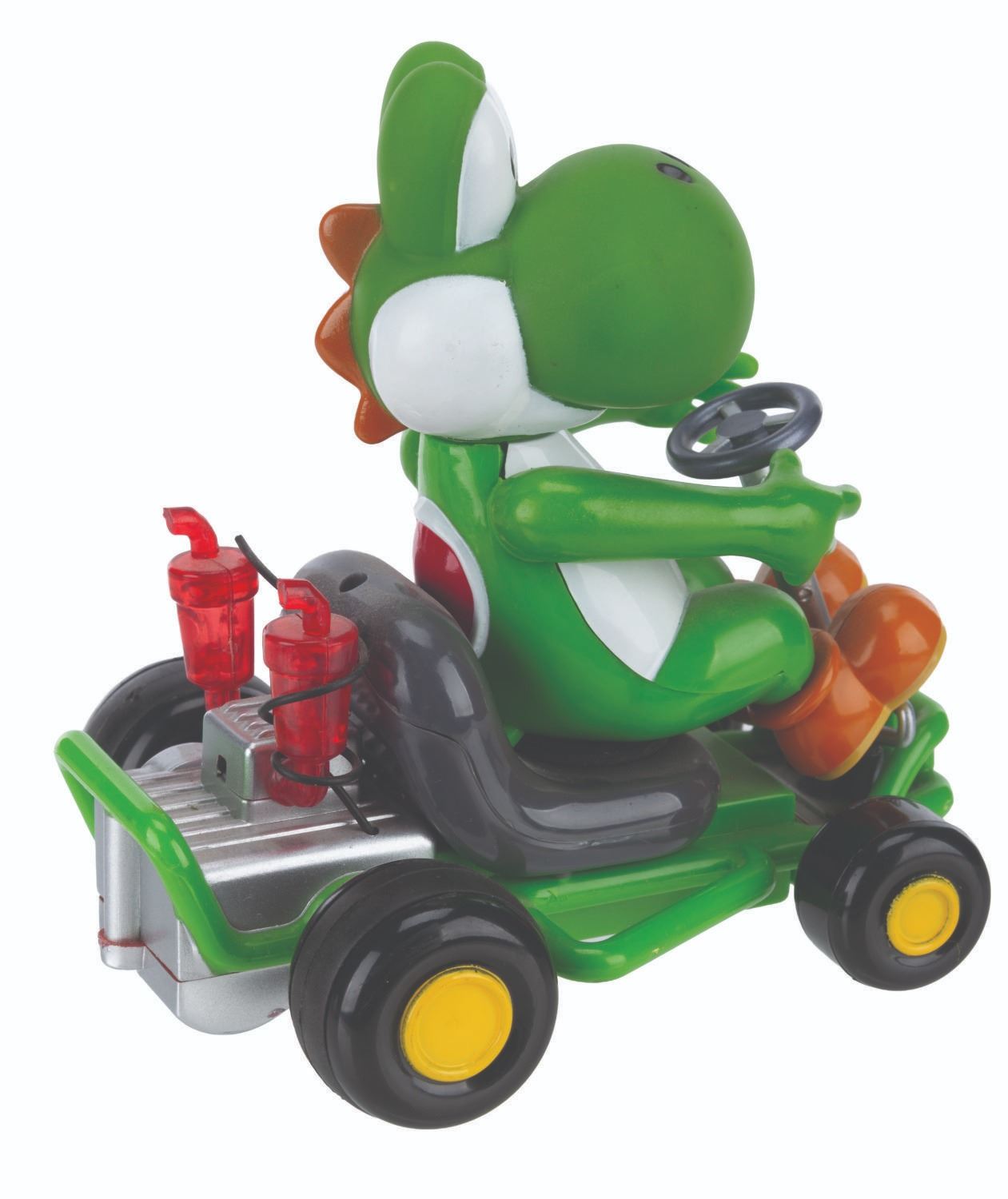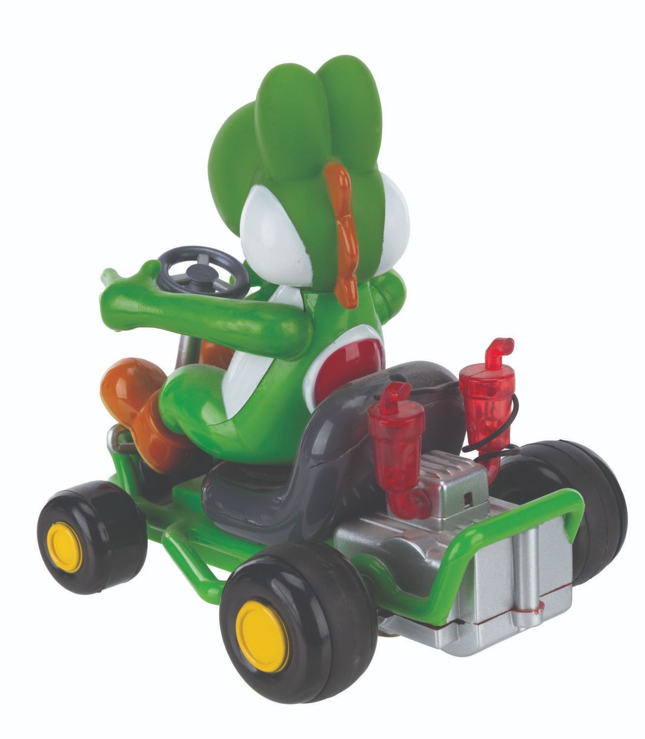 (NKOK, 2004) A Super Mario Kart Yoshi R/C car and remote by NKOK. Requiring 2 AA batteries and 1 9V battery (not included), the car worked when tested. Yoshi measures 5.25" x 4.25" x 5.25" tall and the remote 4.25" x 1" x 7.25" tall, displaying in very good condition with paint flaws on the eyes from production, spots of discoloration, and light wear, mainly on the tires.