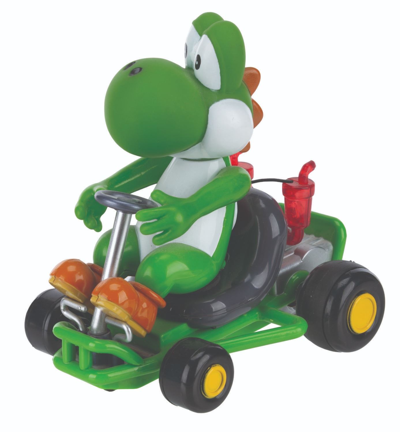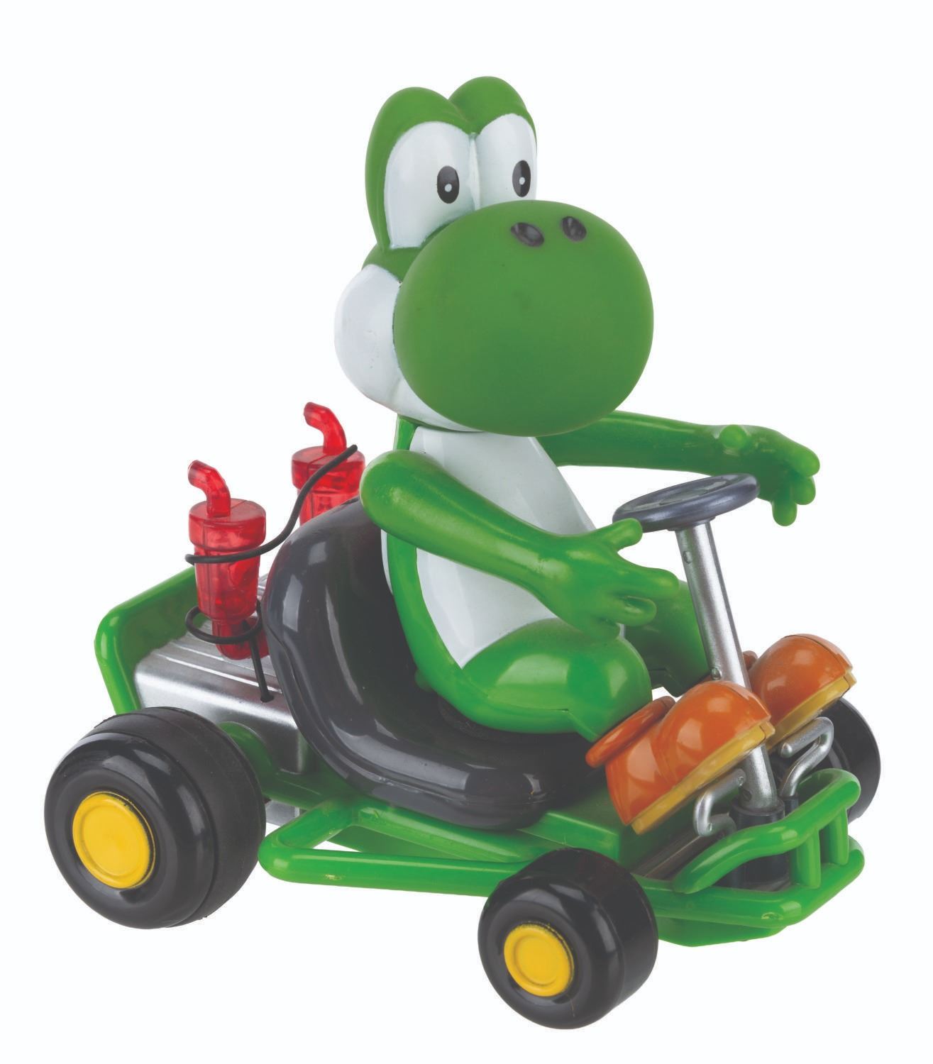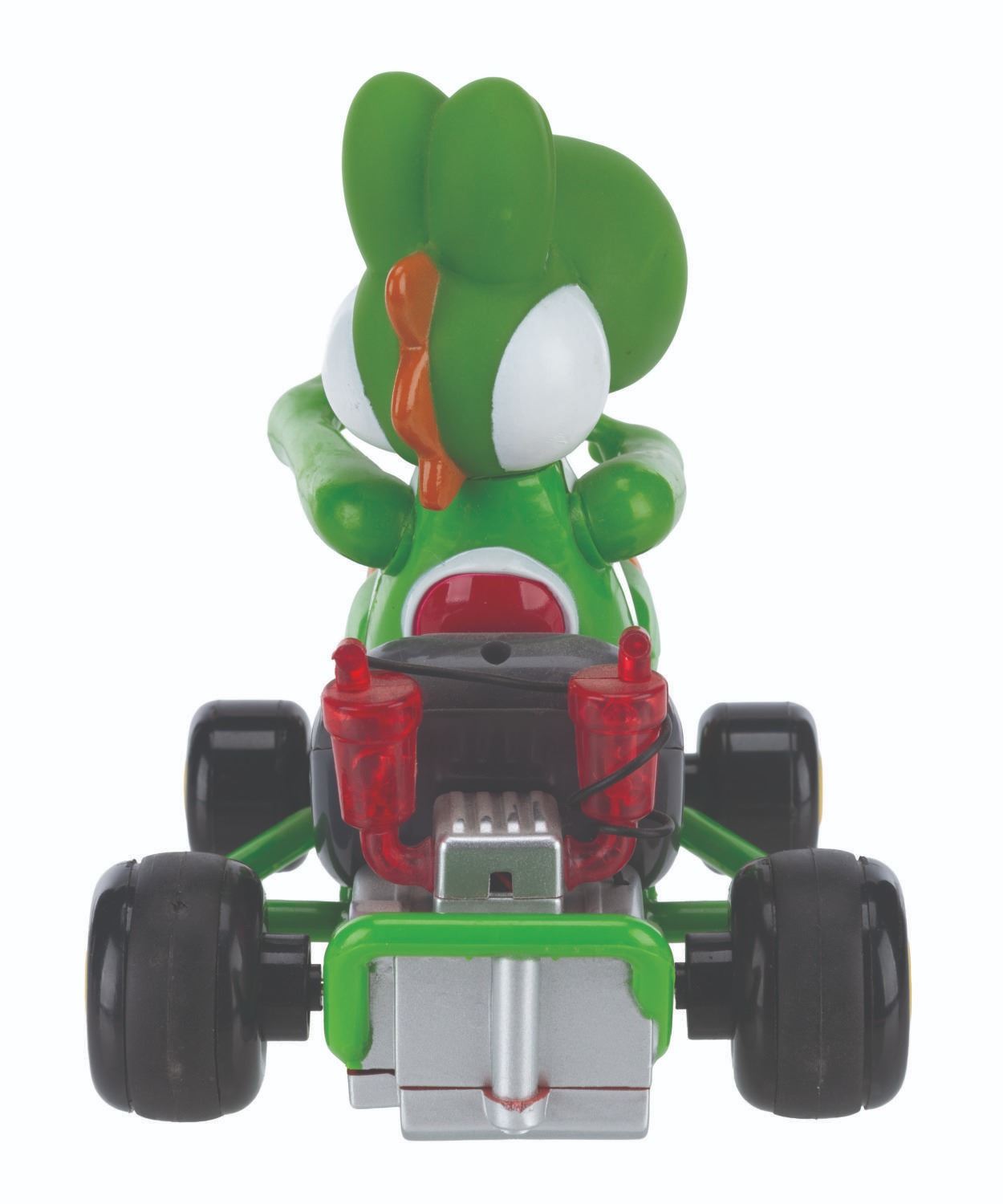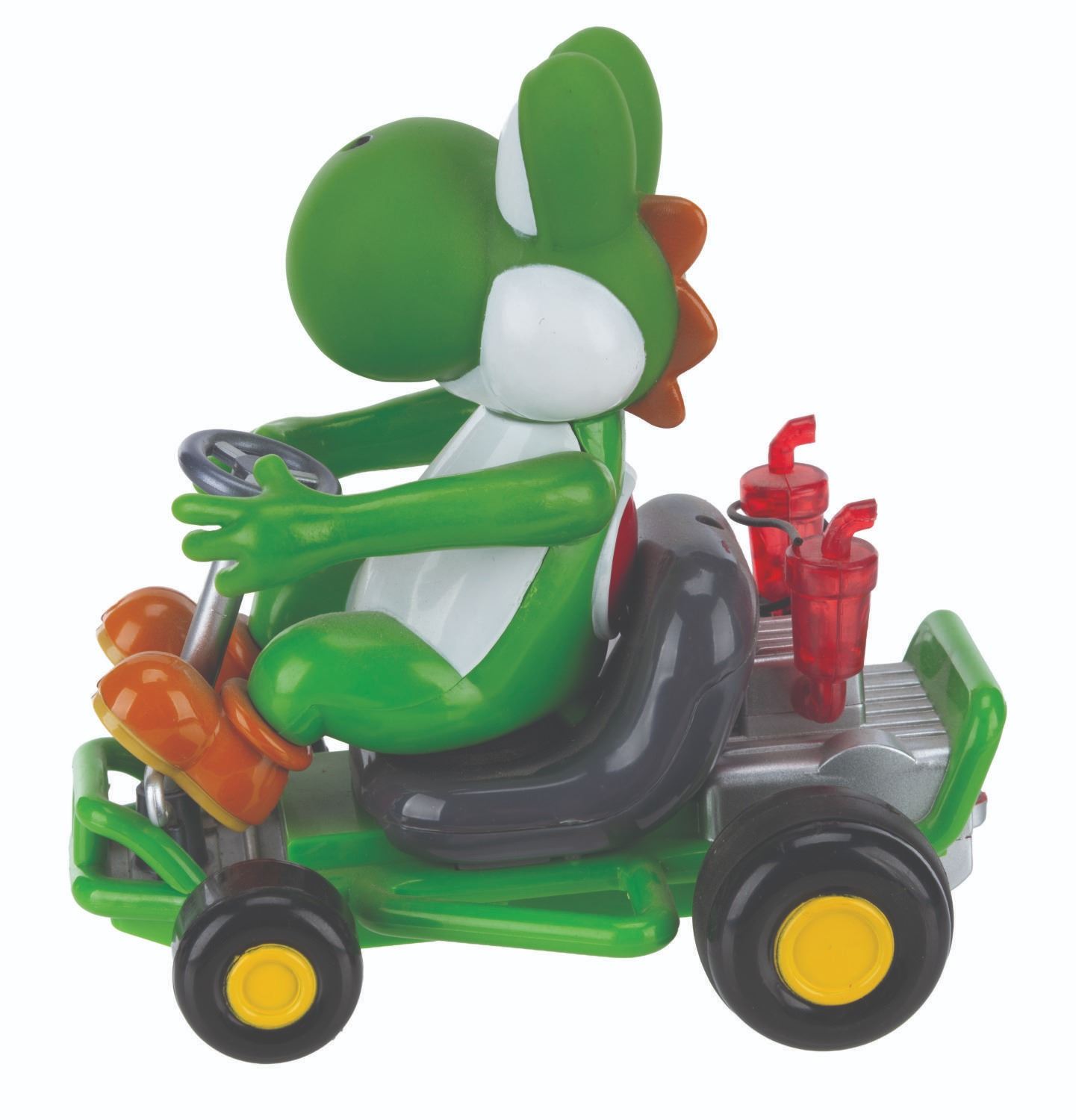 (NKOK, 2004) A Super Mario Kart Yoshi R/C car and remote by NKOK. Requiring 2 AA batteries and 1 9V battery (not included), the car worked when tested. Yoshi measures 5.25" x 4.25" x 5.25" tall and the remote 4.25" x 1" x 7.25" tall, displaying in very good condition with paint flaws on the eyes from production, spots of discoloration, and light wear, mainly on the tires.