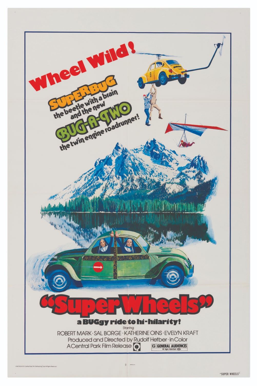 (Central Park Film, 1978) A One-Sheet poster for Super Wheels. Originally released in West Germany as the Maddest Car in the World, this was one of a series of children's films about Superbug, a sentient yellow Volkswagen Beetle, which was created due to the popularity of Disney's Love Bug films in the German market. Measuring 27"x41", the poster is in very good condition with original folds.