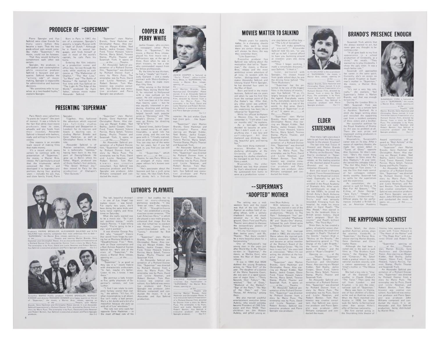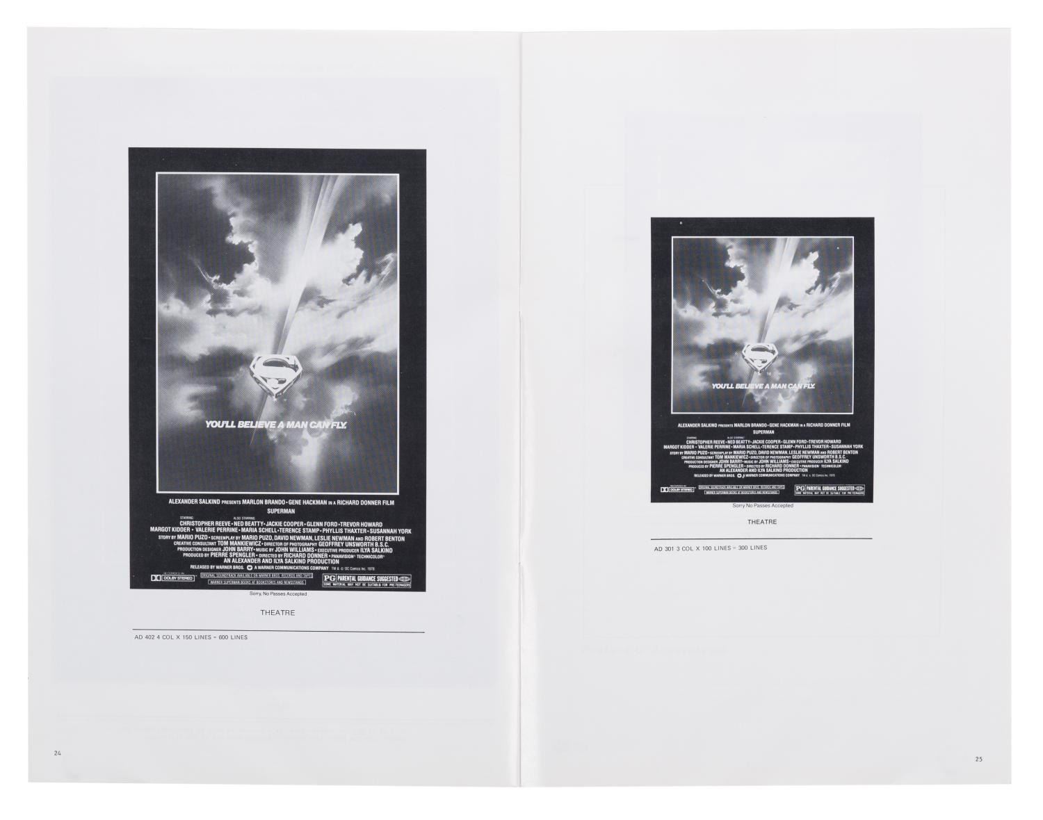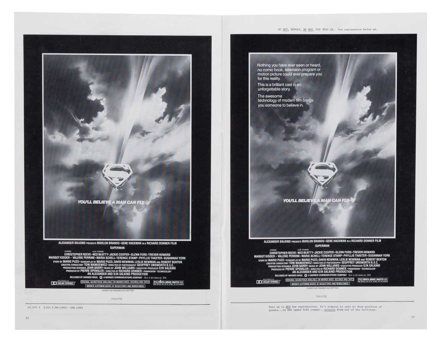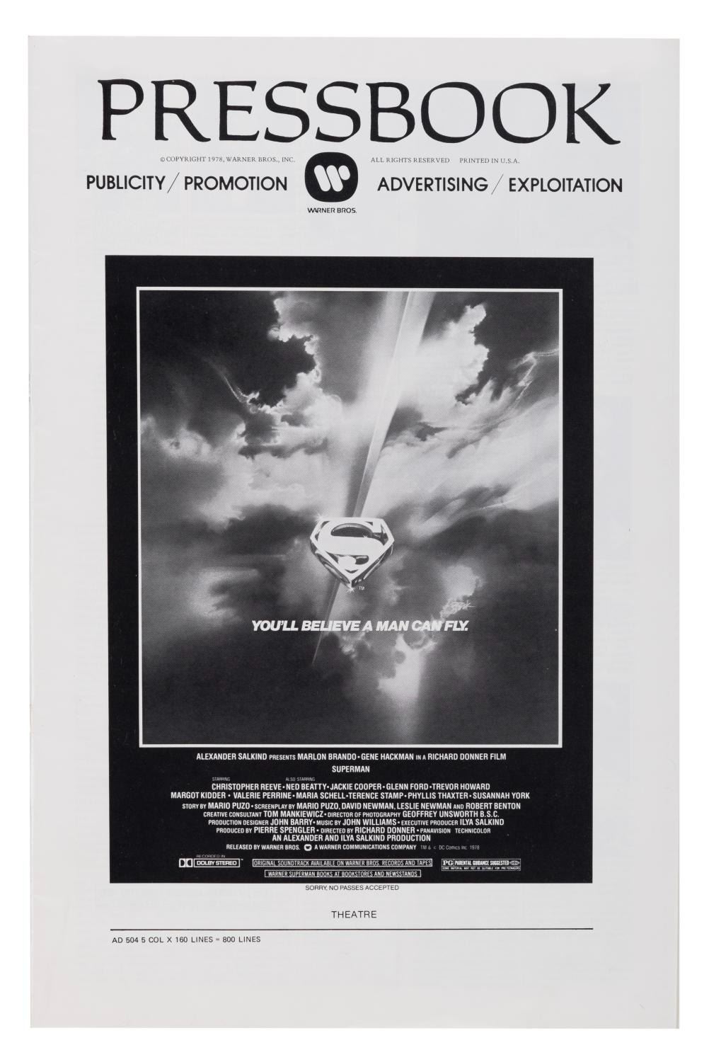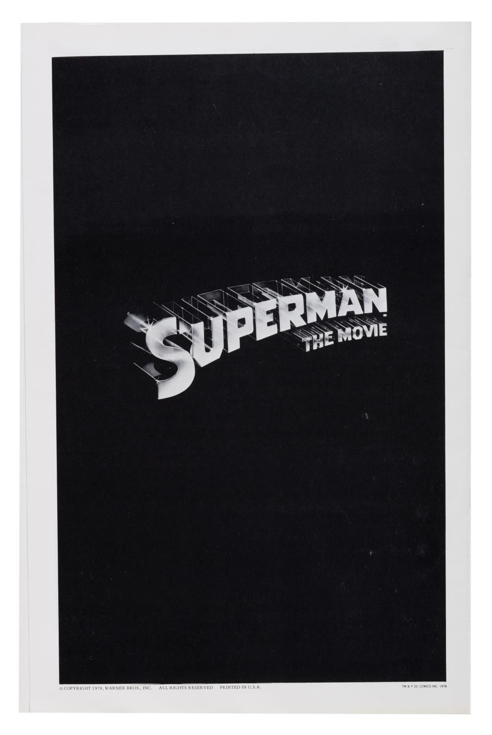 (Warner Bros., 1978) An original press book for "Superman: The movie" with 28 pages of print ad layouts, promotional tie-in information, and stories to promote the film. Measuring 11" x 16.75", the press book is in fine condition.