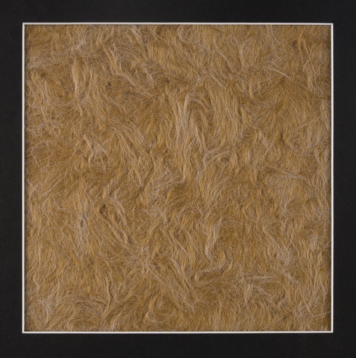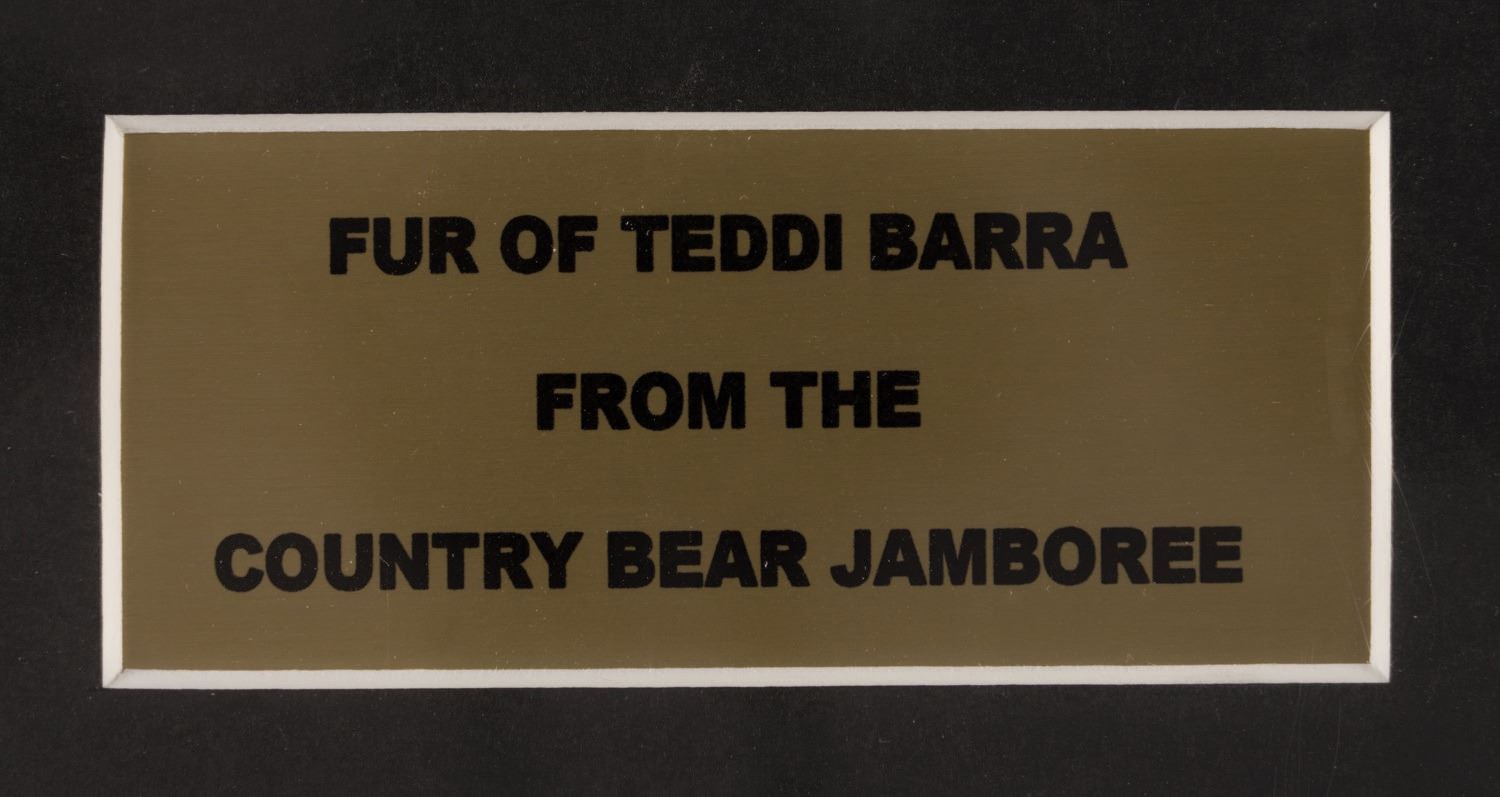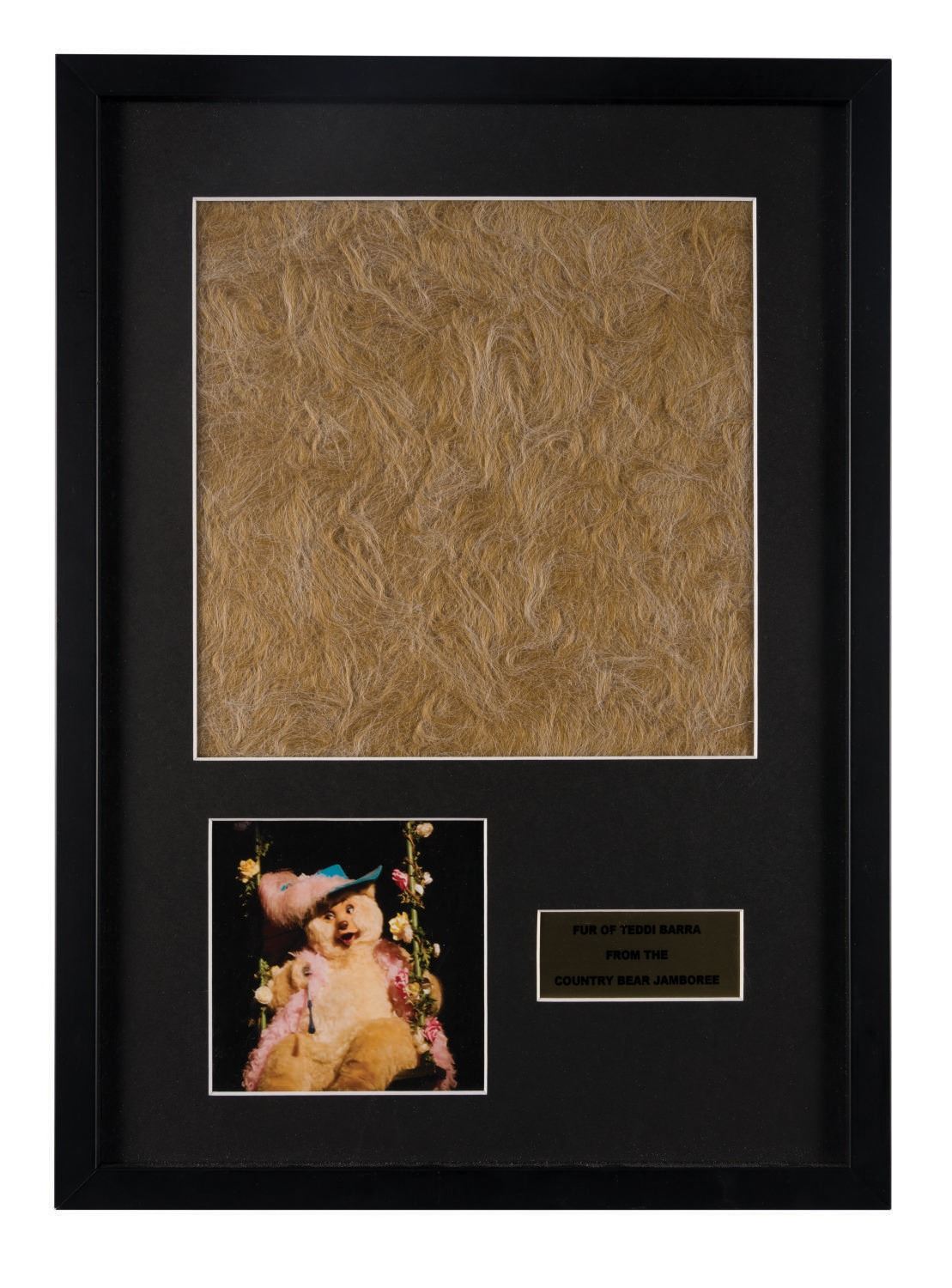 (Disneyland, 1980s) A swatch of synthetic fur of Teddi Barra from the Country Bear Jamboree. Measuring 9.75"x9.75, the fur is displayed with a photo print and plaque, within a 14.5"x20" frame. The piece displays in fine condition.