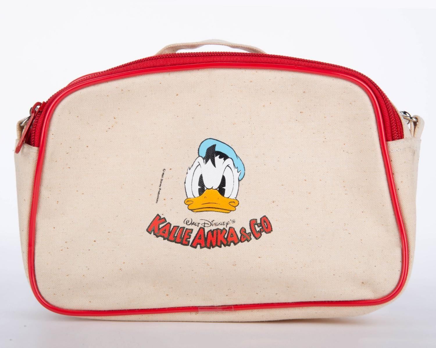 (Disney, 1980s) A canvas messenger bag featuring Donald Duck looking particularly displeased across the front. Swedish text below reads "Kalle Anka & C.O" which translates to Donald Duck & C.O in English. Based on the bag’s brand new quality and accompanying tags we believe this to be a prototype not released to the public. Measuring 10" x 7" overall, the bag is in very fine condition.