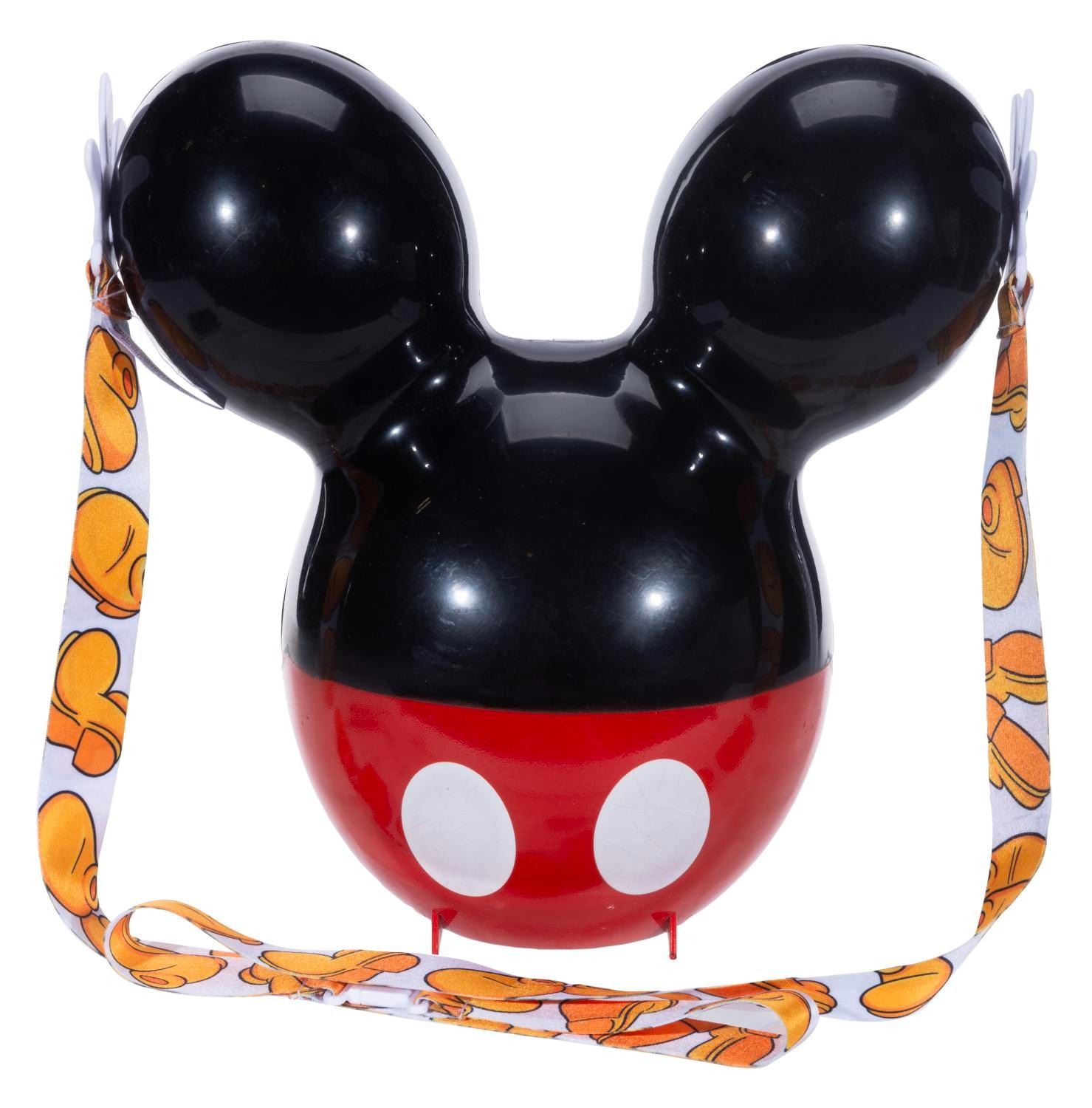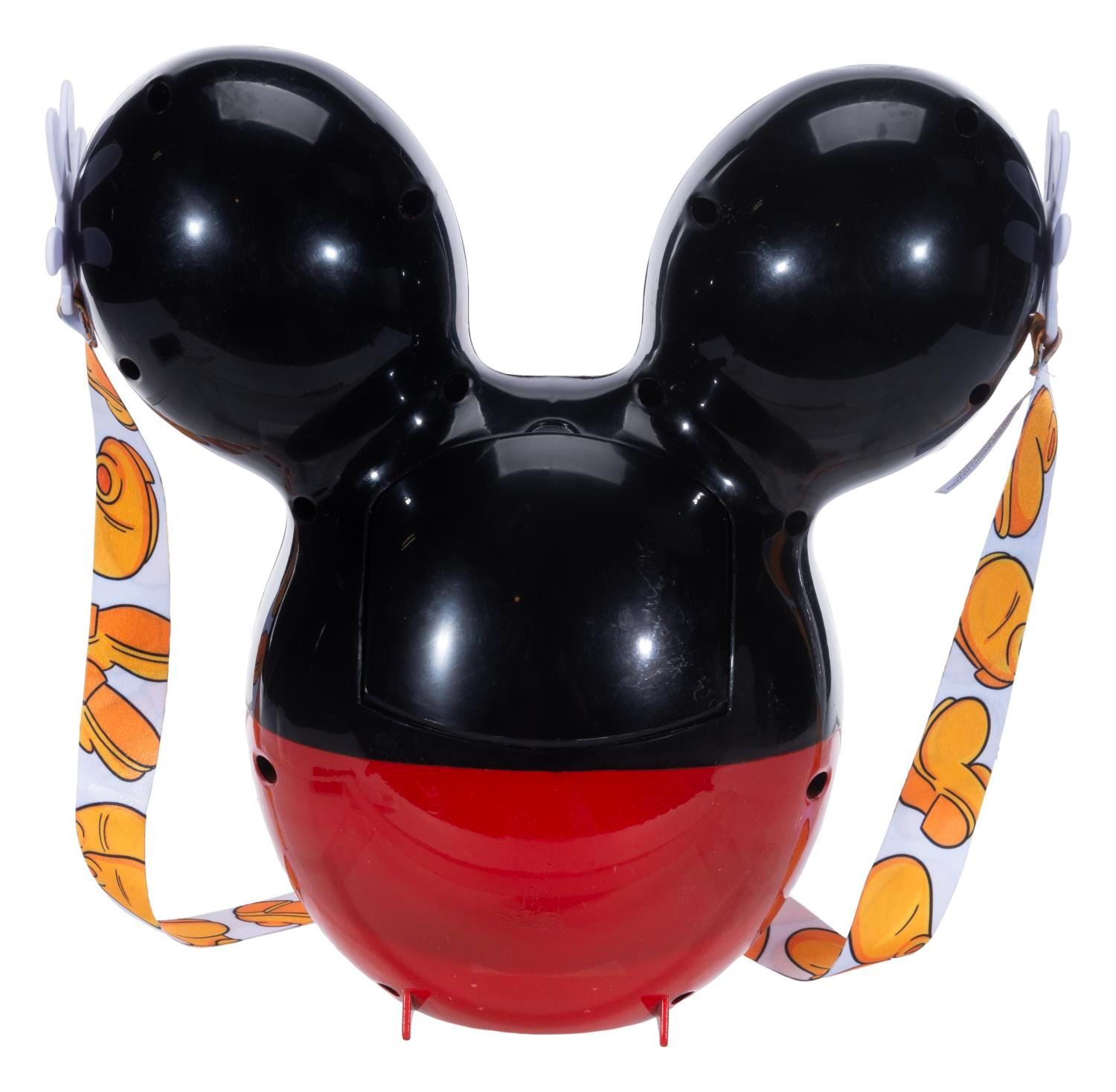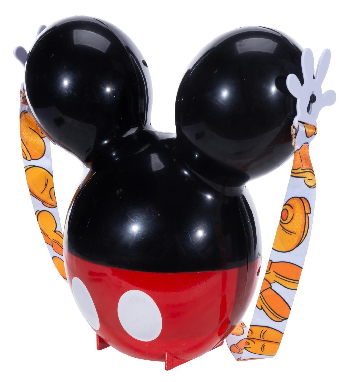 (Disneyland, 2019) A Mickey Mouse balloon-shaped popcorn bucket and strap released exclusively at the after-hours Sweet Hearts’ Nite event at Disneyland. Measuring 10.5" x 5.5" x 10.5", the bucket displays in good condition with heavy cracks to the white painted “buttons," light scratches throughout, and loose threads on the sewn tag.