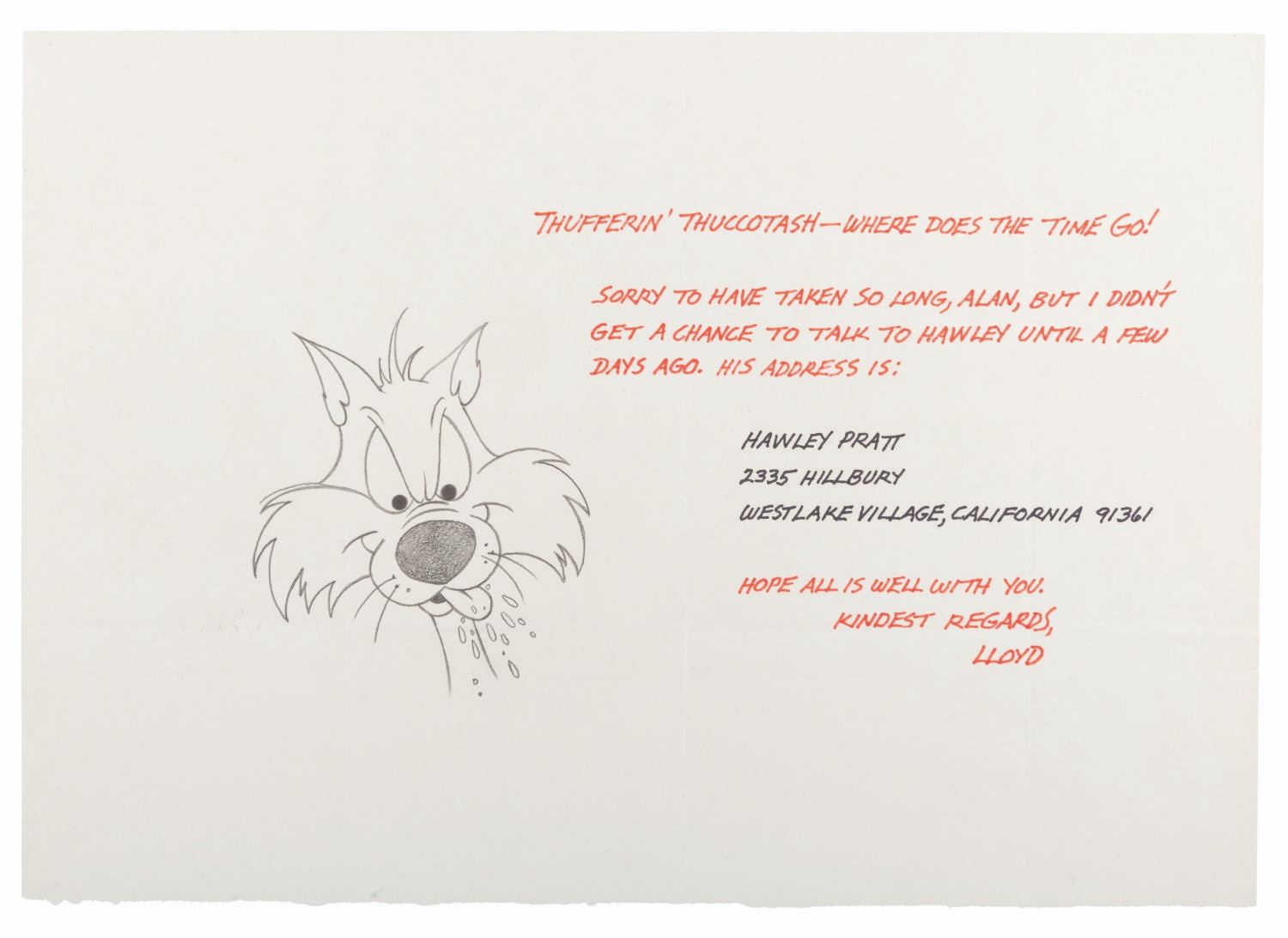 (Vaughan, 1970s-80s) A drawing of Sylvester by animator Lloyd Vaughan, signed with a note and dedication to Alan Hylton. Vaughan is well known for his prolific work on the Merrie Melodies and Looney Tunes series. Accomplished in pencils, the 3.5” x 4” drawing on 10.5" x 12.5" animation paper is in very good condition with slight color shift to the paper from age.