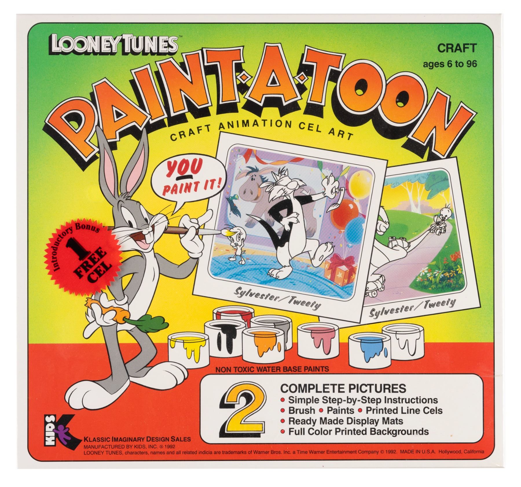 (Warner Bros., 1987) A Looney Tunes Paint-A-Toon kit for crafting animation cel art. The kit includes two unpainted printed line art cels featuring Sylvester and Tweety, paints, a brush, instructions, and display mats with color backgrounds. The set is sealed in the original 10.25” x 11” x 1” box and assumed in fine condition, with the paint likely affected by age.