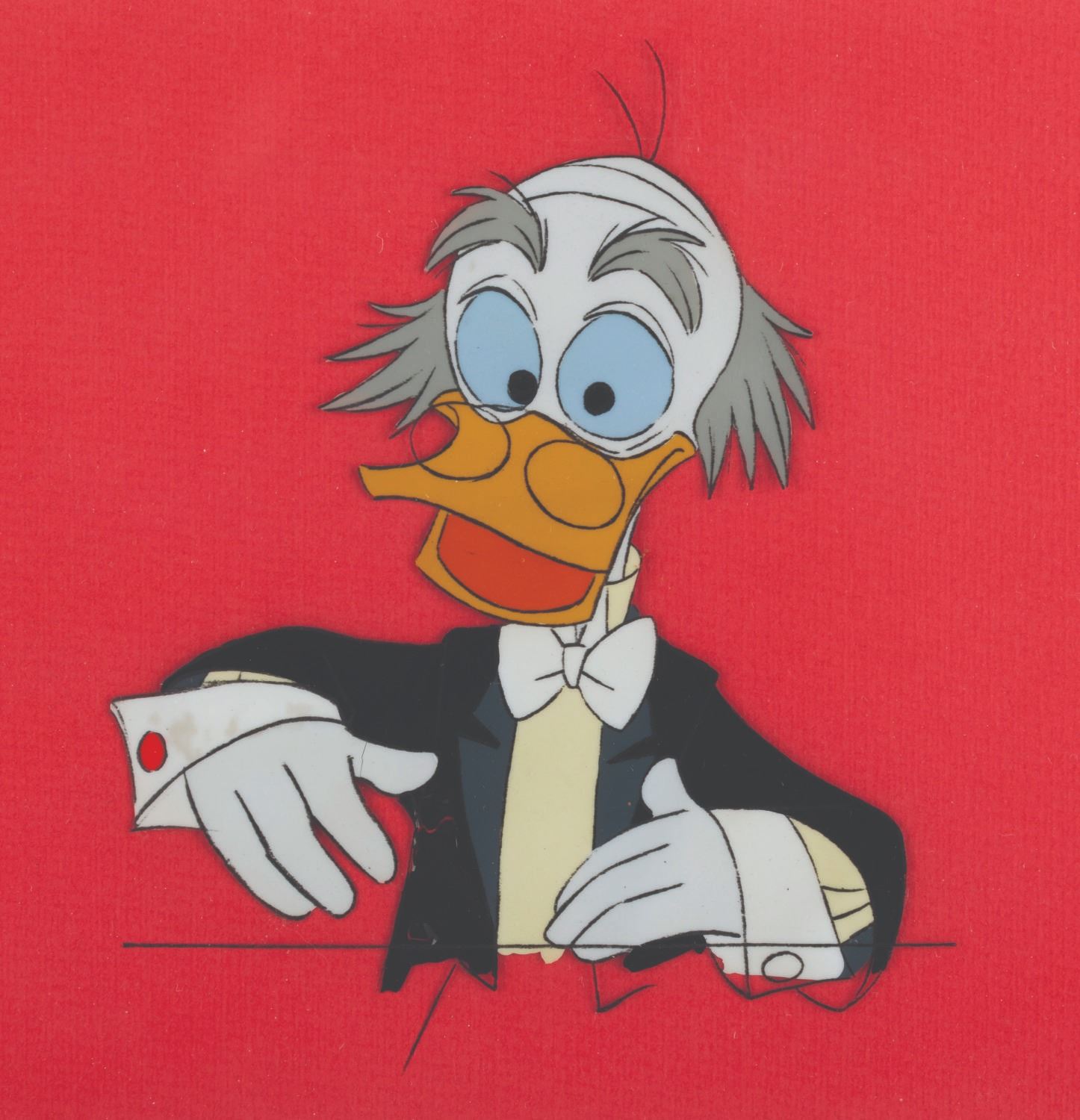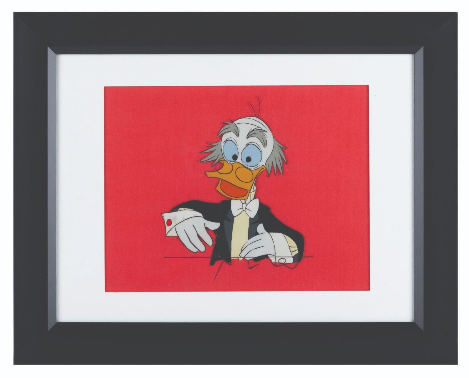 (Disney, 1962) An original hand-painted production cel of Ludwig Von Drake, from the Walt Disney featurette "A Symposium on Popular Songs." With an image size of 5" x 6" in a 7" x 9" matte, the cel is in good condition with light separation to the character’s right sleeve, and cracking and peeling to his right thumb and jacket.