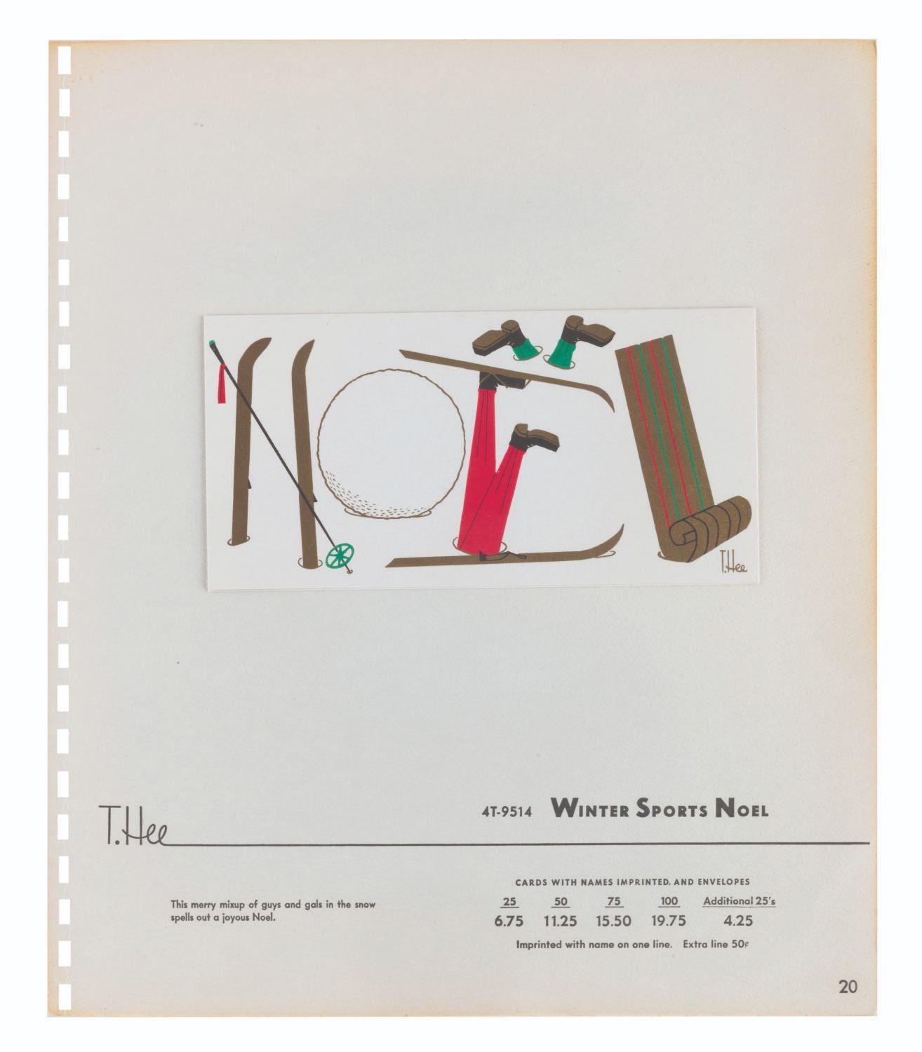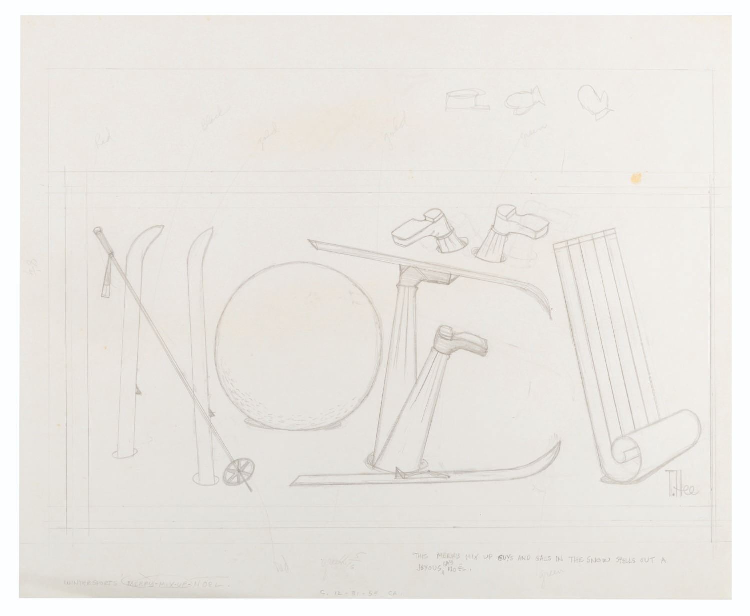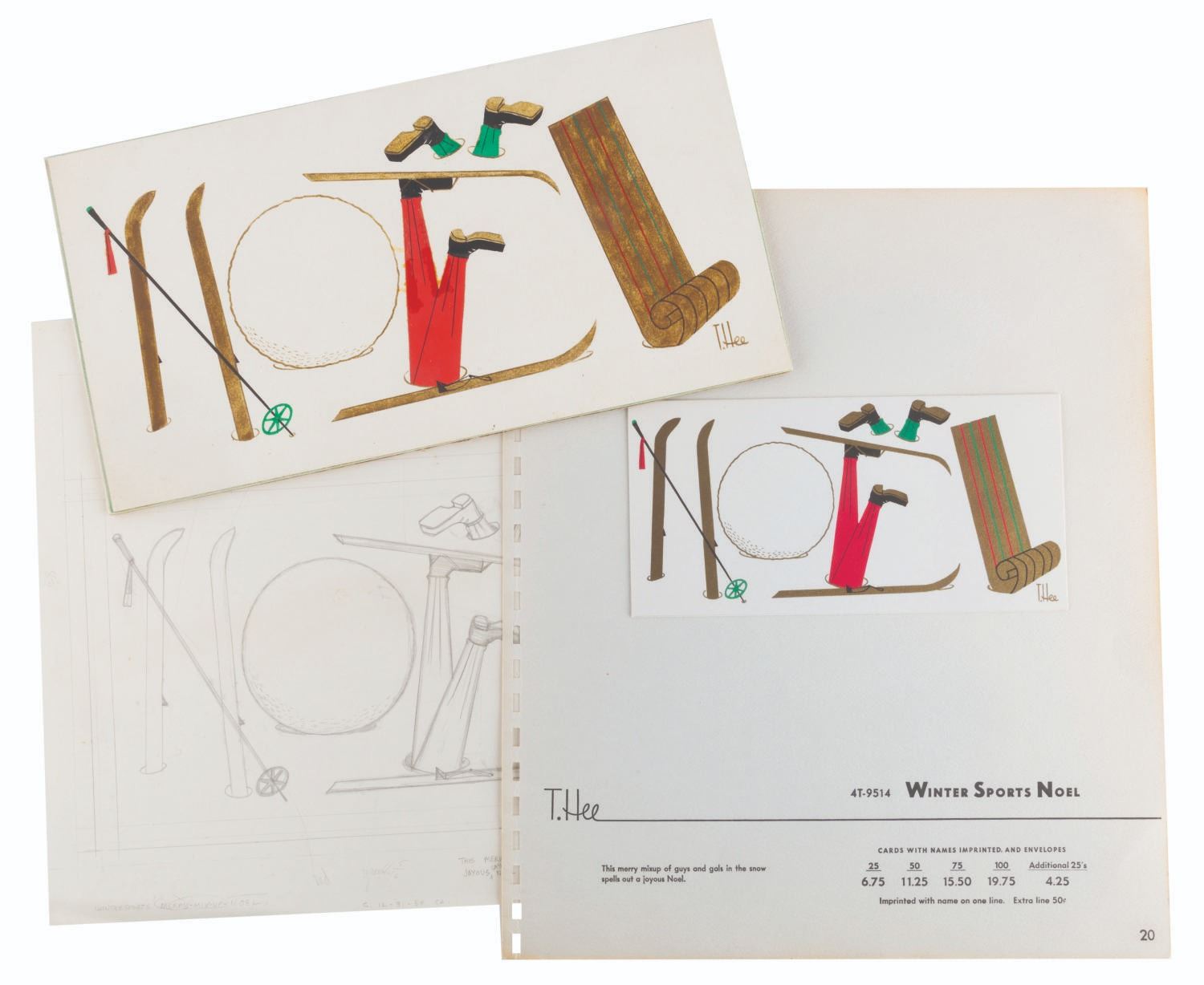 (California Artists Inc., 1954) A design and layout drawing by animator T. Hee, commissioned by California Artists Inc. for their Christmas cards. Both the graphite drawing and layout are signed by Hee, and an 11" x 13" catalog page with a sample of the finished 3.75" x 7.25" card is included. The graphite drawing measures 10.25" x 12.5" and the layout measures 6.25" x 11.75". The pieces are in good to very good condition with stains, glue residue, creases, wear, and discoloration from age.