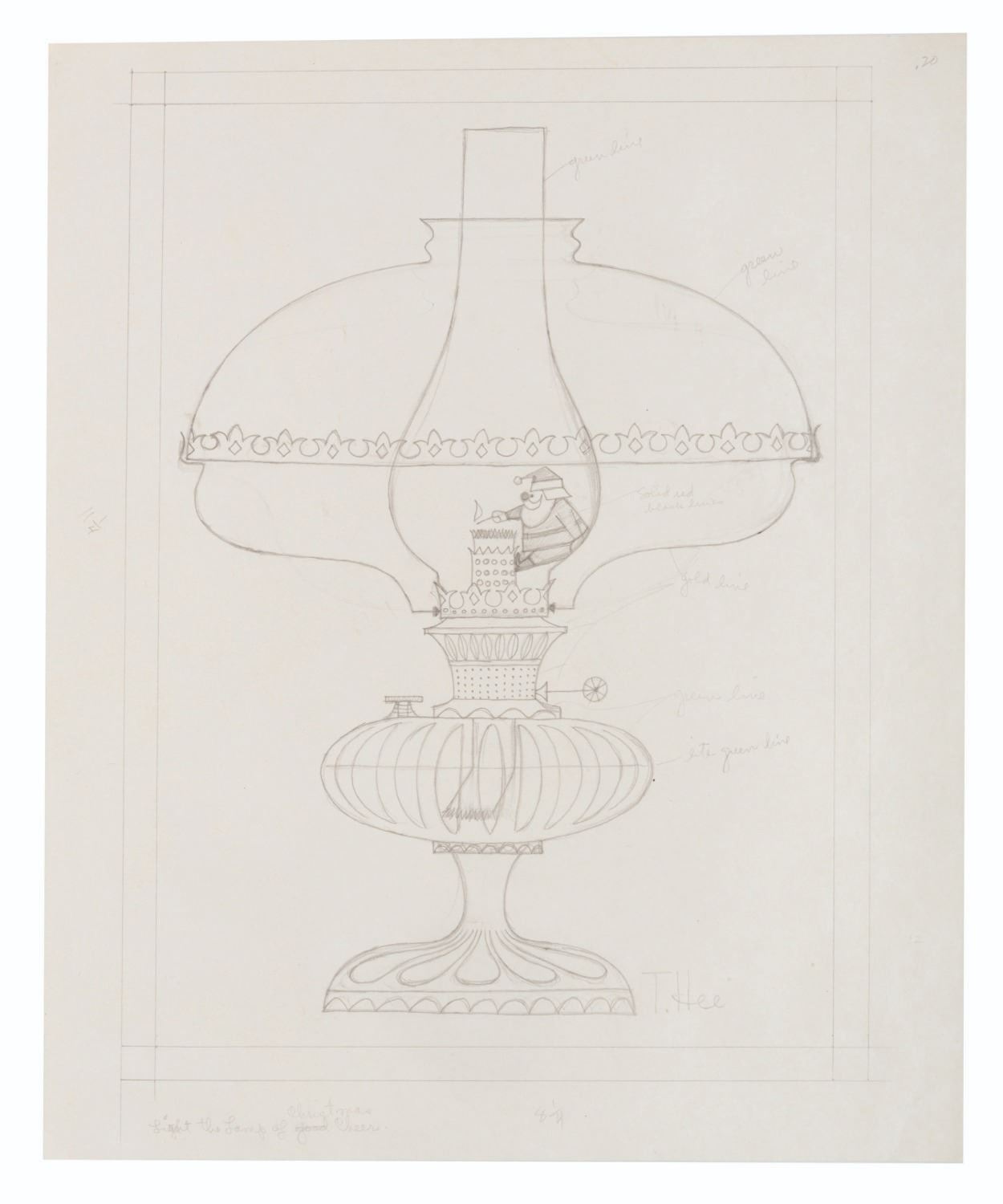 (California Artists Inc., 1950s-60s) A Christmas card drawing by animator T. Hee, commissioned by California Artists Inc. With an image size of 7" x 10" on 10.25" x 12.5" drawing paper, the graphite drawing is signed by Hee and is in very good condition with light wear and spots of discoloration from age.