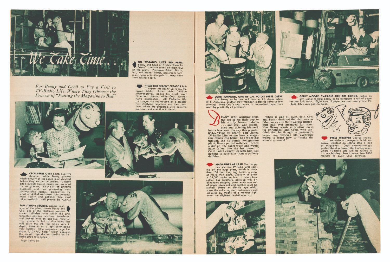 (TV-Radio Life, 1952) A September 20-26, 1952 issue of TV-Radio Life magazine. Pages 36-37 feature a spread on Bob Clampett, Beany, and Cecil’s visit to the TV-Radio Life offices to learn about the printing process, with eight black and white photos of the staff having fun with the popular “Time for Beany” puppets. Measuring 8.25” x 10.75”, the issue is in very good condition with light creases, pinholes, wear, and discoloration from age.
