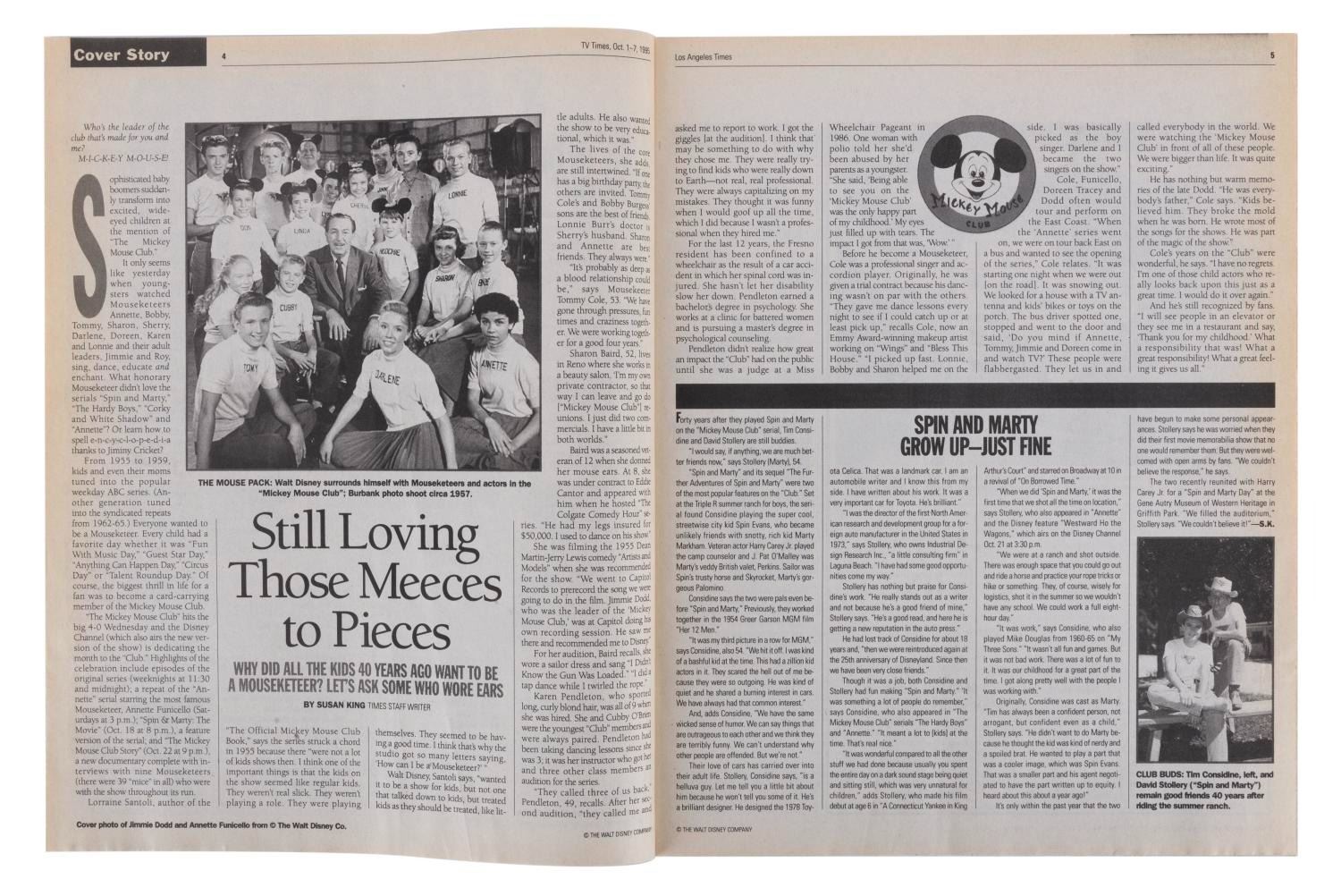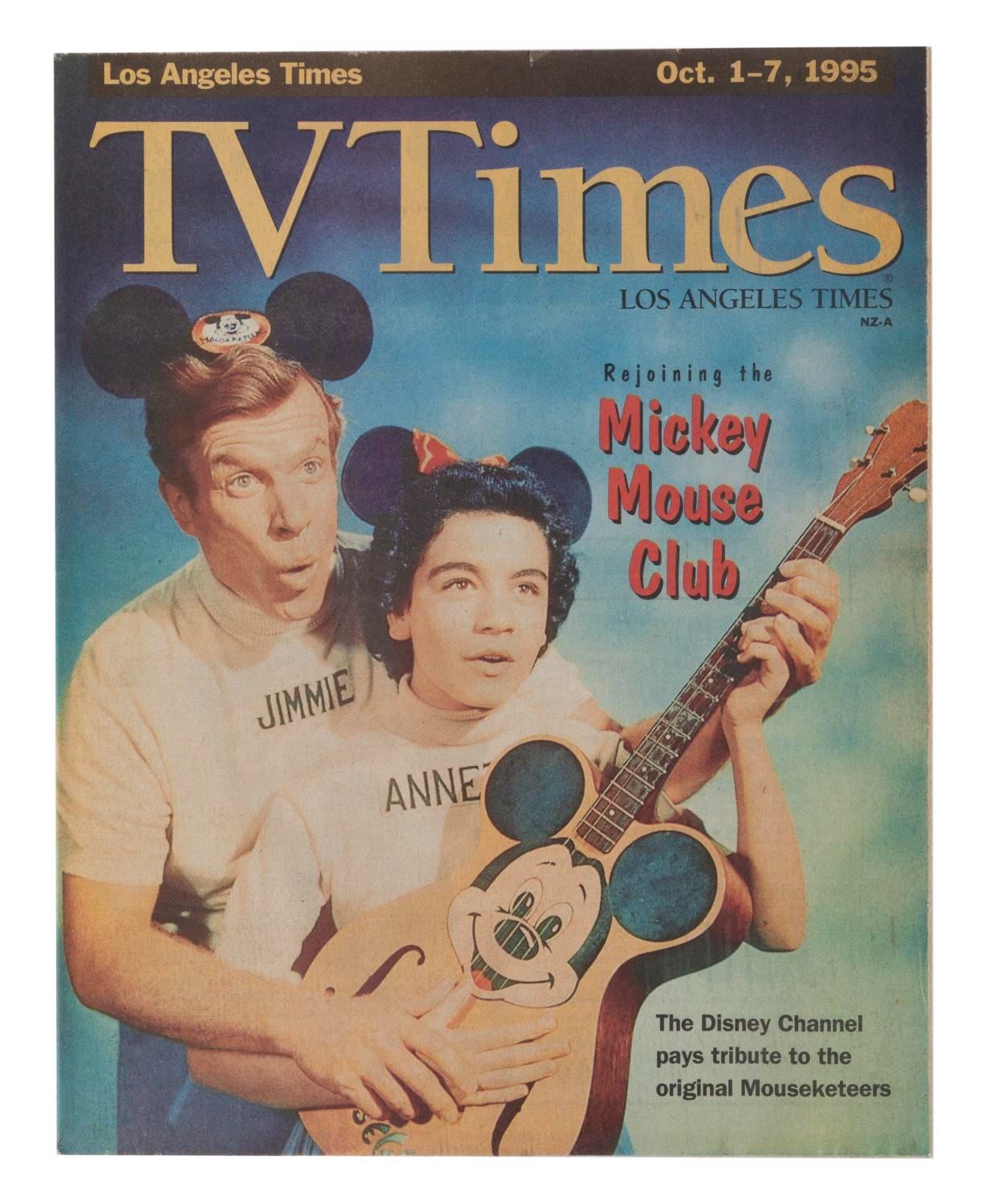 (Los Angeles Times, 1995) A rare edition of The Los Angeles Times - TV Times periodical magazine featuring a cover and article about the Disney Channel televised tribute to the original Mouseketeers. Measuring 8.5”x11”, this vintage tv guide exhibits fading to the cover and some creases and minor wear.