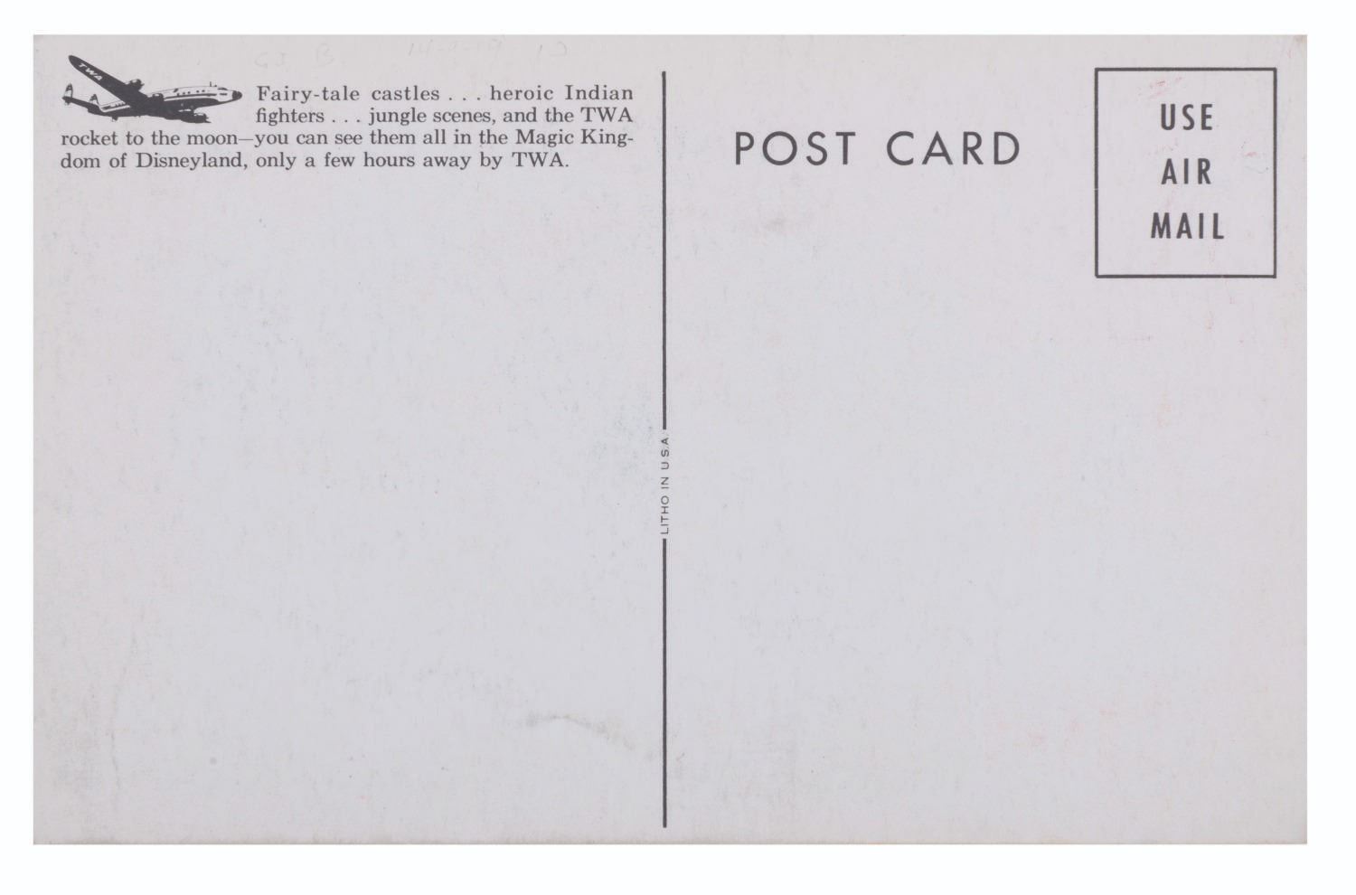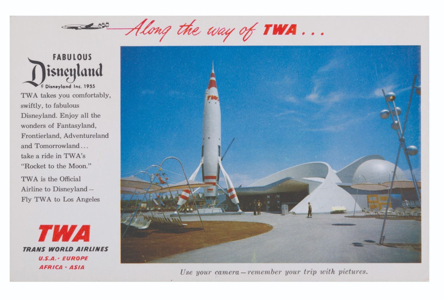 (Disneyland, 1955) A TWA postcard showing the Rocket to the Moon attraction in Tomorrowland. Measuring 3.5" x 5.5", the postcard is in fine condition with very slight wear to edges.