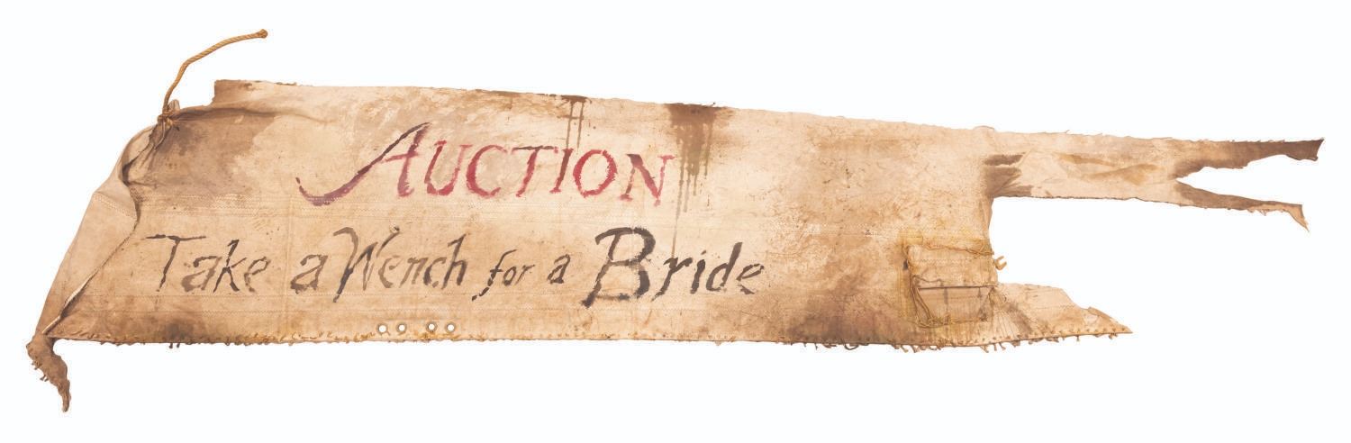 (Disney, 2006) A “Take a Wench for a Bride” auction banner from the short film “Pirates of the Caribbean: Tales of the Code: Wedlocked.” This large banner pays tribute to the one displayed during the infamous auction scene of the Pirates of the Caribbean attraction. The short film was shot by franchise creative consultant and storyboard artist James Ward Byrkit over three days on sets from "Pirates of the Caribbean: At World’s End," which were soon to be demolished. Serving as a prequel to the film series, the short explains why Scarlett and Giselle slap Jack and why Jack's boat is sinking at the beginning of the film. Although filmed in 2006, the short was not widely released until it was included as a special feature in a four-movie Blu-ray box set in 2011. Measuring 14 feet long and 37 inches wide, the banner is in very good condition, showing only light fading on the lettering, some wear, and intentional distress throughout. Due to size and weight, this item requires special shipping arrangements. Please inquire before bidding.