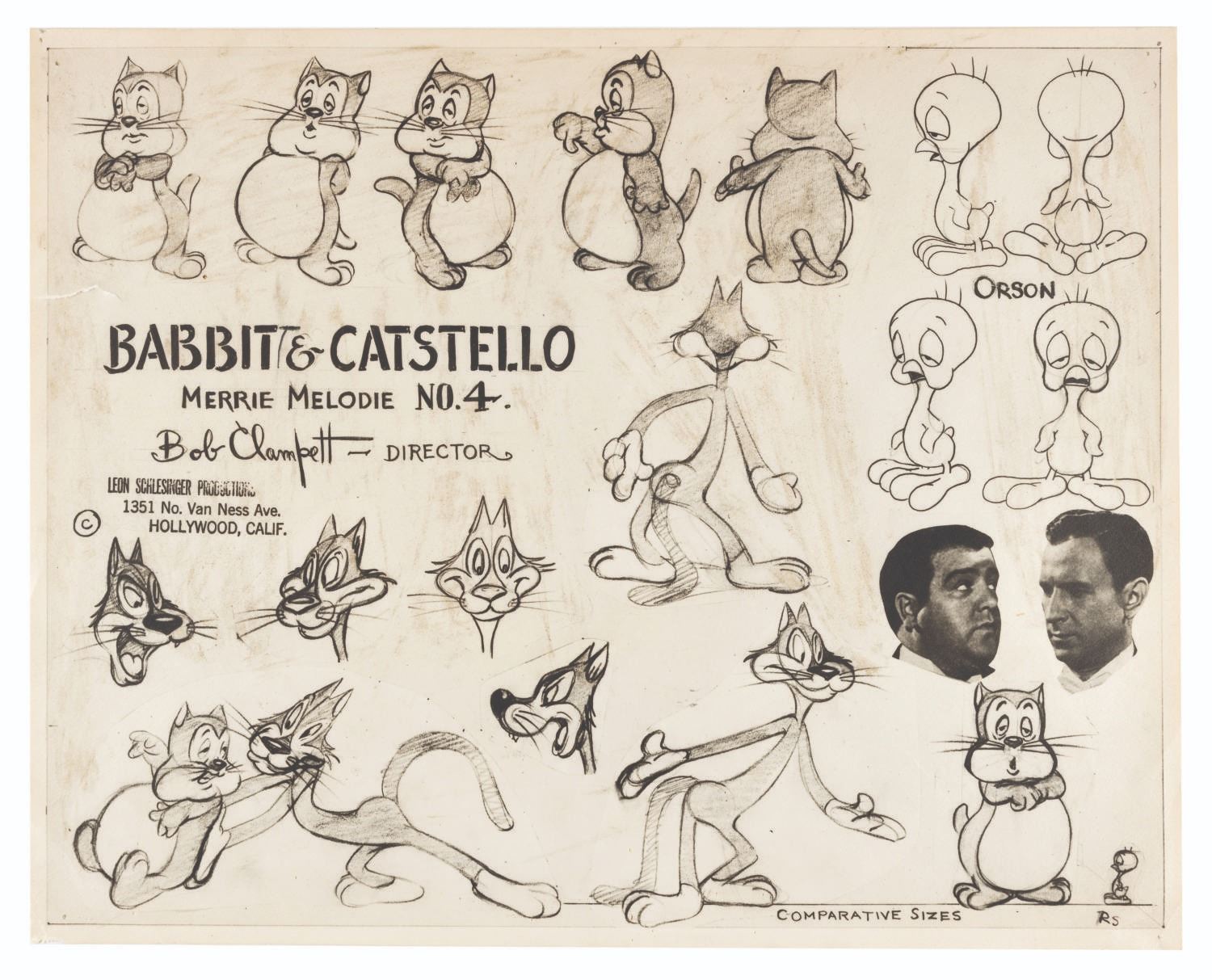 (Schlesinger, 1942) An original photostat model sheet for the Merrie Melodies cartoon “A Tale of Two Kitties.” This cartoon features the first appearance of Tweety Bird, here named “Orson.” The original title “Babbit & Catstello” references comedy team Abbott and Costello, the inspirations for the characters, with the sheet including their portraits. Measuring 11.5” x 14.5”, the photostat model sheet is in fair production-used condition, with pinholes, edge wear including a 1” tear to the left side, and streaks of grey discoloration overall.