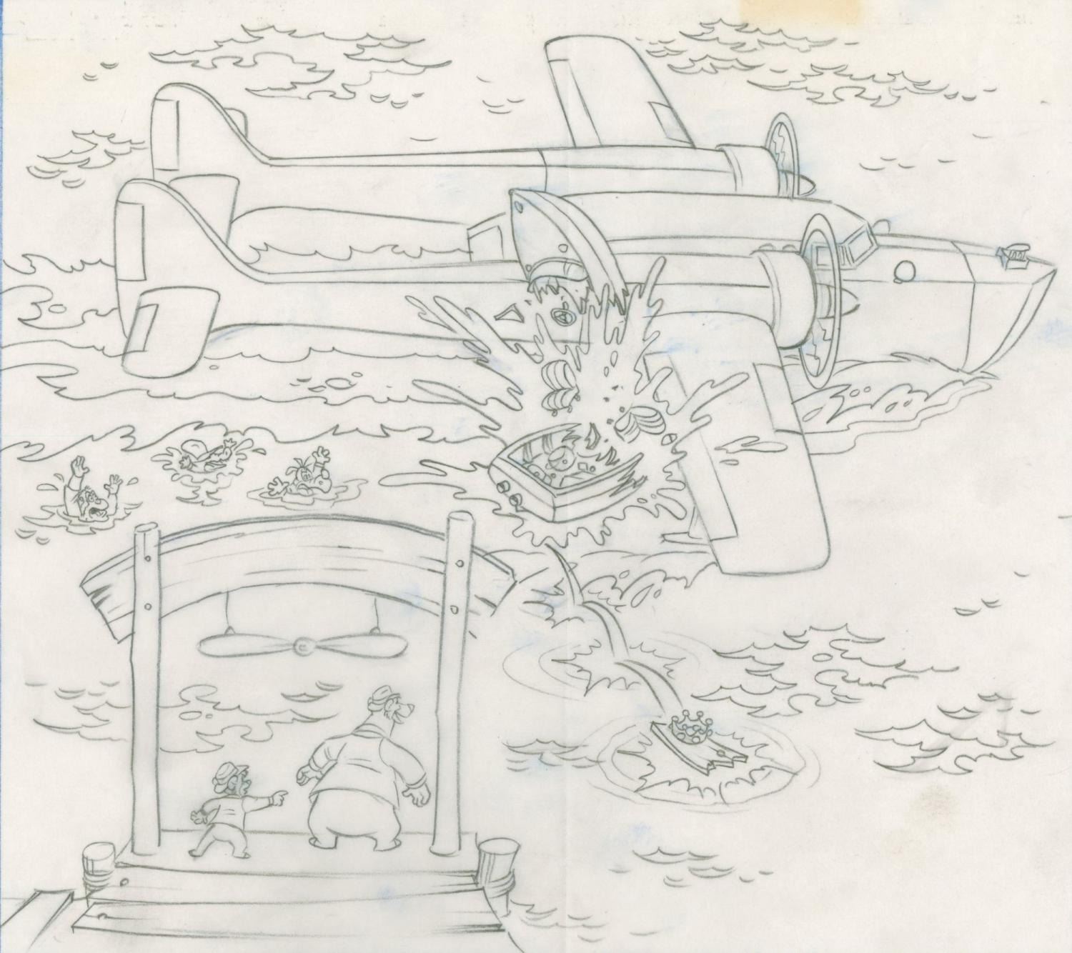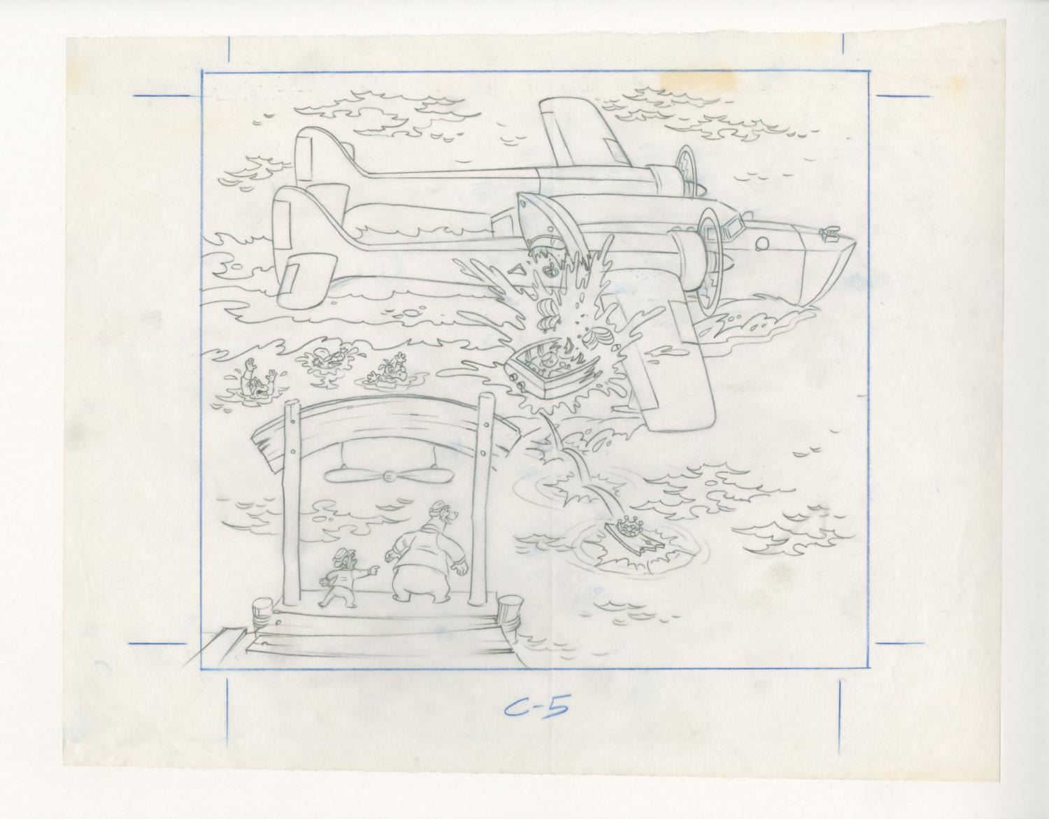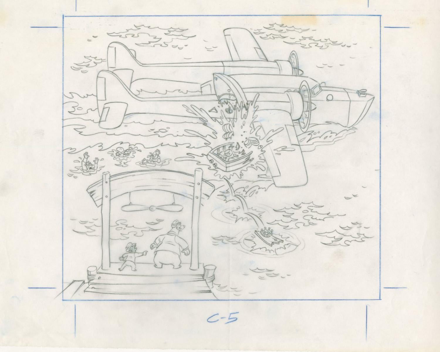 (Disney, 1991) An original development drawing for a View-Master slide of Disney Afternoon’s series "TaleSpin." The graphite and colored pencil drawing on velum was created at the Disney Studio and used to create a color image on a View-Master reel. Measuring 11" x 14" overall, the artwork is in very good condition with minor fading, discoloration, edge wear, a vertical crease down the middle, and adhesive staining near the top right corner.