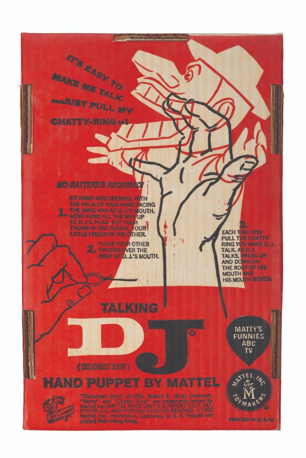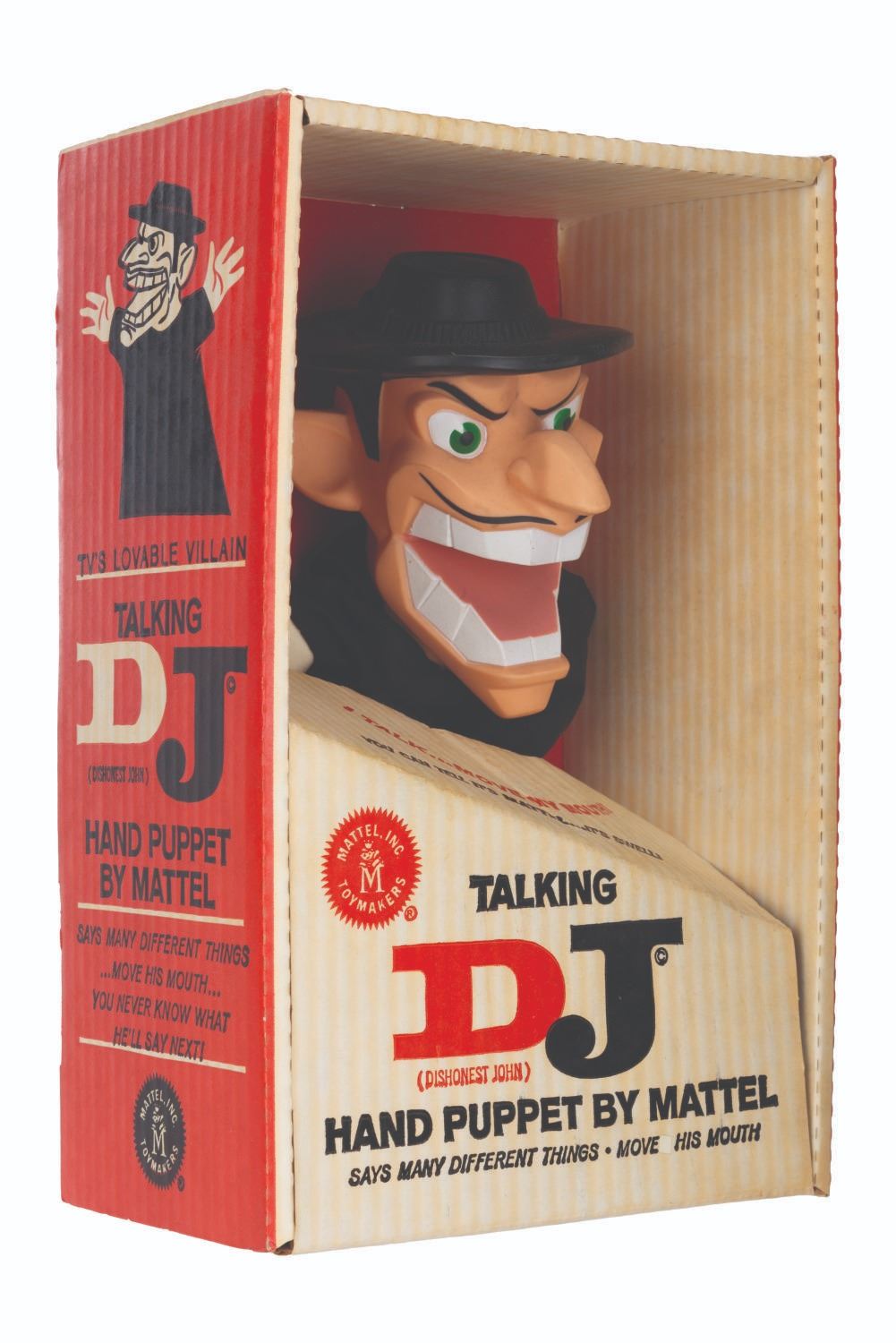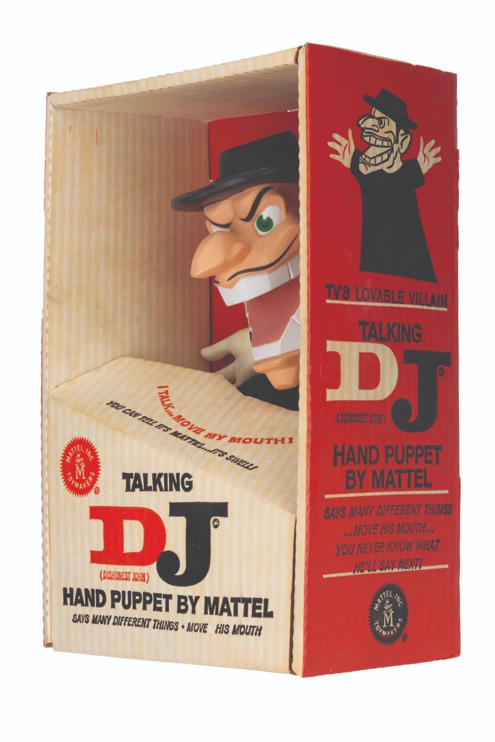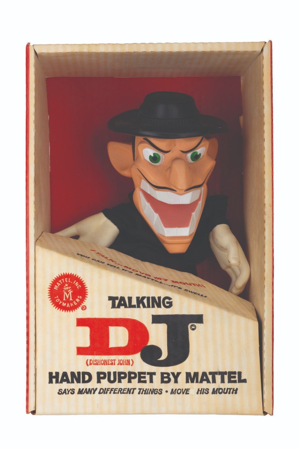 (Mattel, 1962) A Talking DJ (Dishonest John) Hand Puppet by Mattel. The toy speaks when its ring is pulled and worked intermittently when tested. Measuring 6.5” x 10” in its 7.5” x 4.75” x 11.5” tall box, the puppet is in very good condition with scuffs and stains, while the box is in good condition with discoloration from age and light wear.
