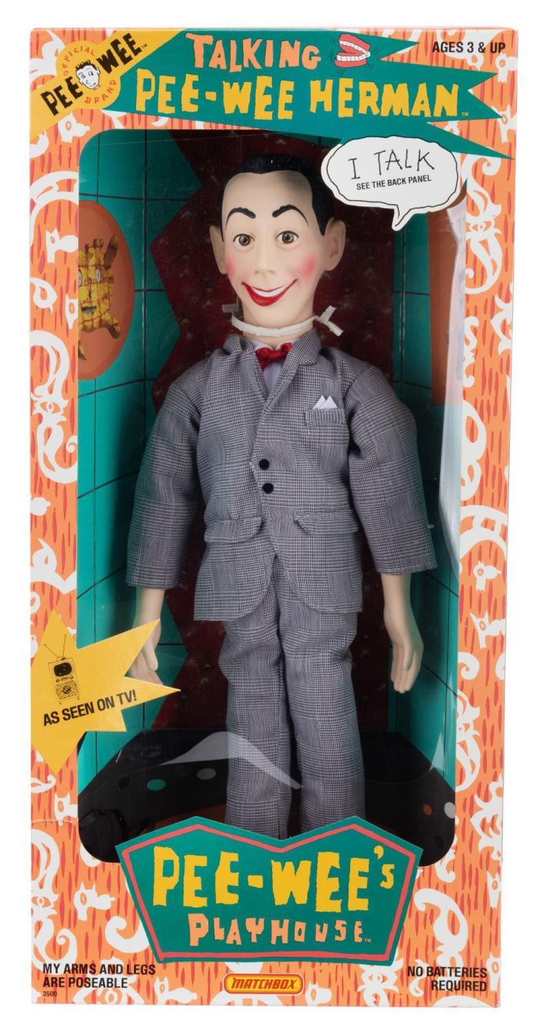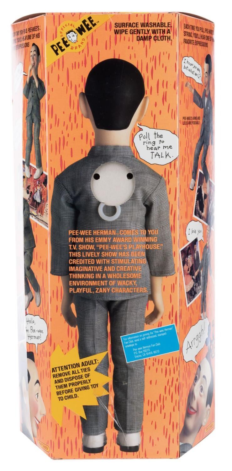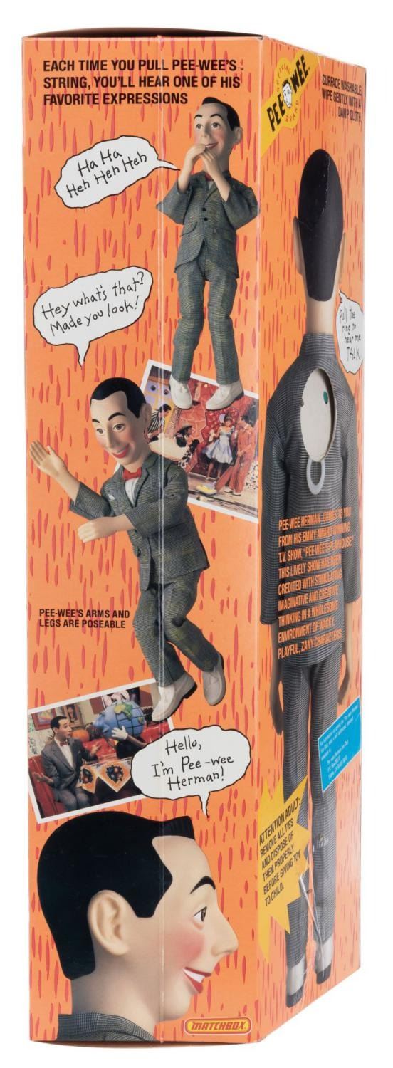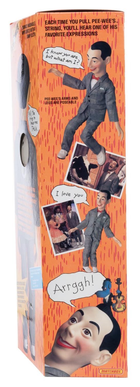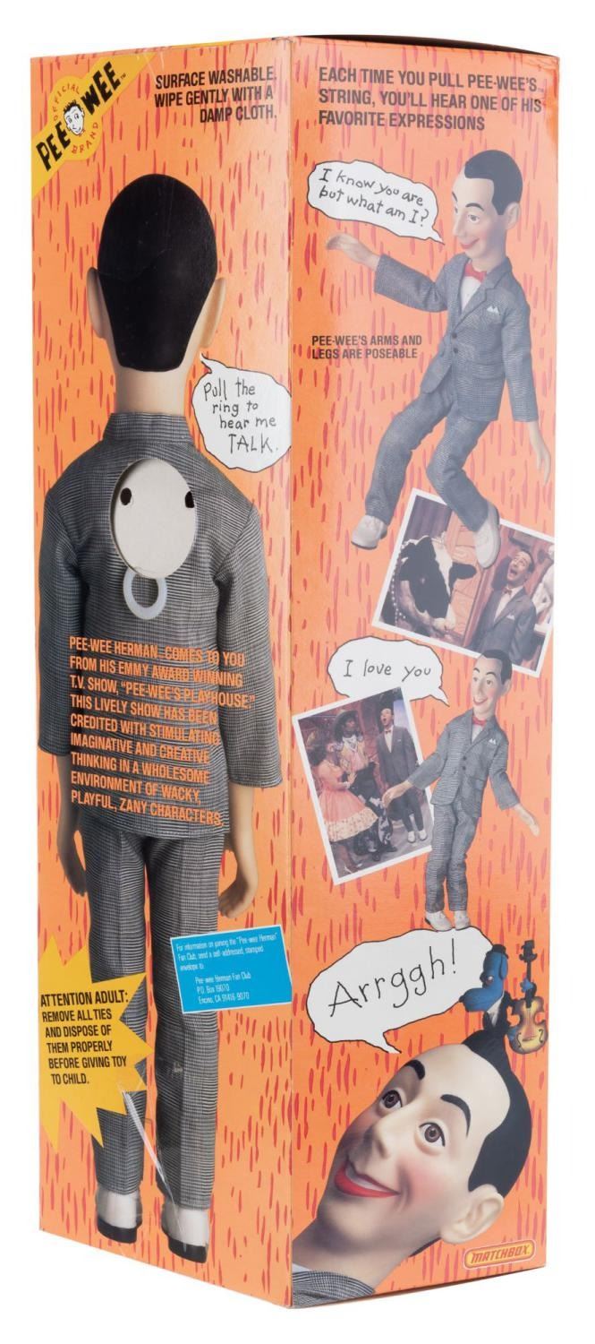 (Matchbox, 1987) A talking doll of Pee-wee Herman from "Pee-wee's Playhouse" in the original box. When the string is pulled, he says one of his famous phrases, with the voice mechanism sped up from age, as is typical. Measuring 18" tall, the doll is in fine condition with a tiny scuff or painting flaw at the top of the head. The box measuring 10" x 4.5" x 20", is in good condition with typical handling wear.