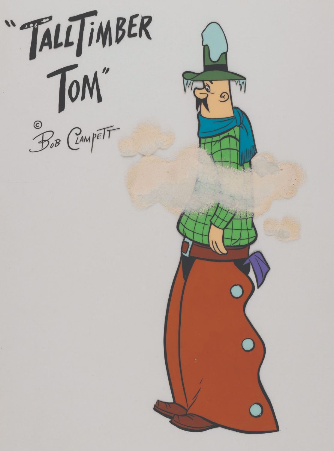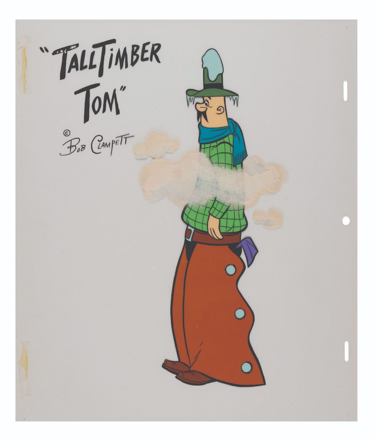 (Clampett, 1970s-80s) An original hand-painted cel of Tall Timber Tom with a Bob Clampett copyright. With an image size of 7.5” x 11” on a 10.5” x 12.5” cel, the piece is in good condition with paint loss, scratches, pinholes, and tape residue from display.