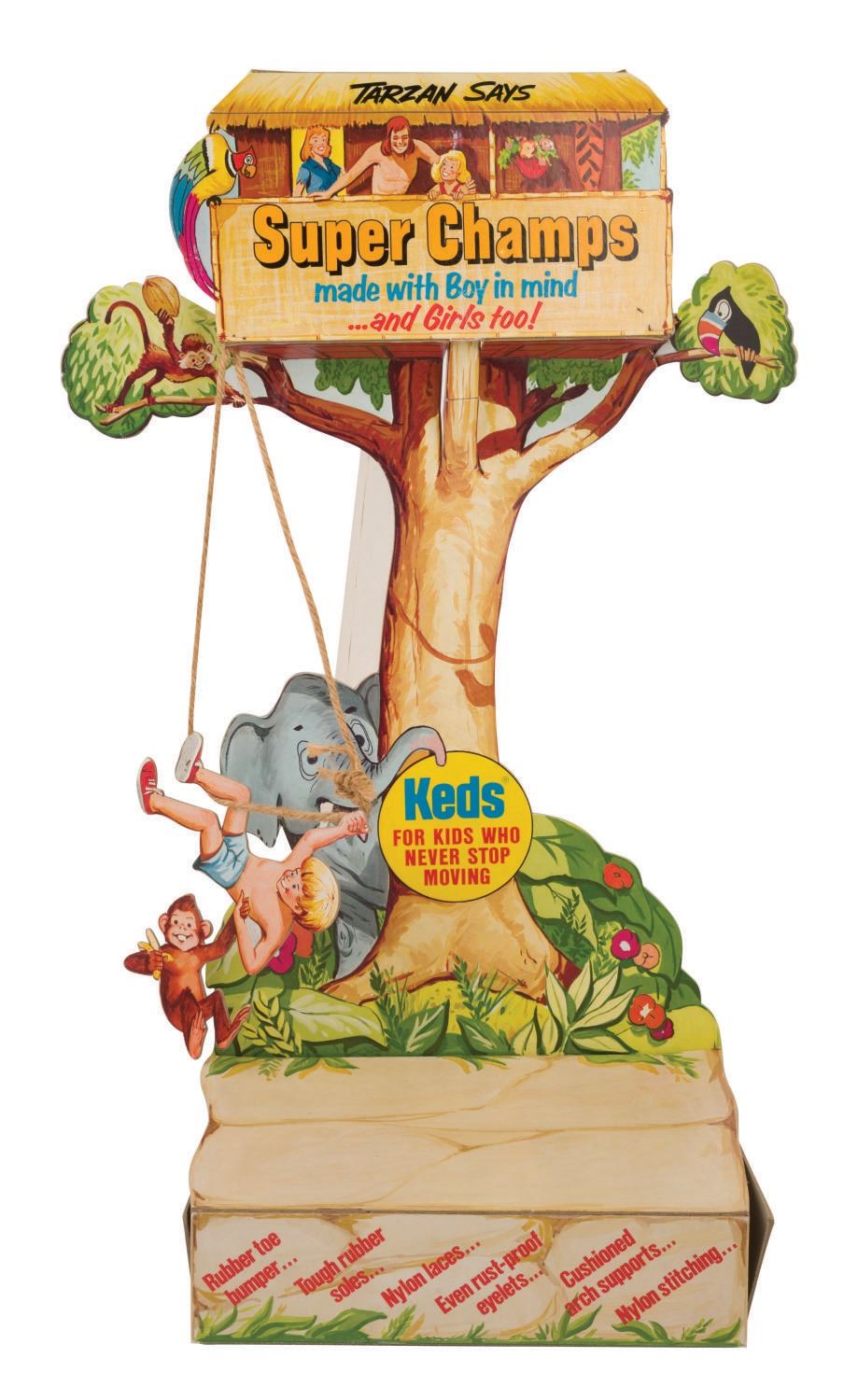 (UniRoyal, 1960s-70s) A Keds Super Champs Store Display by UniRoyal. The vintage heavy cardstock and twine display depicts Tarzan, Boy wearing a pair of Super Champ Juniors, and two girls in a tree house. Measuring 23" tall and 8"x11.25", the piece is in good condition with dust, mild fading, and both wear and tears to flaps.