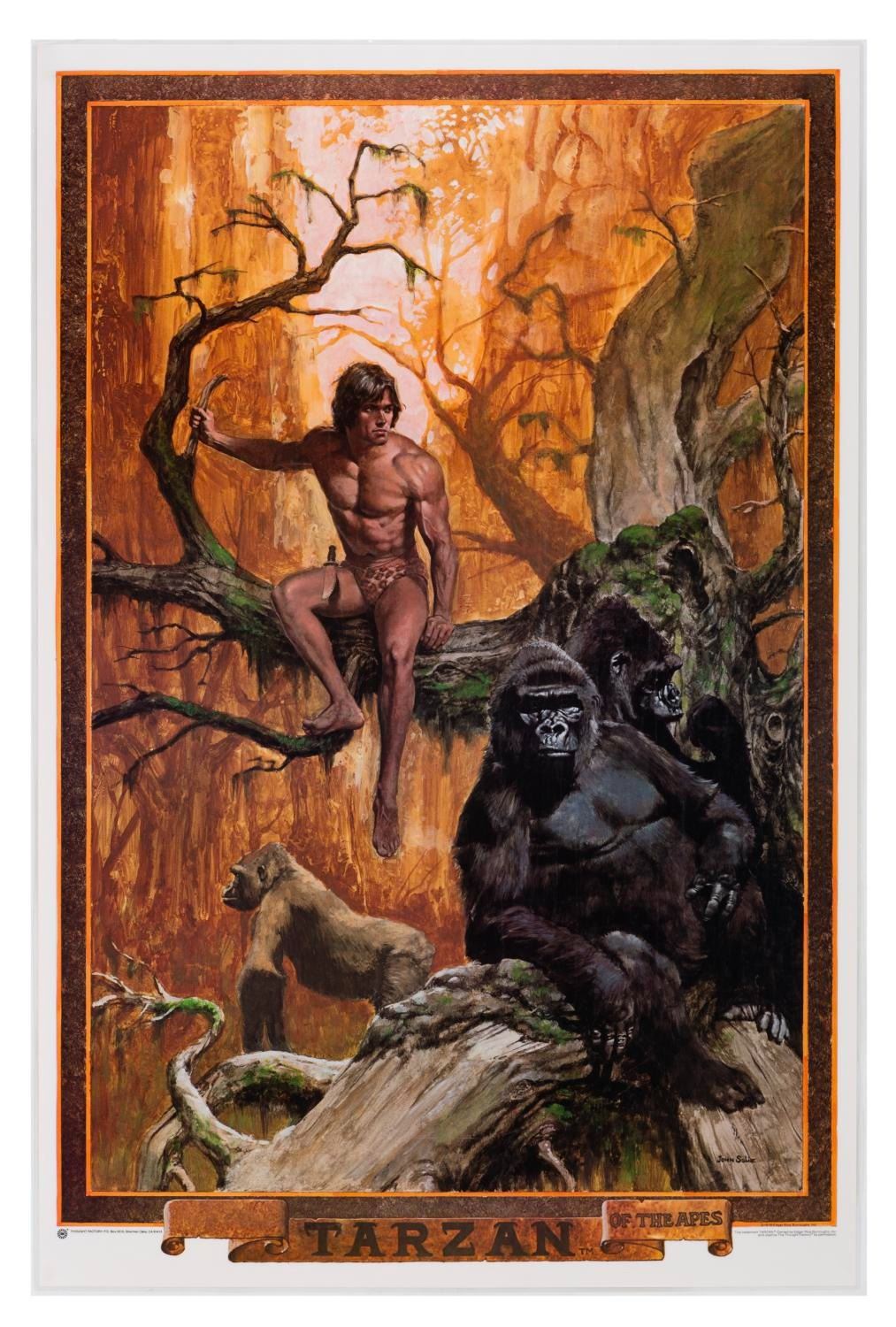 (Thought Factory, 1978) A merchandise poster of Tarzan of the Apes featuring art by John Solie. This poster was laminated by the company to keep as a sample. Measuring 23.25" x 35.25", the poster displays in good condition with light handling wear, and some waviness to the lamination.