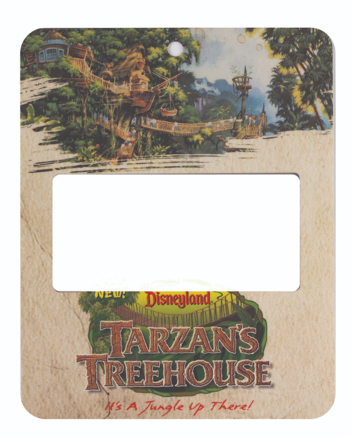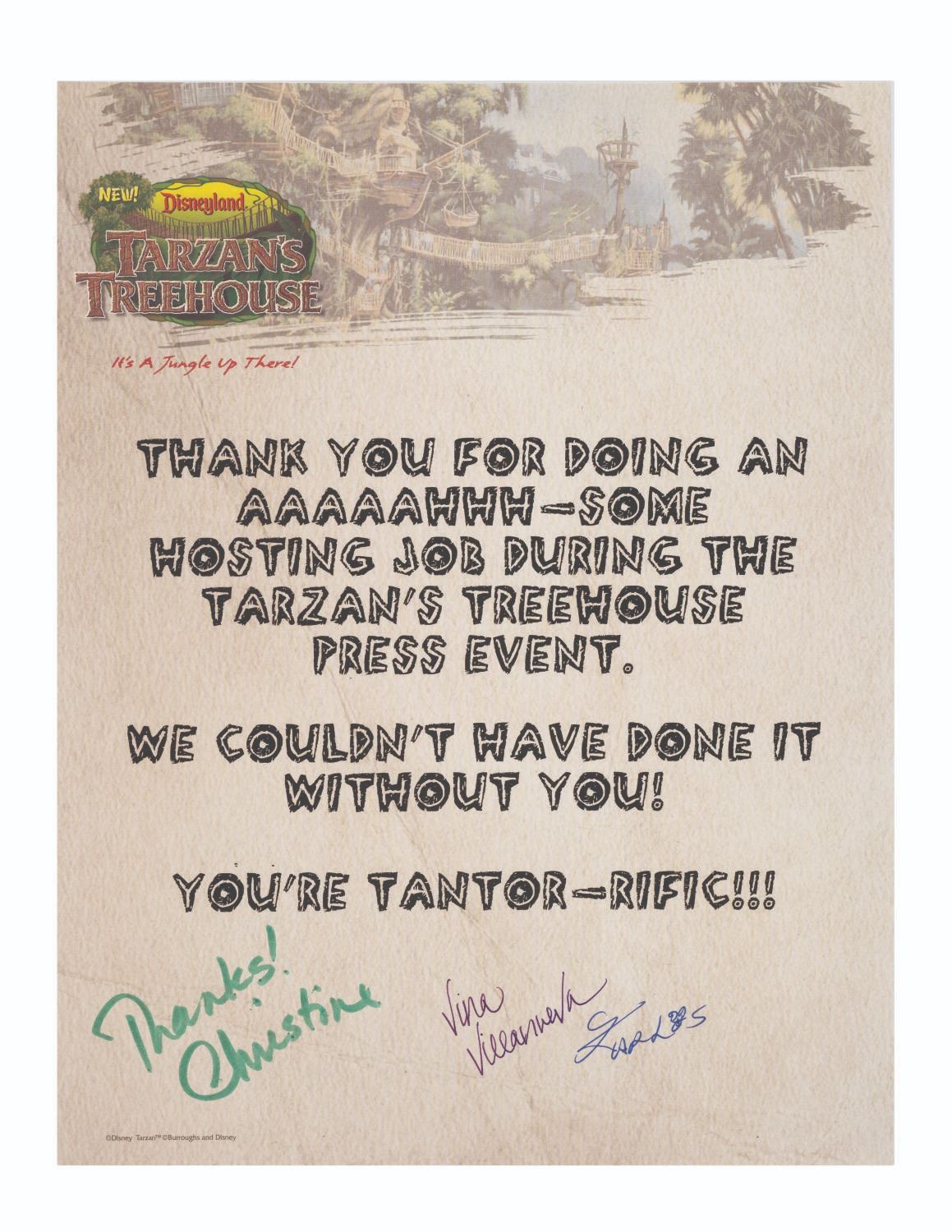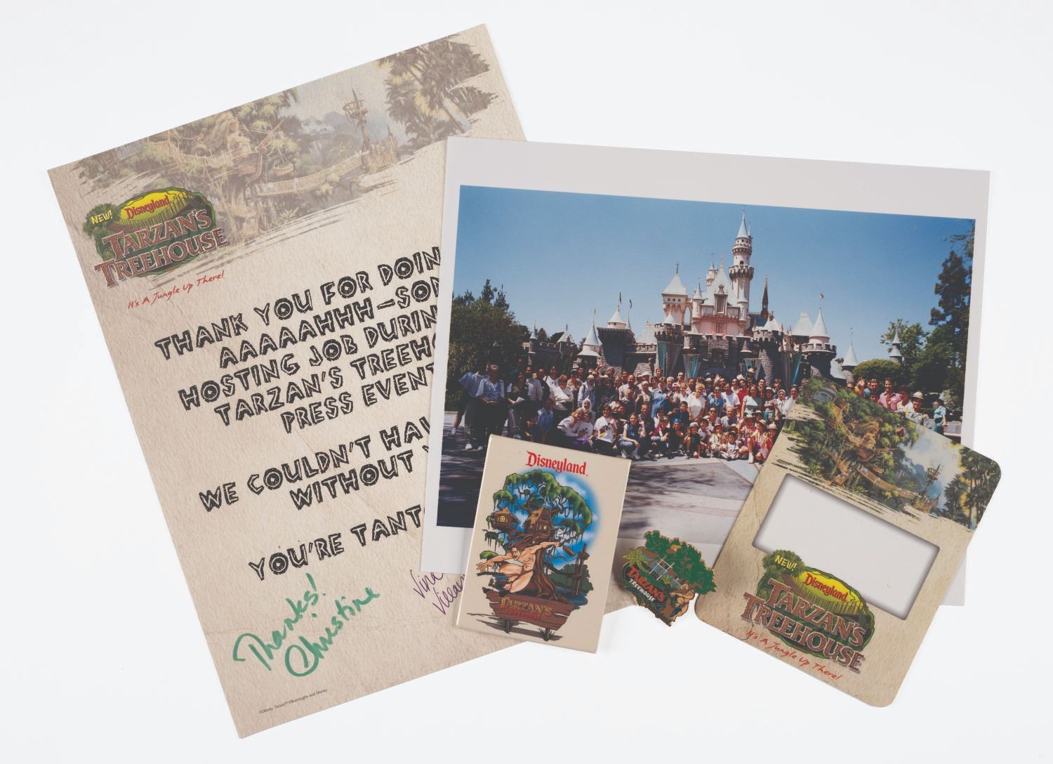 (Disneyland, 1999) A collection of items from the Press Event marking the premiere of Tarzan's Treehouse in June of 1999. Included are a complimentary admittance to Disneyland badge that was themed to the event, a photograph of a group in front of Sleeping Beauty Castle, a thank you letter to cast members who hosted the event printed on Treehouse stationery, and a button and 2002 pin themed to Tarzan's Treehouse. Measuring various sizes from 1.5"x1.5" to 8.5"x11", the items are in fine condition.