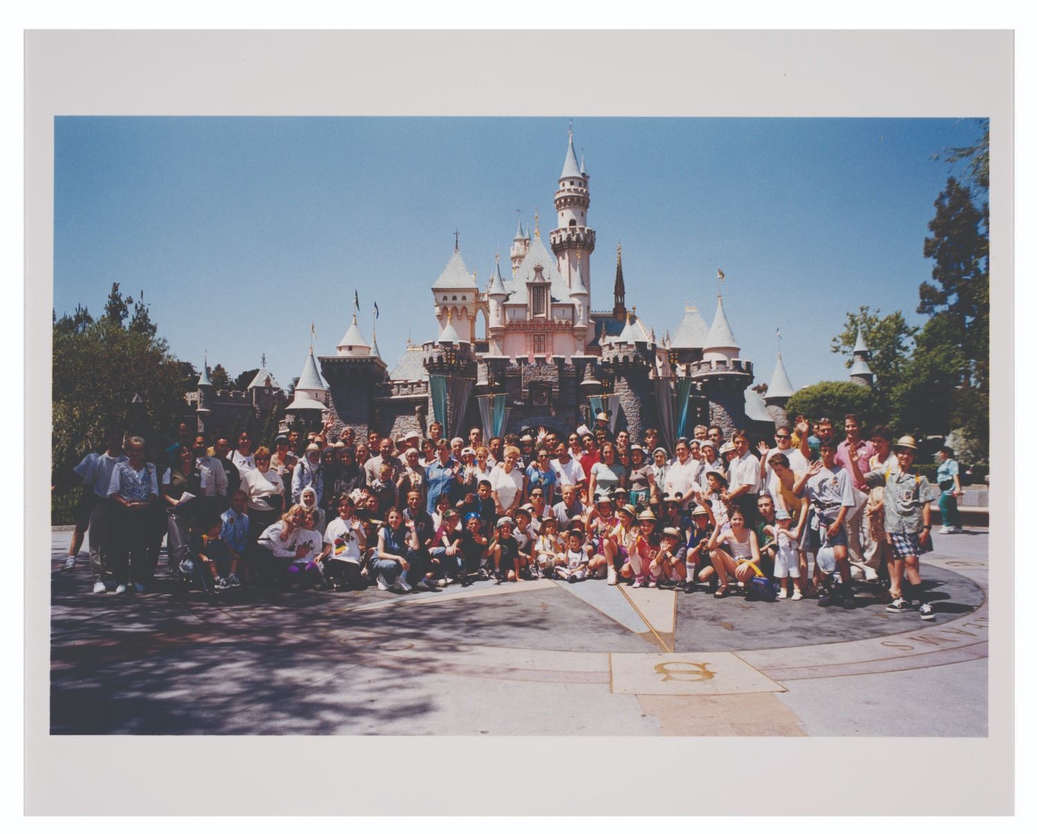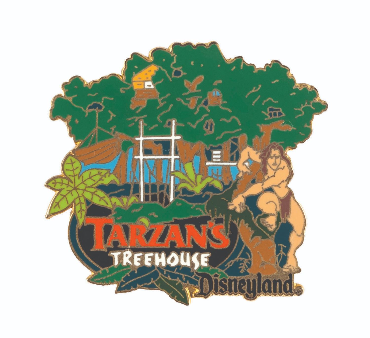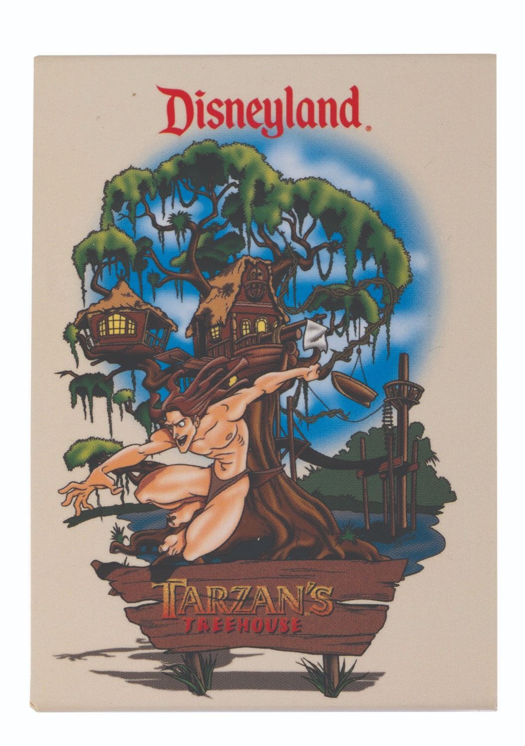 (Disneyland, 1999) A collection of items from the Press Event marking the premiere of Tarzan's Treehouse in June of 1999. Included are a complimentary admittance to Disneyland badge that was themed to the event, a photograph of a group in front of Sleeping Beauty Castle, a thank you letter to cast members who hosted the event printed on Treehouse stationery, and a button and 2002 pin themed to Tarzan's Treehouse. Measuring various sizes from 1.5"x1.5" to 8.5"x11", the items are in fine condition.