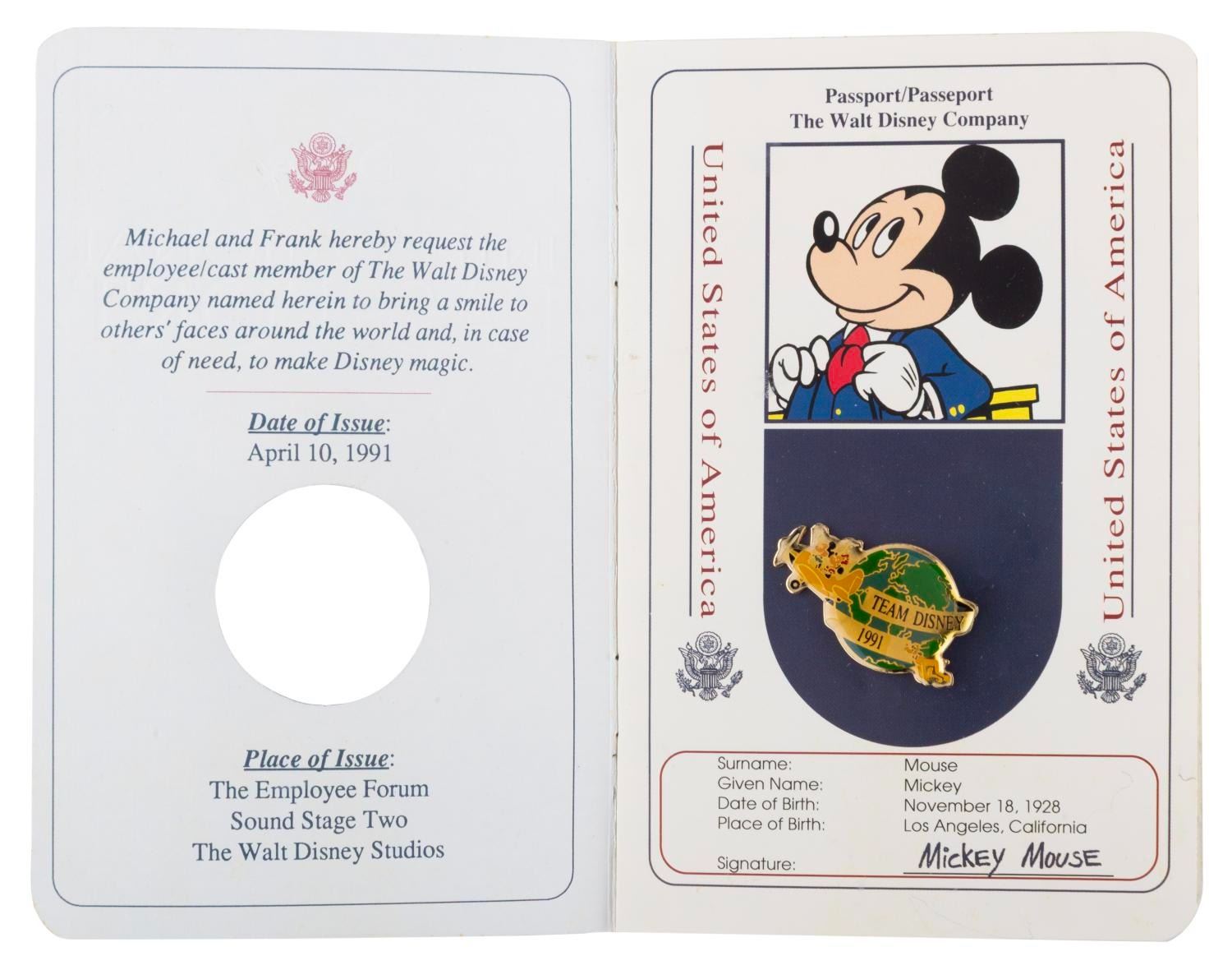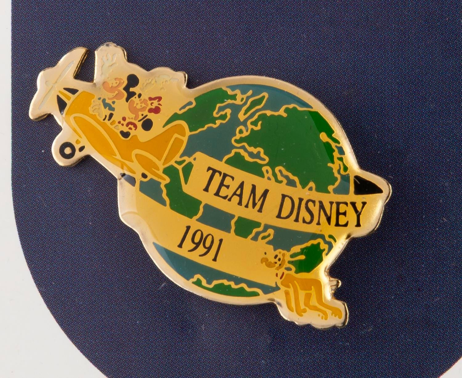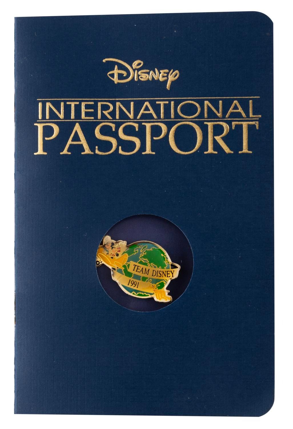 (Disney, 1991) A Disney Cast Member "Team Disney 1991" pin featuring Mickey and Minnie in a plane, within a presentation "passport." The pin is in fine condition with typical color shift from age.