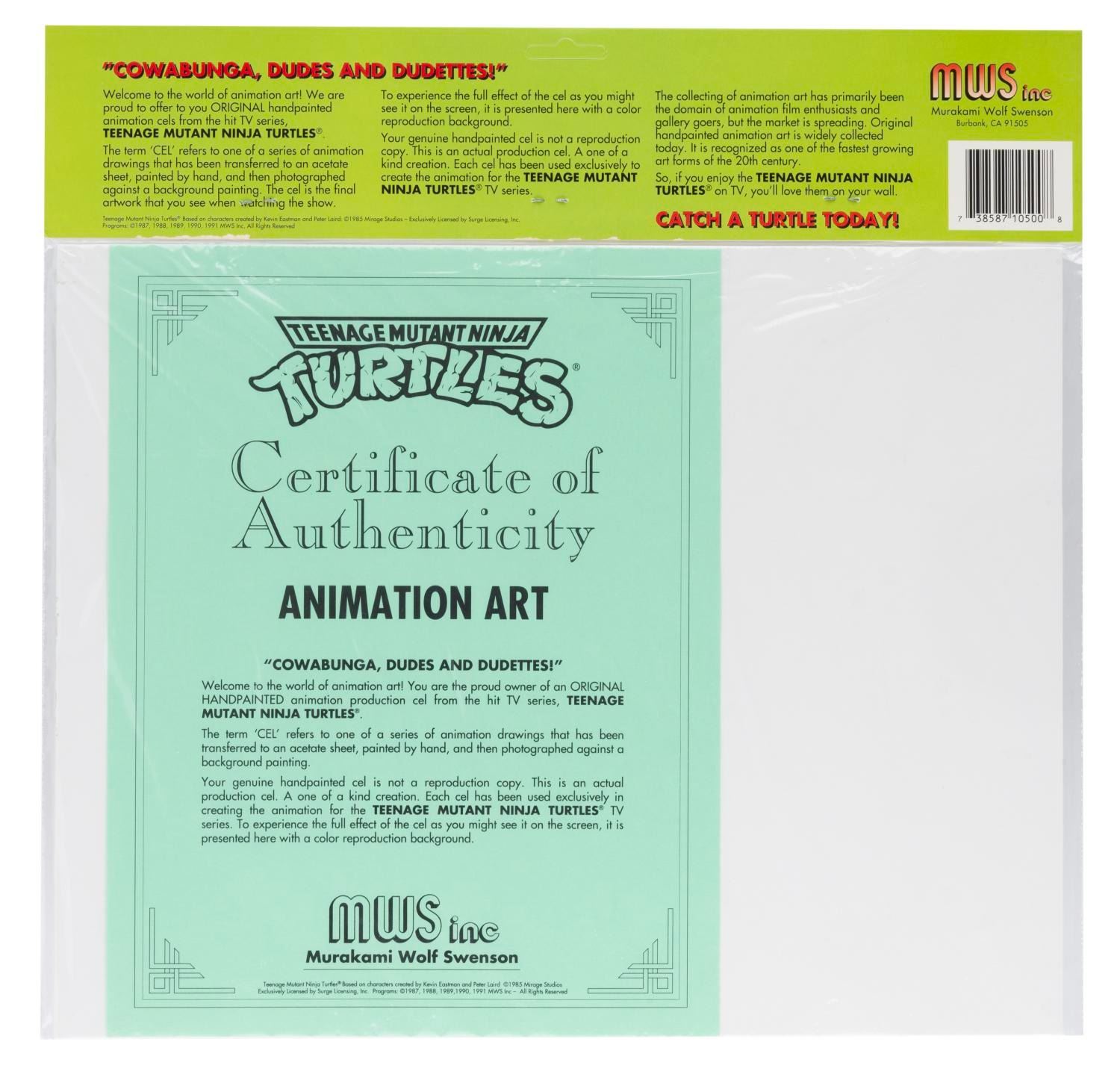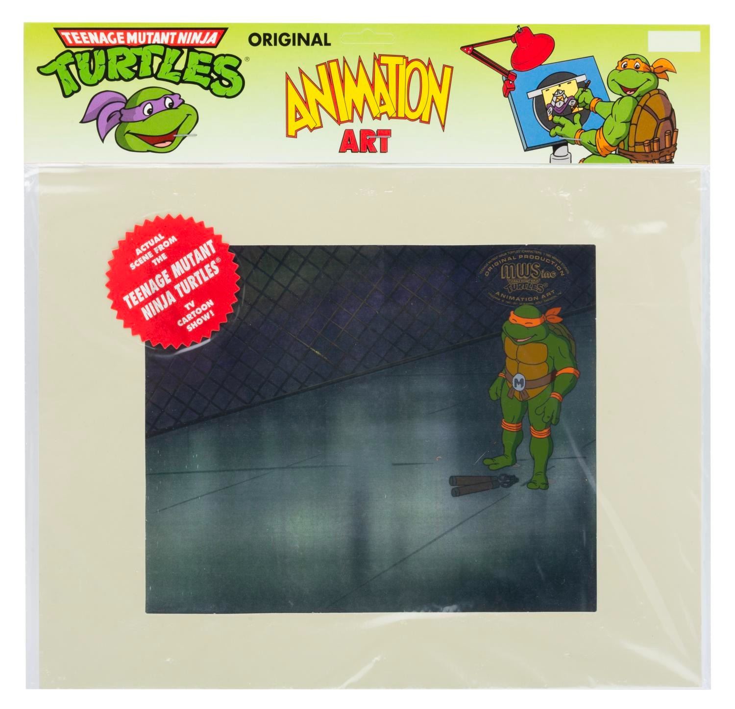 (Murakami-Wolf-Swenson, 1987-91) An original production cel of Michaelangelo from "Teenage Mutant Ninja Turtles" with a color copy background. Michaelangelo has an image size of 2.5" x 4" in an 11" x 14" matte. The cel is sealed in its original bag and is in fine condition.