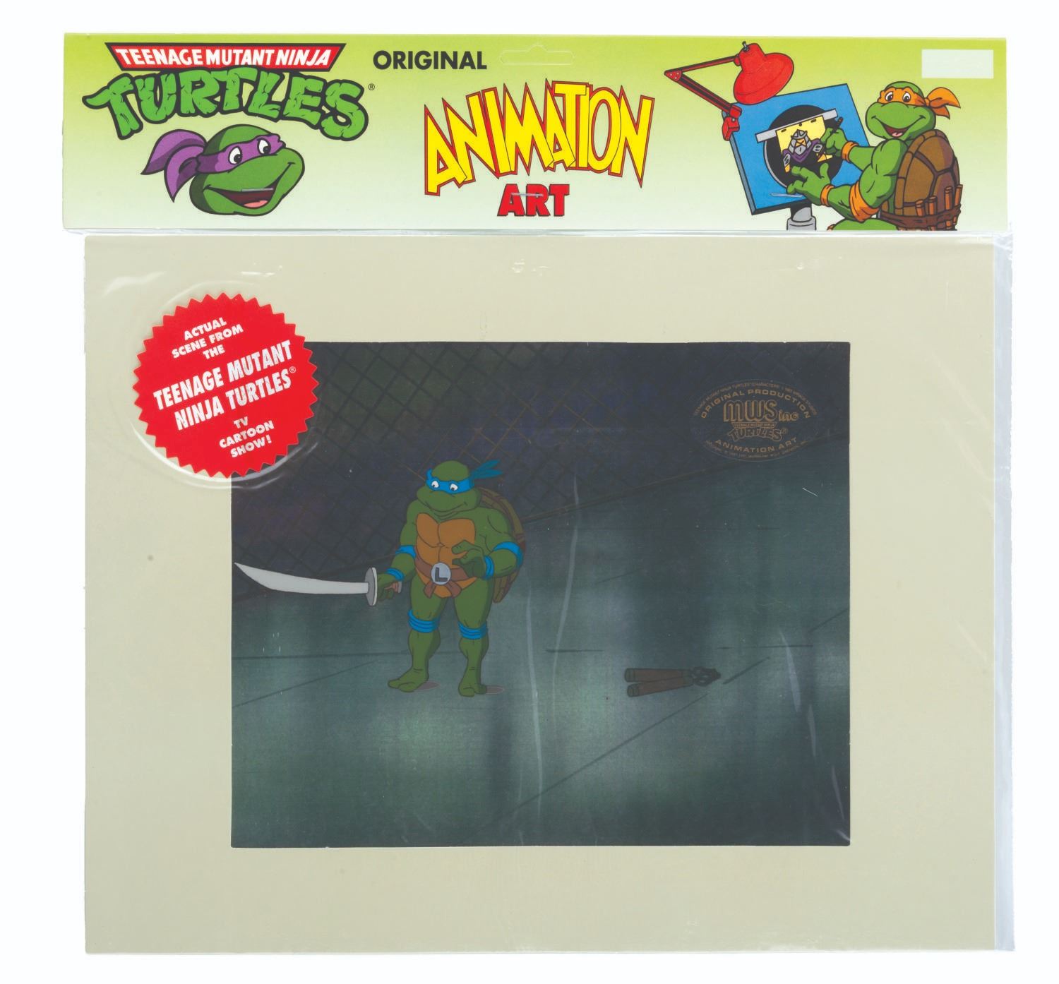(Murakami-Wolf-Swenson, 1987-91) An original production cel of Leonardo from “Teenage Mutant Ninja Turtles” with a color copy background. Leonardo has an image size of 4.75” x 6.5” in an 11” x 14” matte. The cel is sealed in its original bag and is in very good condition with light line loss.