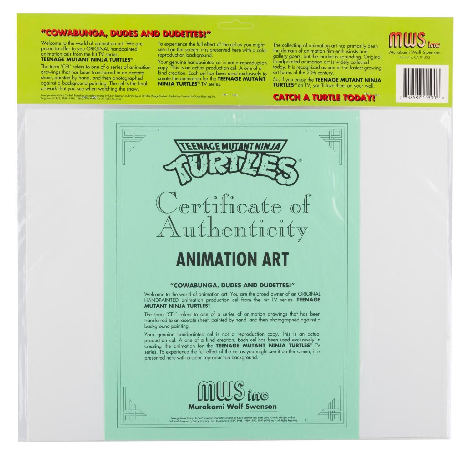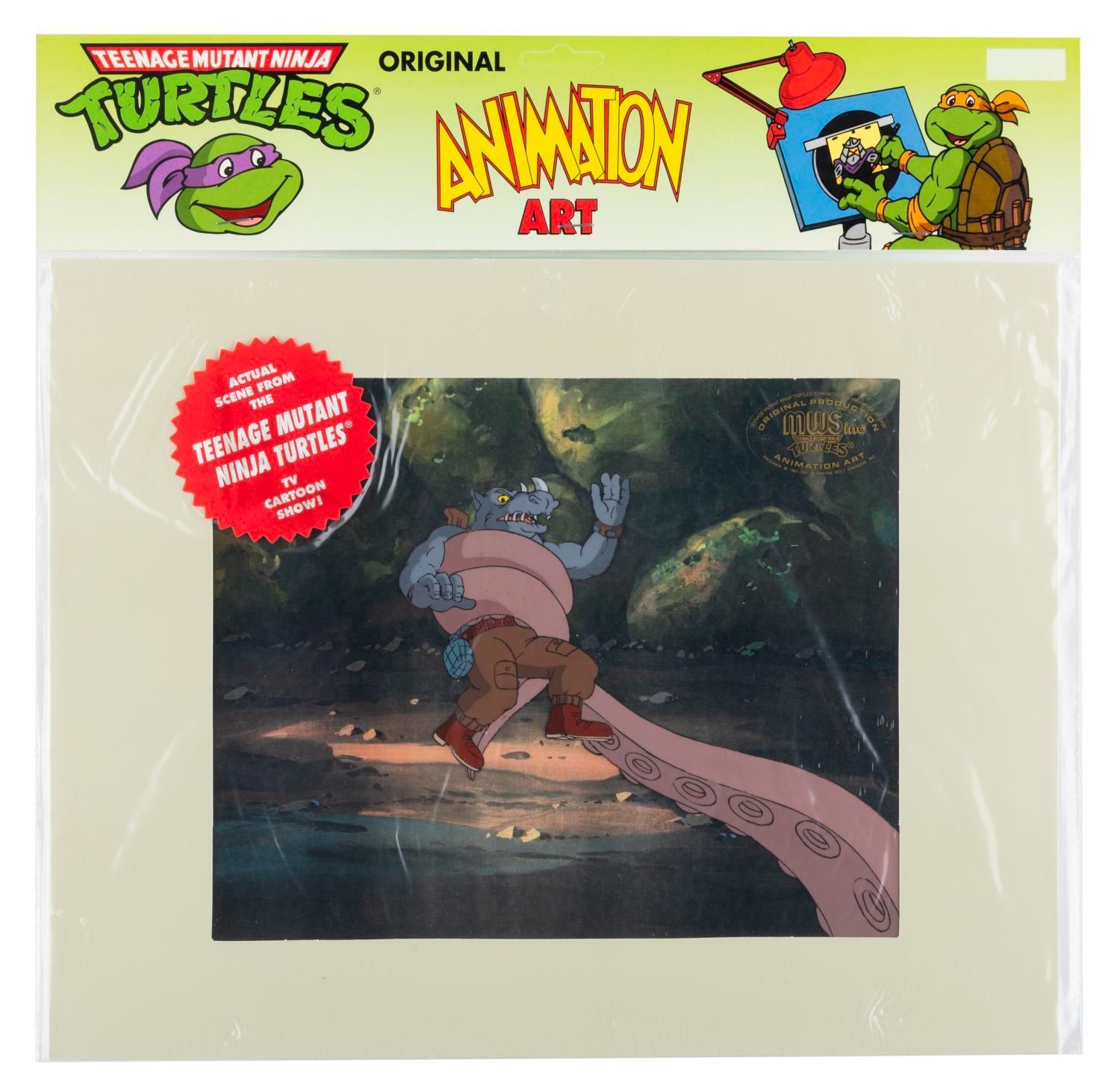 (Murakami-Wolf-Swenson, 1987-91) An original production cel of Rocksteady from “Teenage Mutant Ninja Turtles” with a color copy background. Rocksteady has an image size of 6.5” x 7” in an 11” x 14” matte. The cel is sealed in its original bag and is in good condition with light line loss and streaks, with the matte exhibiting light wear.
