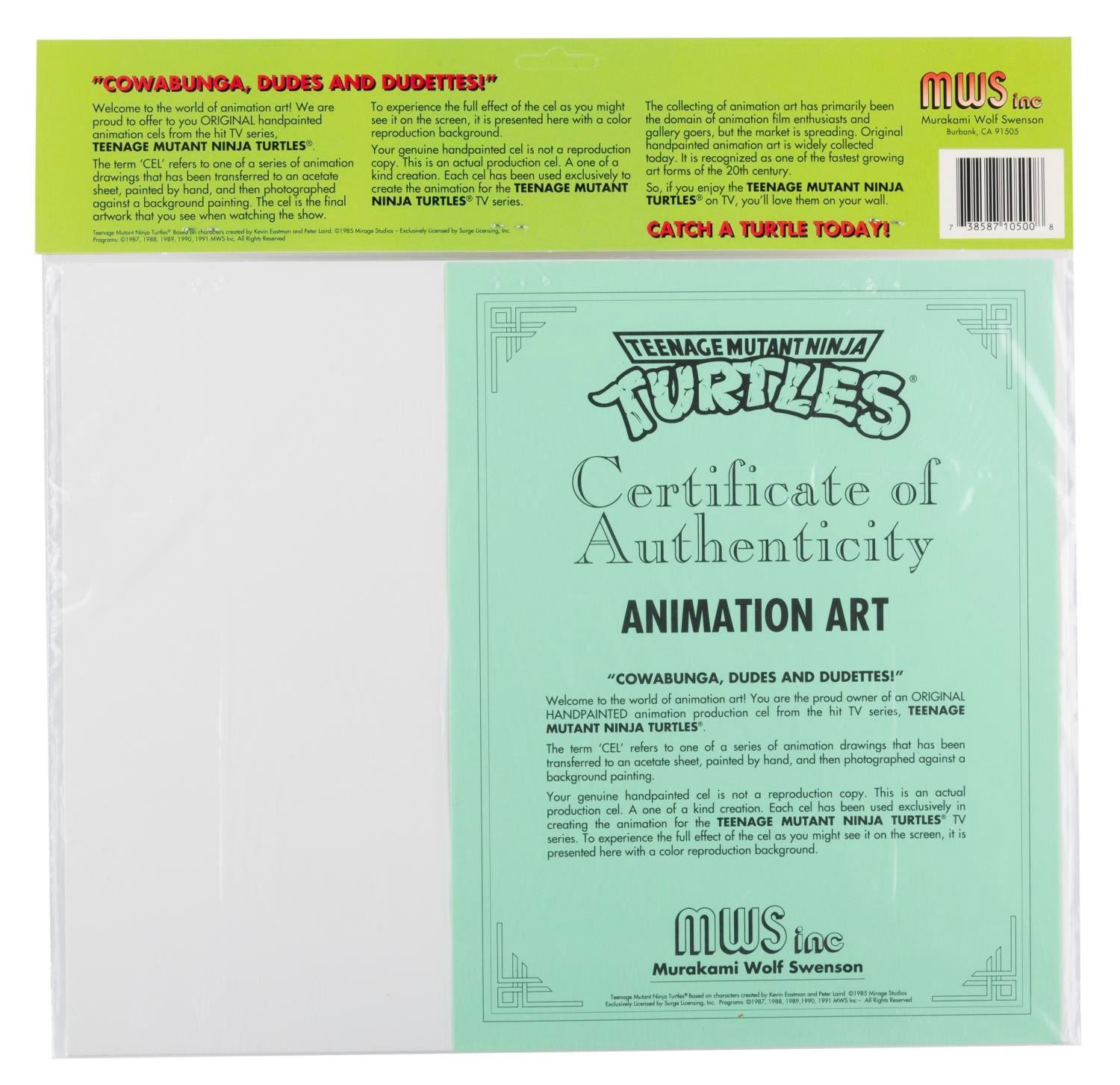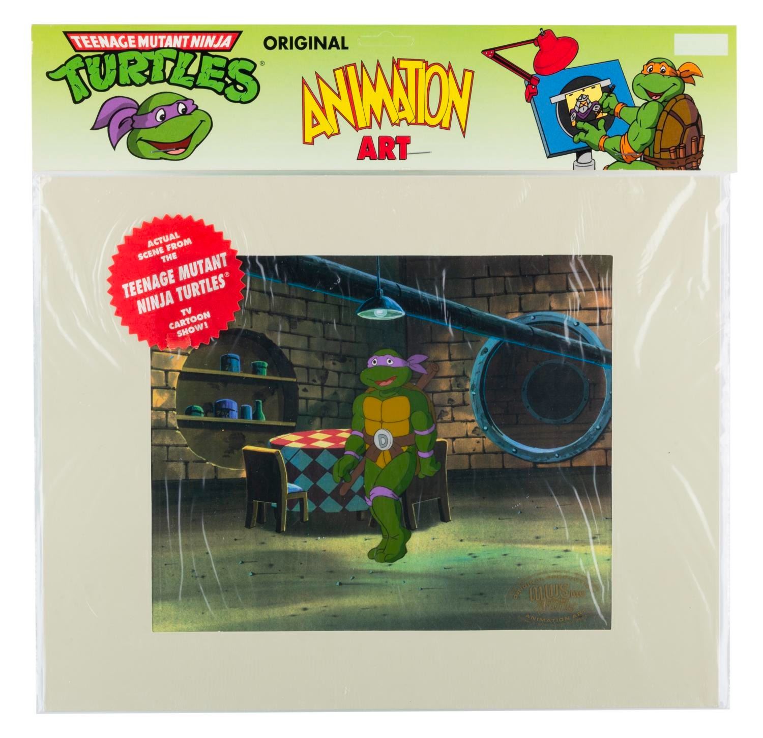 (Murakami-Wolf-Swenson, 1987-91) An original production cel of Donatello from “Teenage Mutant Ninja Turtles” with a color copy background. Donatello has an image size of 2.25” x 4.5” in an 11” x 14” matte. The cel is sealed in its original bag and displays in very good condition with light paint transfer and wear to the matte.