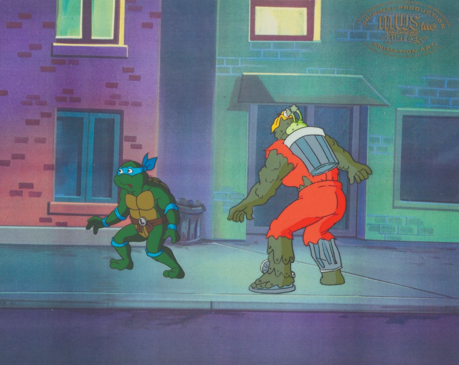 (Murakami-Wolf-Swenson, 1987-91) An original production cel of Leonardo with Garson Grunge, aka Muckman, from "Teenage Mutant Ninja Turtles" with a color copy background. The cel has an image size of 6" x 3.75" in an 11" x 14" matte. The cel is in very good condition with very slight line loss.