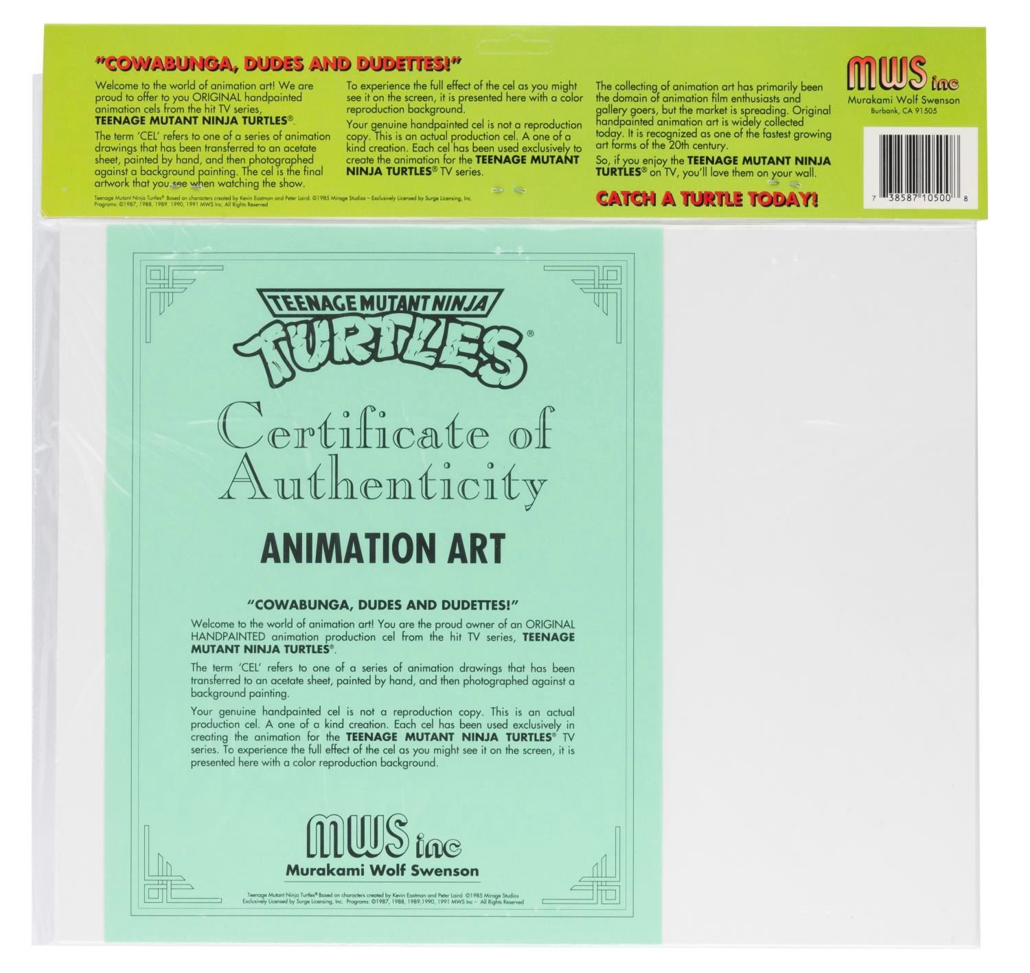 (Murakami-Wolf-Swenson, 1987-91) An original production cel of Raphael from "Teenage Mutant Ninja Turtles" with a color copy background. Raphael has an image size of 5.5" x 5.5" in an 11" x 14" matte. The cel is sealed in its original bag and is in fine condition.