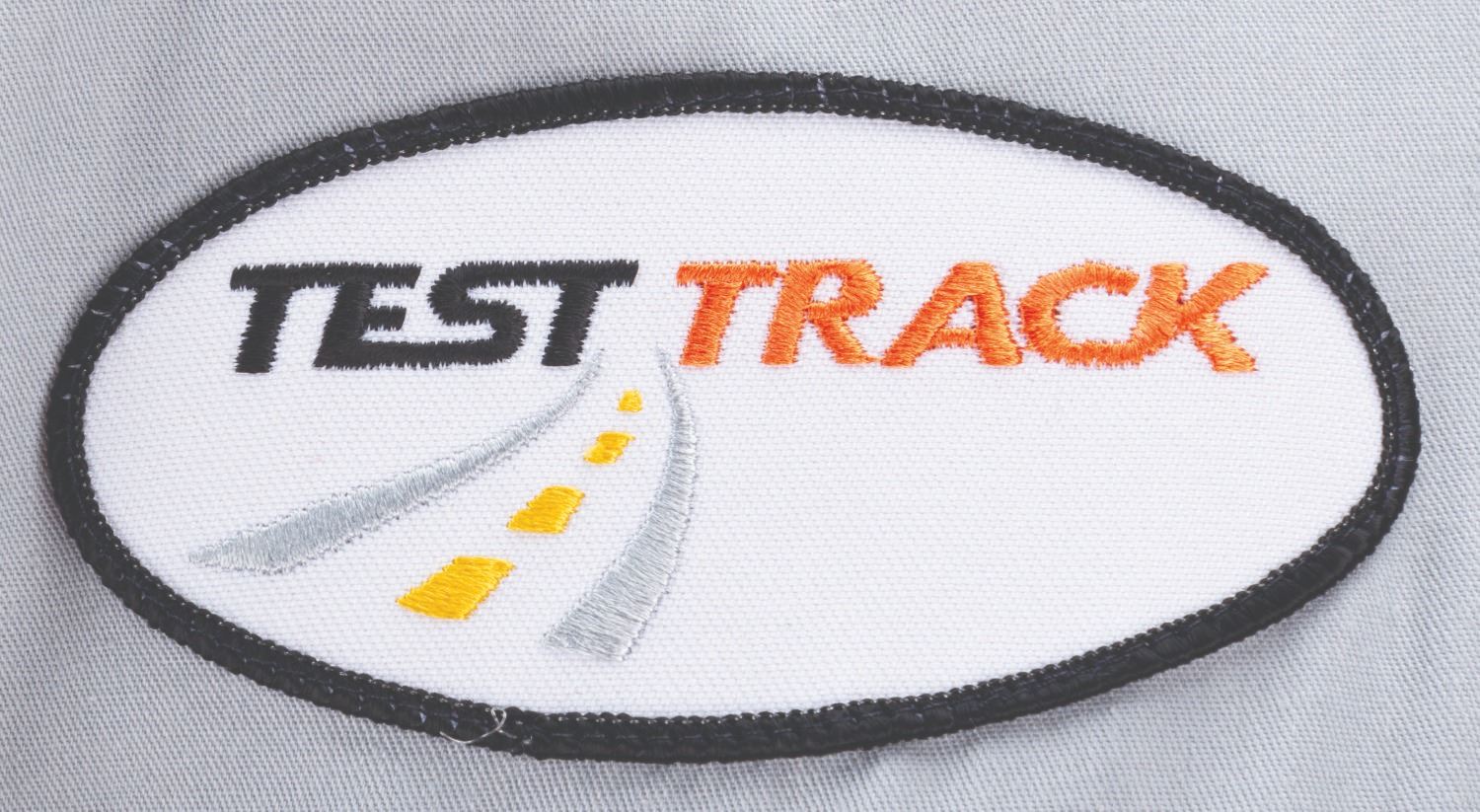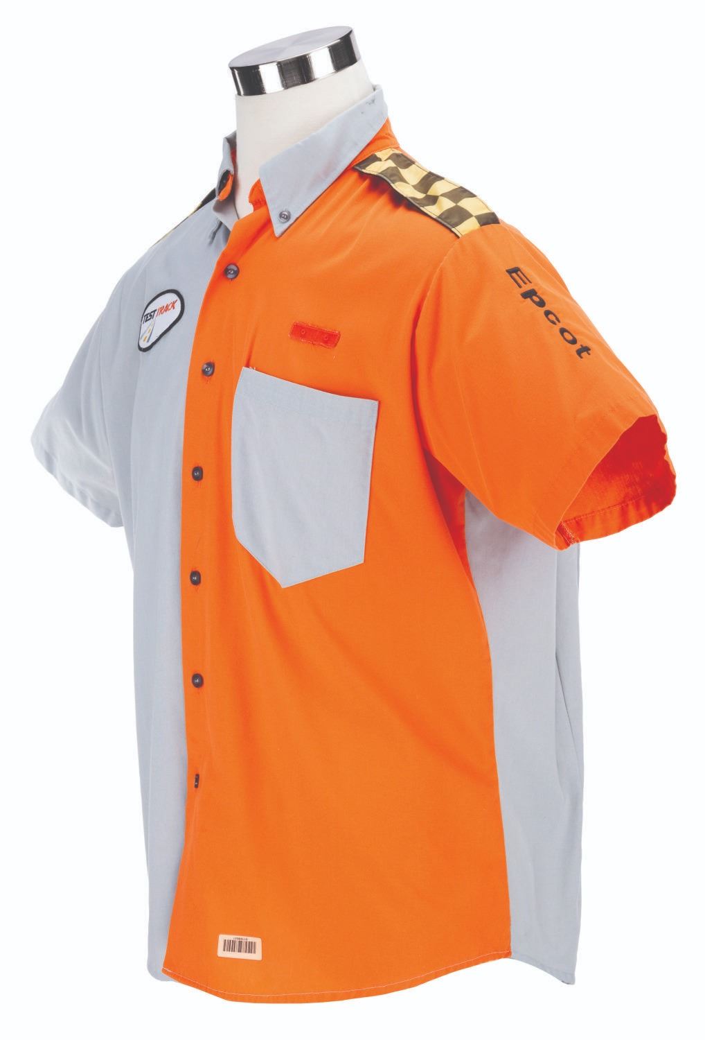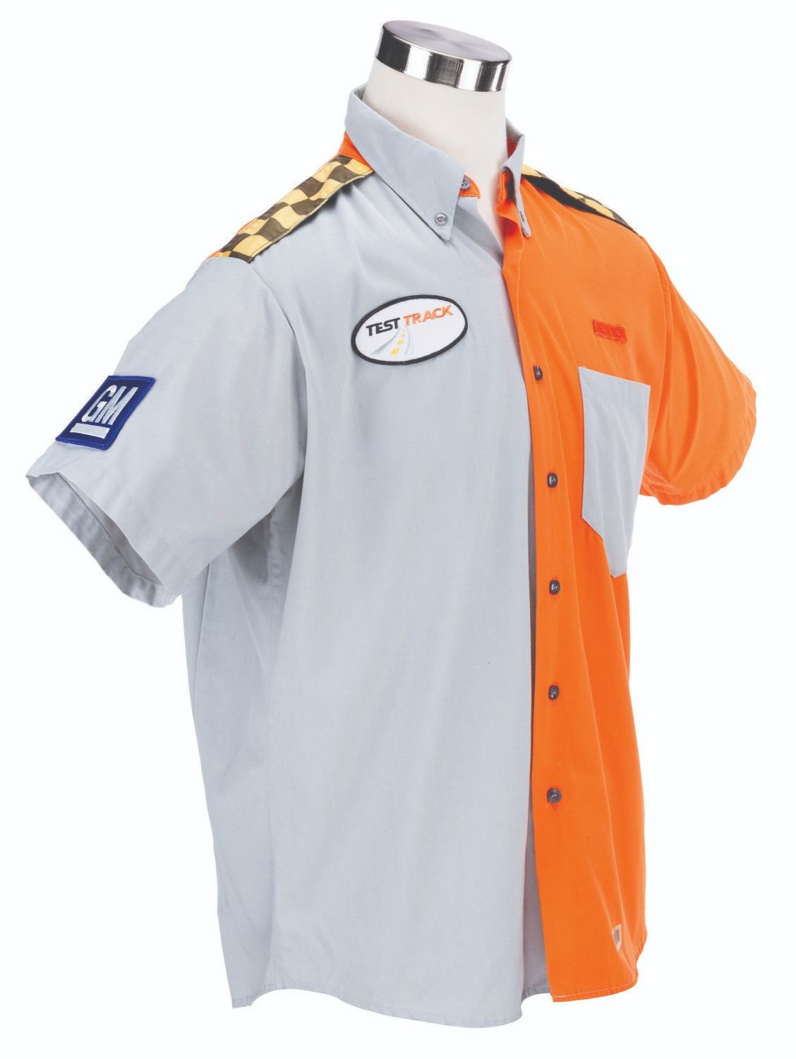 (Epcot, 1999-2012) A button-down costume shirt worn by Cast Members working Test Track in Future World, featuring the embroidered logo of the attraction's sponsor at the time, GM. Labeled a size L, the shirt is in very good condition with stains from use and light discoloration from age.