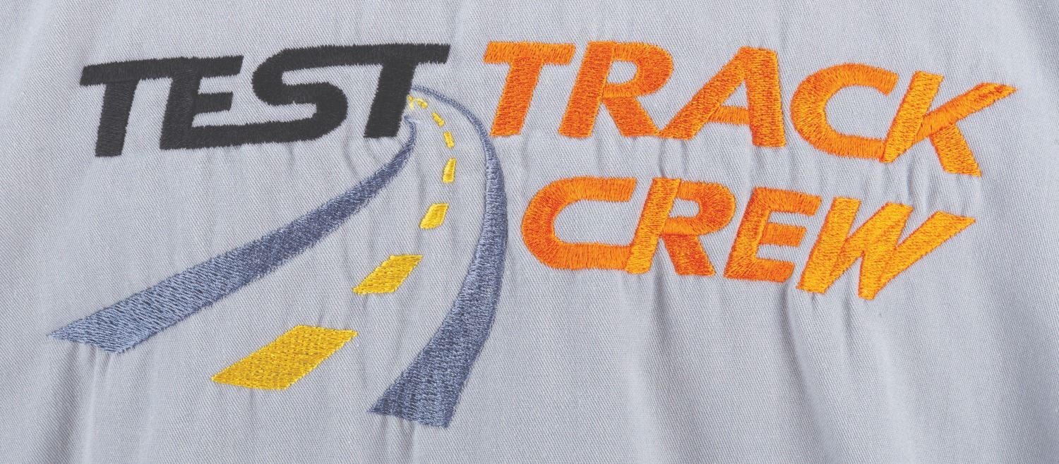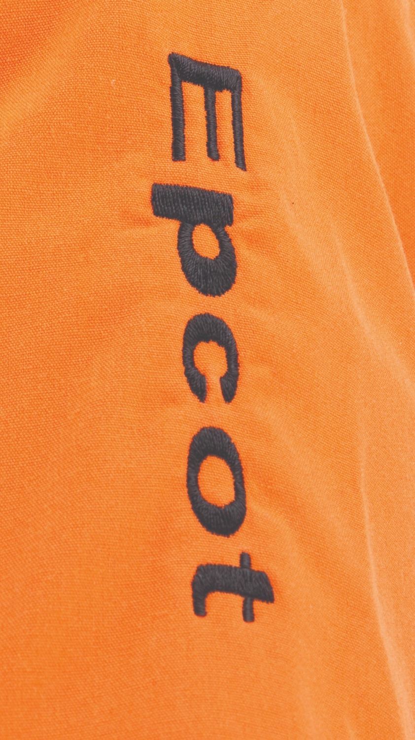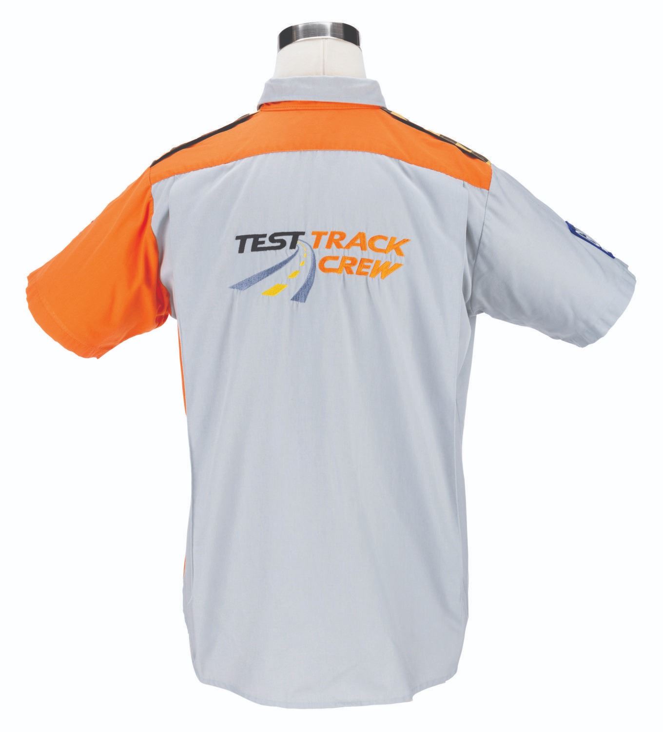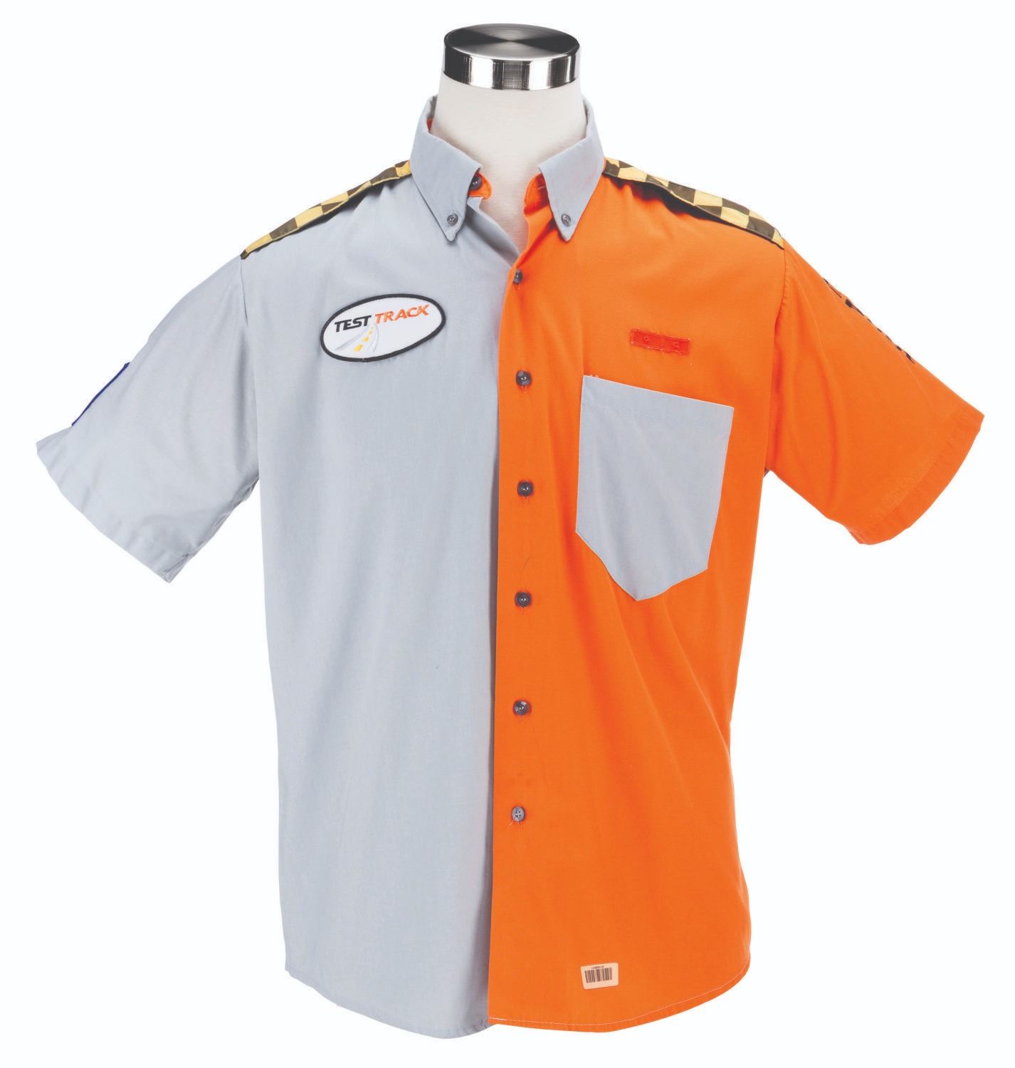 (Epcot, 1999-2012) A button-down costume shirt worn by Cast Members working Test Track in Future World, featuring the embroidered logo of the attraction's sponsor at the time, GM. Labeled a size L, the shirt is in very good condition with stains from use and light discoloration from age.