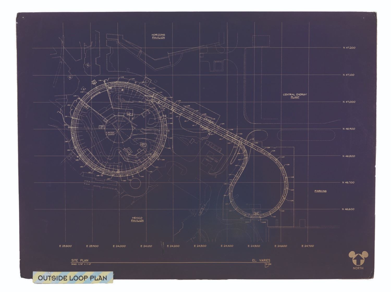 (Epcot, 1996-99) A print of the Test Track Outside Loop site blueprint, displayed at the Test Track Preview Area in Epcot. The plan indicates where the loop will fit between the Mexico Pavilion and Central Energy Plant. Measuring 31.25" x 41.5" and mounted to foamcore, the print displays in good condition with heavy edge wear and creasing, pinholes and velcro on the reverse from Park use, and discoloration from age.