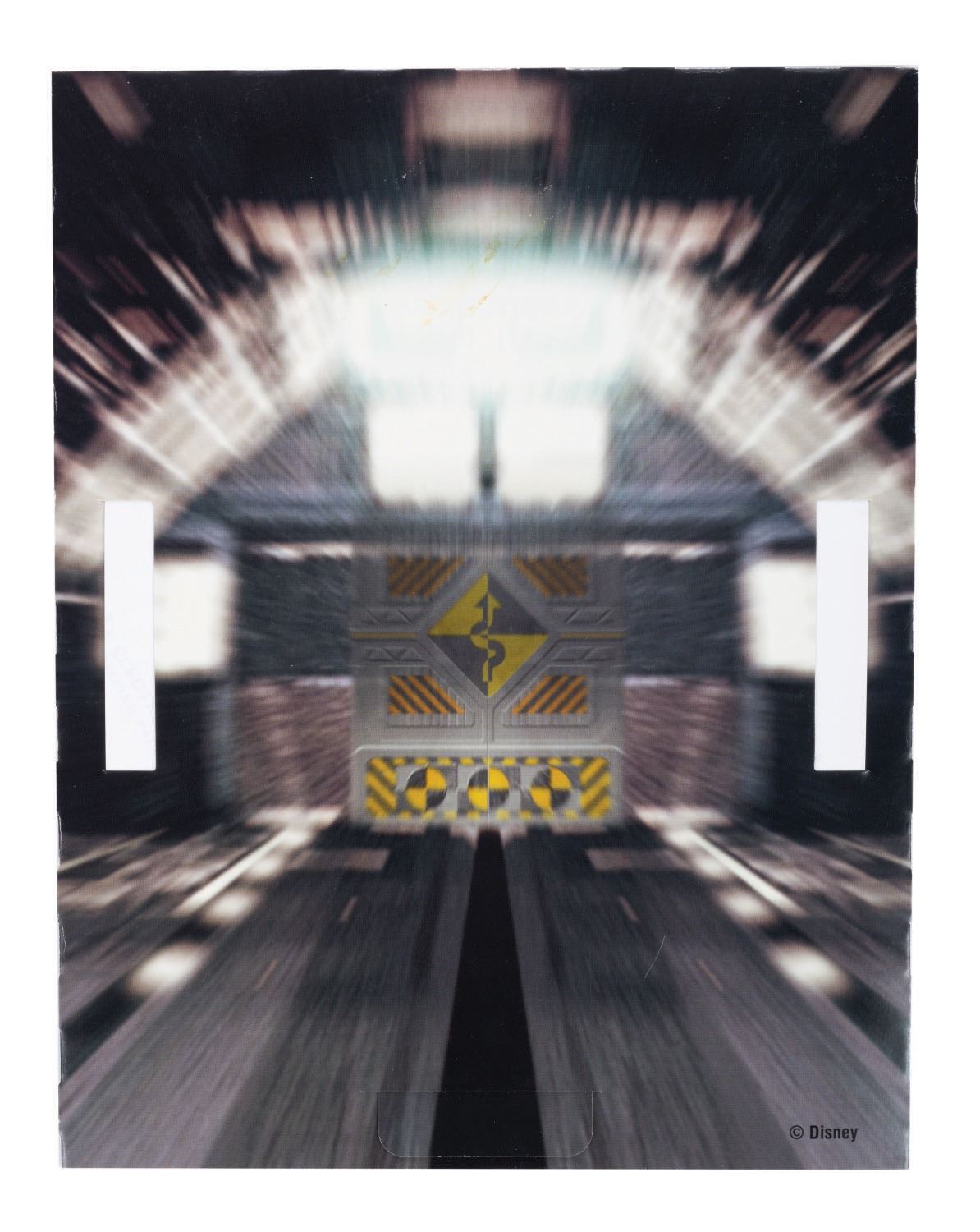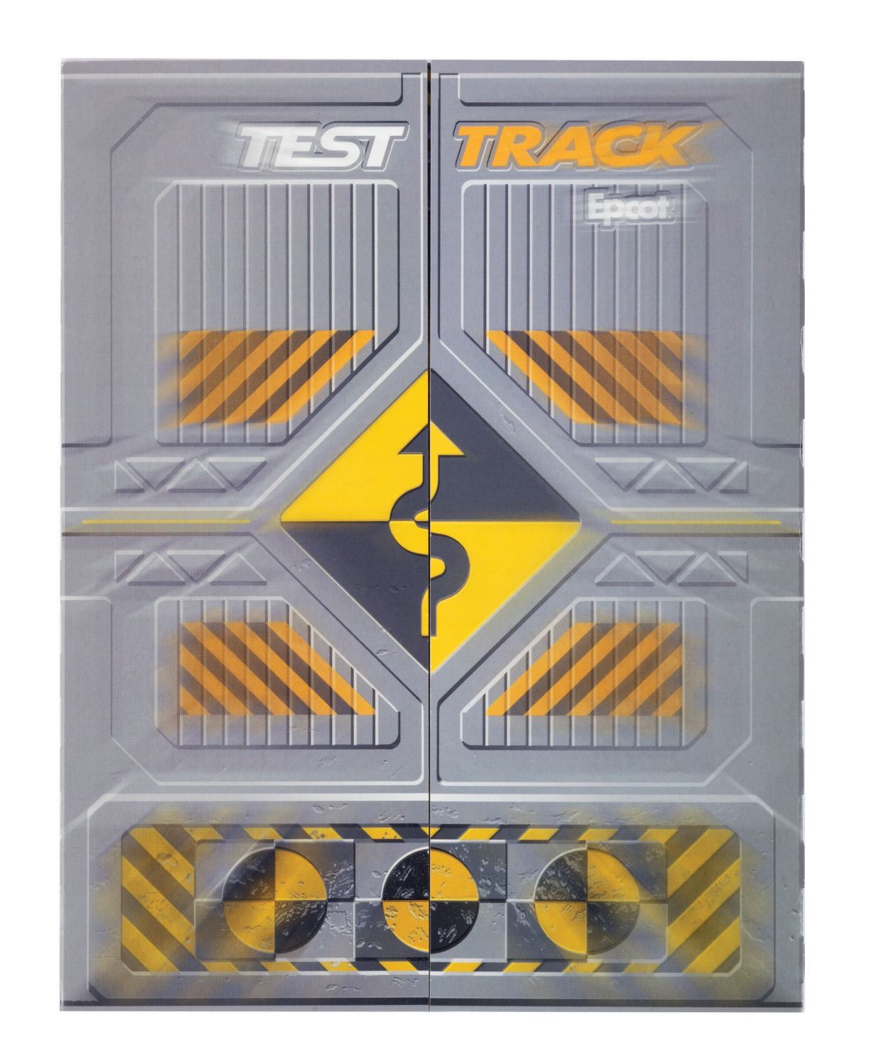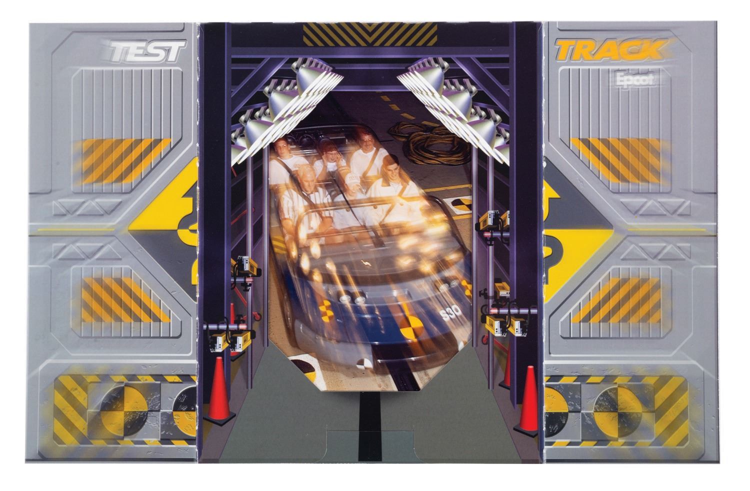 (EPCOT, 1998) A souvenir photo and holder from Test Track in the World Discovery area of EPCOT. The time stamped photo depicts guests experiencing the high octane attraction in 1998. The photo measures 8.5"x7", while the holder is 8"x10.25", each piece in fine condition, despite a slight scratch in the photo, a product of printing.