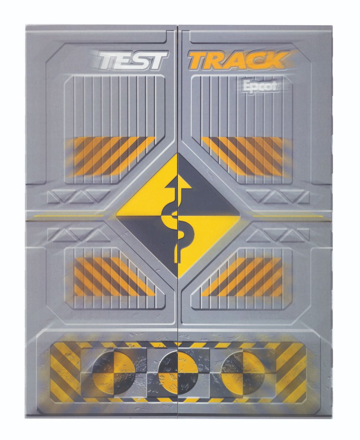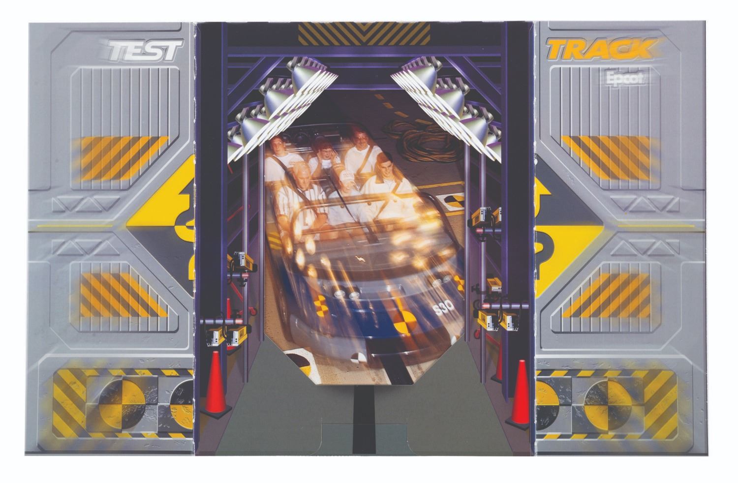 (EPCOT, 1998) A souvenir photo and holder from Test Track in the World Discovery area of EPCOT. The time-stamped photo depicts Guests experiencing the high-octane attraction in 1998. The photo measures 8.5" x 7", and the holder 8" x 10.25", each piece in fine condition, with a slight scratch in the photo from the original printing.