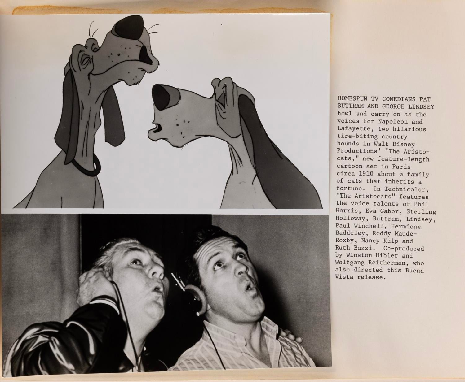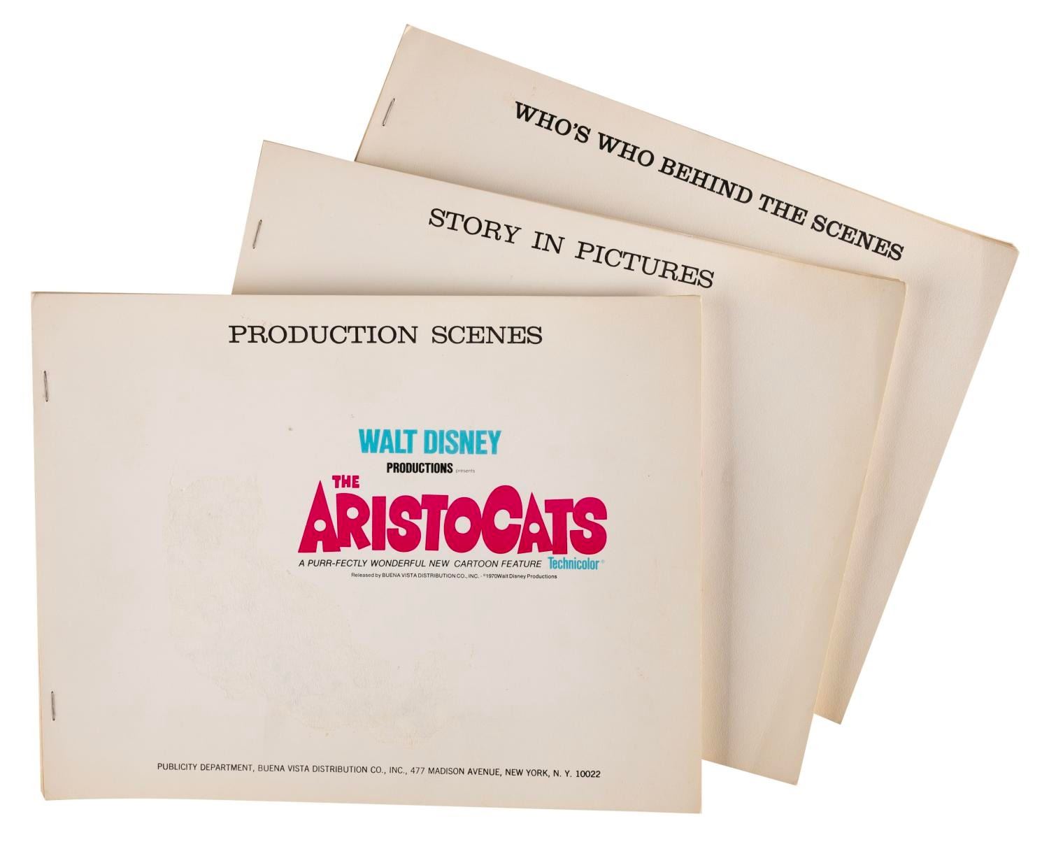 (Disney, 1970) A collection of promotional booklets for Disney's "The Aristocats." Included are a Production Scenes, a Who's Who Behind the Scenes and a Story in Pictures booklet. An overview of the film's story is outlined in 12 pages each, with a glossy publicity photo glued beside a caption. Measuring 8.5” x 11”, the booklets are overall in good condition, with the photos unglued from their pages from age. The “Production Scenes” book is in fair condition with the vinyl applique character removed from the front cover.